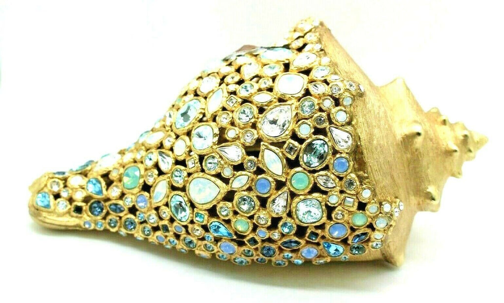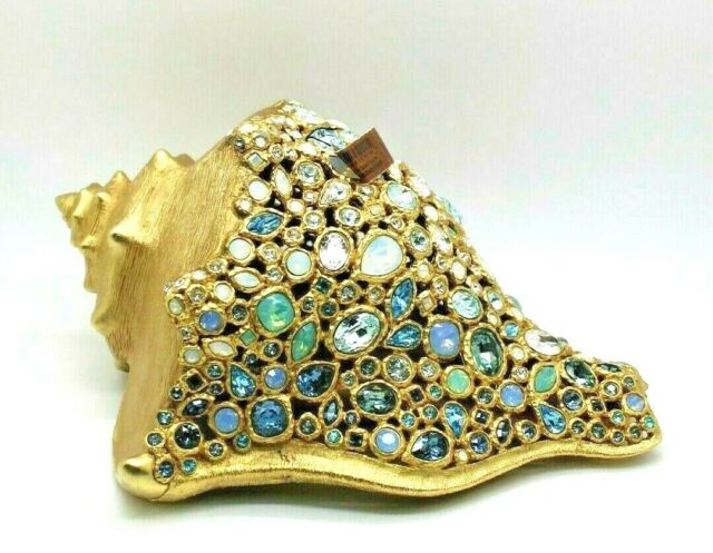 Luminous crystal stones from Swarovski, individually hand-set, are tightly fitted together on the golden metal conch shell. The spiraling top shines with a 14K matte gold finish, and the body of the shell sparkles in shades of white opal, aquamarine, and light azure. Rest the Geneva Conch Shell Figurine alone dramatically on a table or display it elegantly among frames and boxes. Hold it to your ear inches inchesyou can almost hear the roar of the ocean. Crafted by our artisans in Rhode Island.