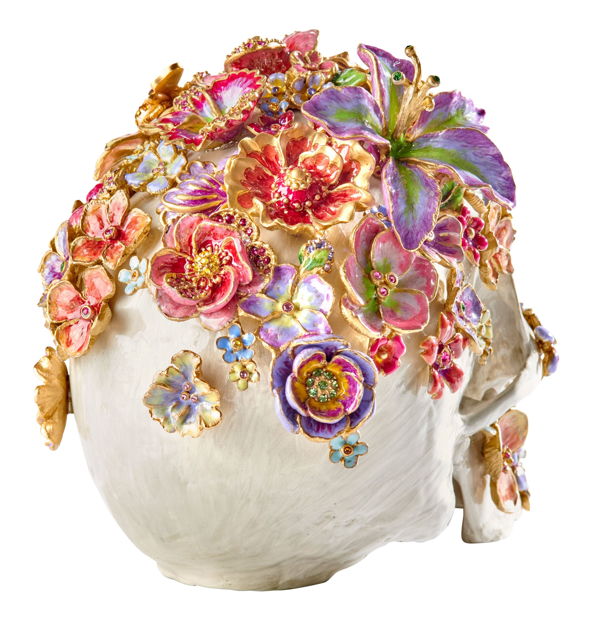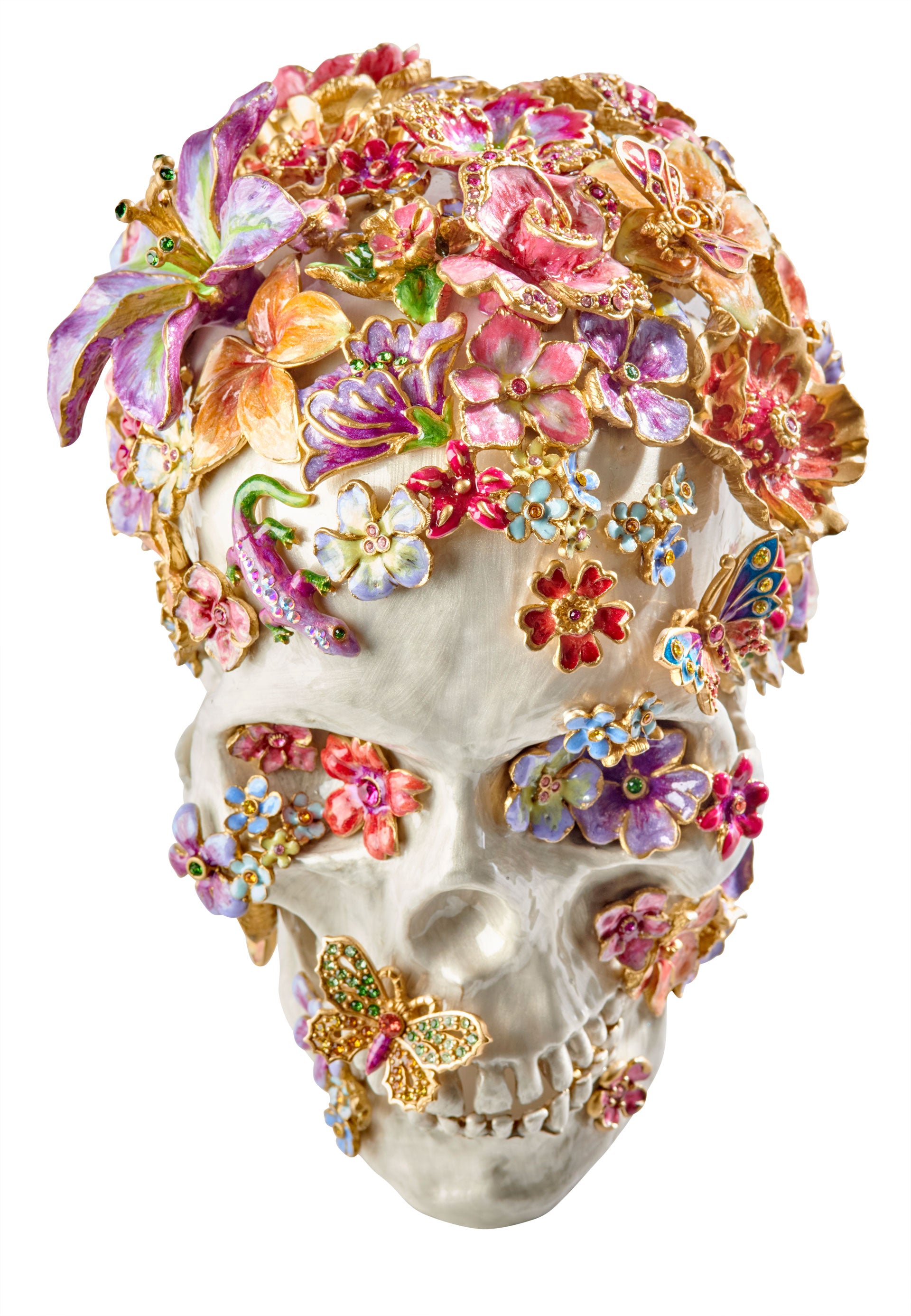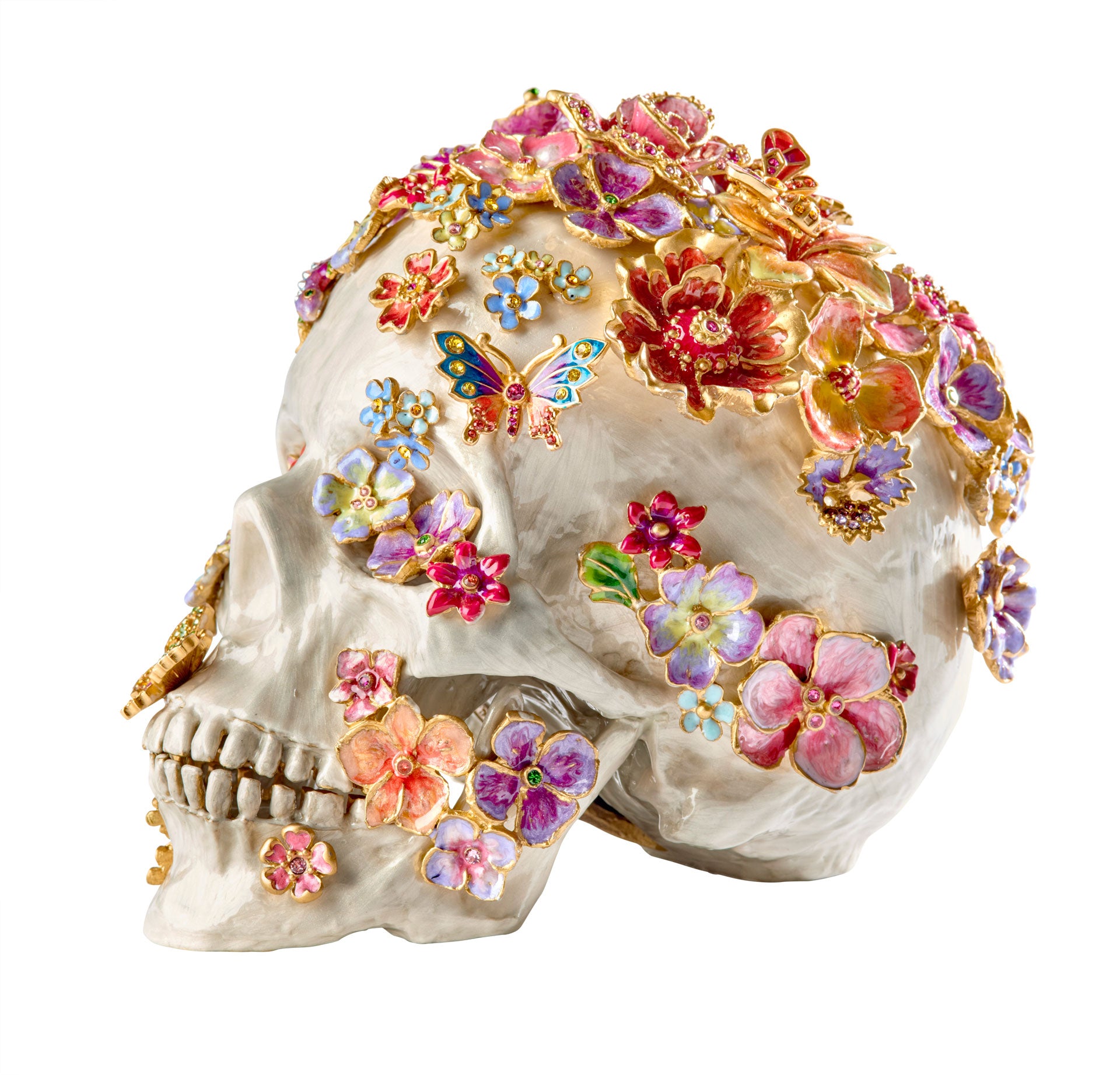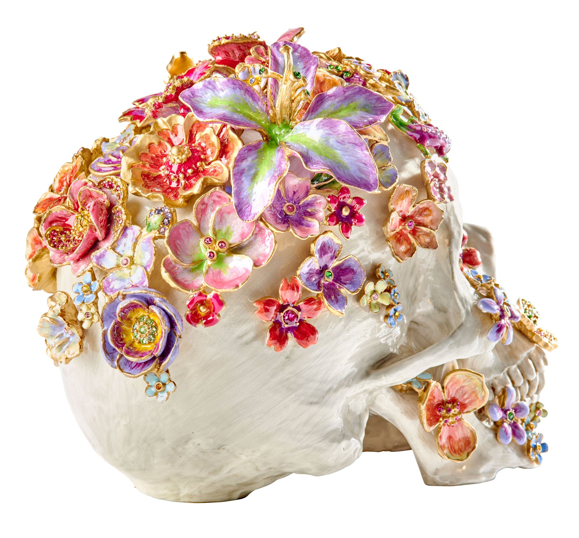 Inspired by the great heritage of Mexican Sugar skulls, we first carved our Oliver Skull with Roses in clay with a raised all over floral pattern highlighted with lush jeweled flowers. The skull is cast in 14 individual pewter sections, and soldered together from the Jay Strongwater Rhode Island workshop. Beautifully painted in 17 colors of enamel by our finest artisans in Rhode Island and sparkling with hundreds of hand-set Swarovski crystals in shades of fuchsia, rose and peach.