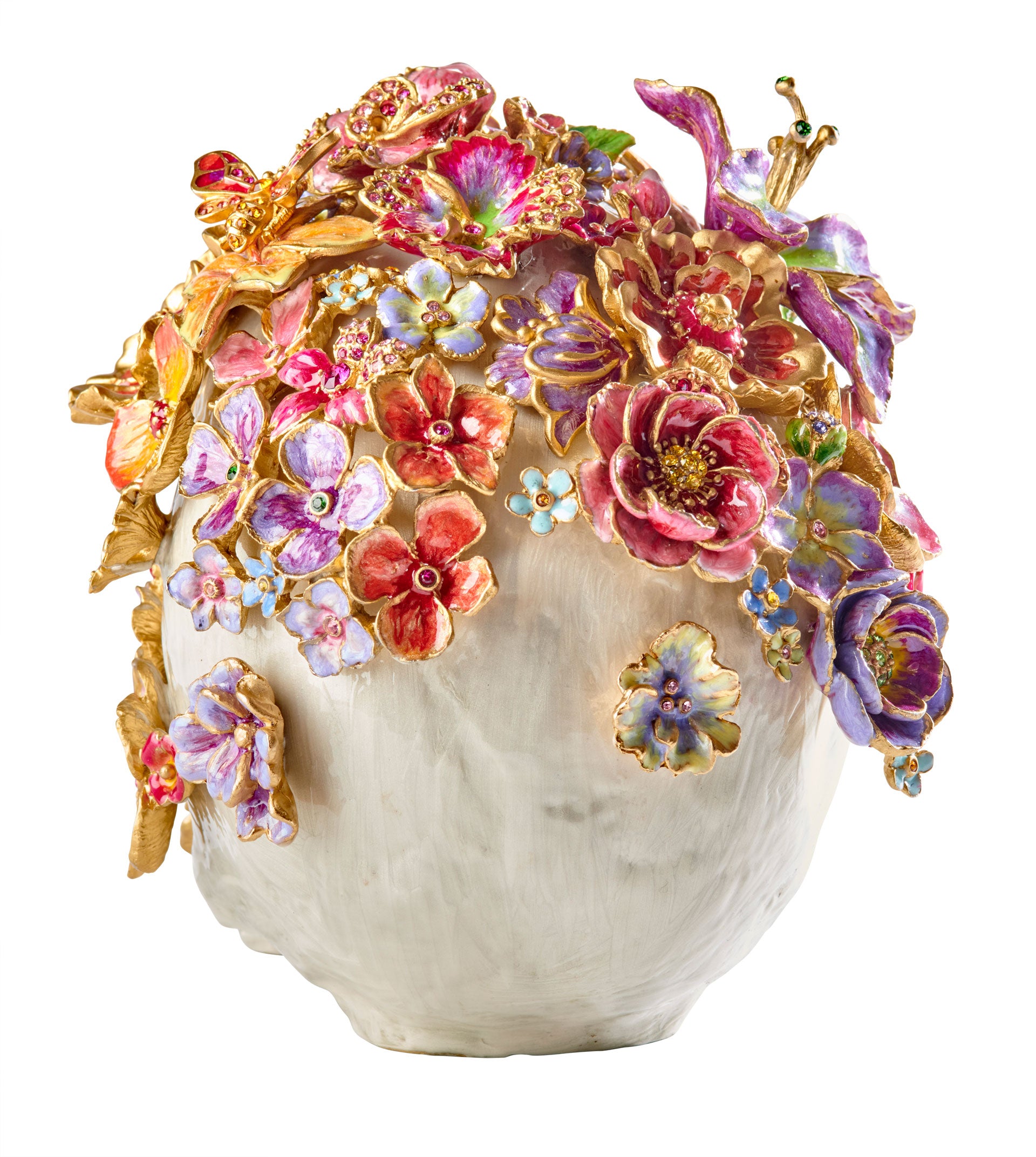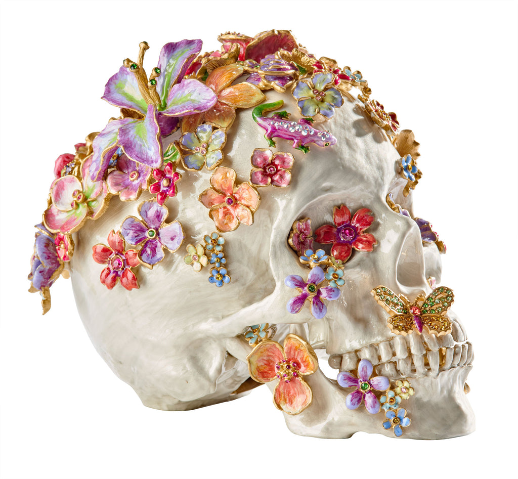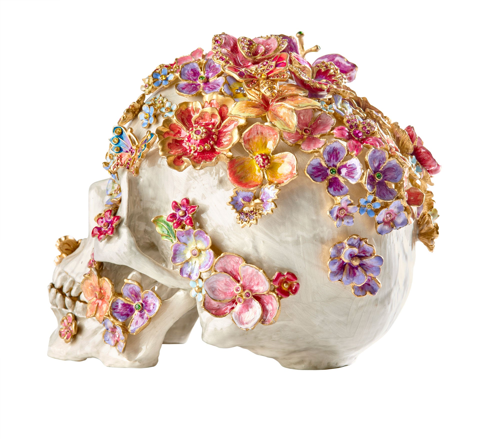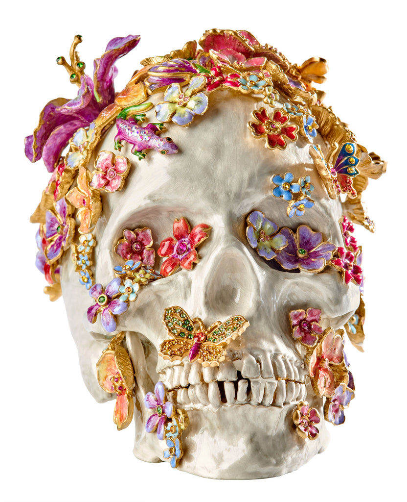 Inspired by the great heritage of Mexican Sugar skulls, we first carved our Oliver Skull with Roses in clay with a raised all over floral pattern highlighted with lush jeweled flowers. The skull is cast in 14 individual pewter sections, and soldered together from the Jay Strongwater Rhode Island workshop. Beautifully painted in 17 colors of enamel by our finest artisans in Rhode Island and sparkling with hundreds of hand-set Swarovski crystals in shades of fuchsia, rose and peach.