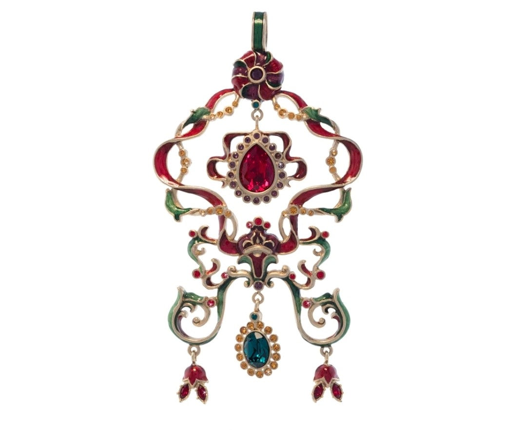 Traditional elegance, modern luxury and signature Jay Strongwater flair combine in this stunning 2022 Annual Holiday Ornament. This bejeweled chandelier features delicate 14K gold filigree inlaid with sparkling Swarovski® crystals, anchored by two dangling center stones in classic holiday hues of ruby red and emerald green.