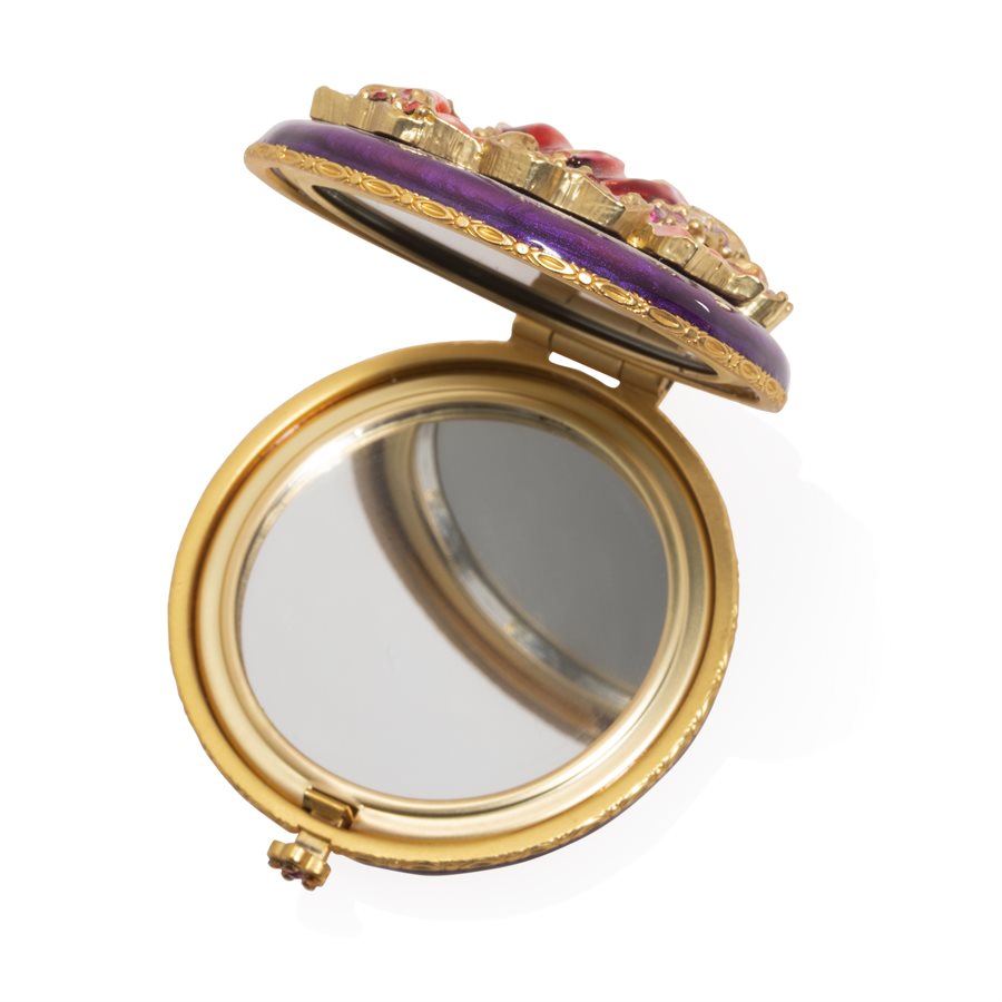 Brass with a 14K gold finish, hand-enameled and hand-set with Swarovski crystals. Two interior mirrors ‚¬š ¬ €š ¬œ regular and magnified.