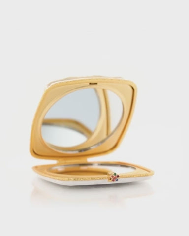 Zinc design on a brass compact with 14K matte gold, light brown antique. Hand painted with epoxy and hand-set with Preciosa stones.