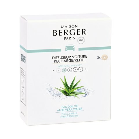 Aloe Water Car Diffuser Refills are constructed around the purity of aloe vera for a fresh, light aroma. This feminine fragrance reveals a soft, floral heart of lotus accented by a few notes of aquatic lily of the valley. White musk brings elegance to the composition, which finishes on a soft woodsy veil of sandalwood. Aloe vera is associated with beauty and longevity in Egyptian culture; why not explore its benefits for yourself? Enjoy an aromatic crystalline scent on every car ride.Fragrance strength of 2 out of 5. Compatible with all Maison Berger Paris car diffusers. The diffusion time of a ceramic refill is approximately 4 weeks. Set of 2 Aloe Vera Water Car Diffuser ceramic disk USAGE TIPS The diffuser must be clipped to your vehicle's air vent. For a more intense fragrance: put your conditioning on! , Reference 006649 Regulatory Information May produce an allergic reaction. Duration +/- 4 weeks