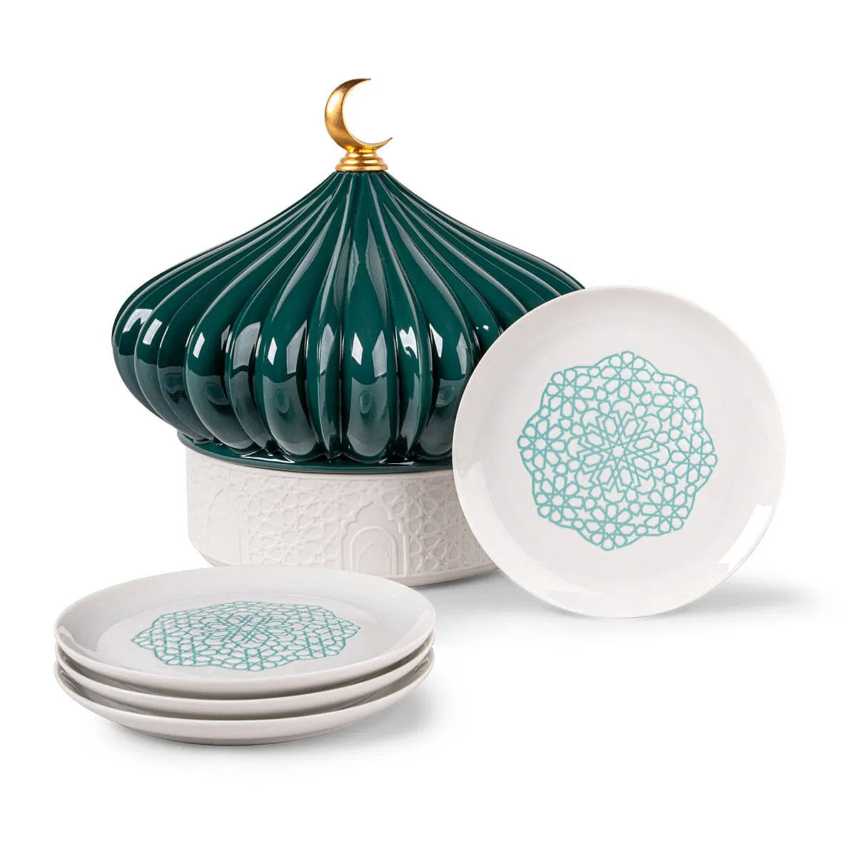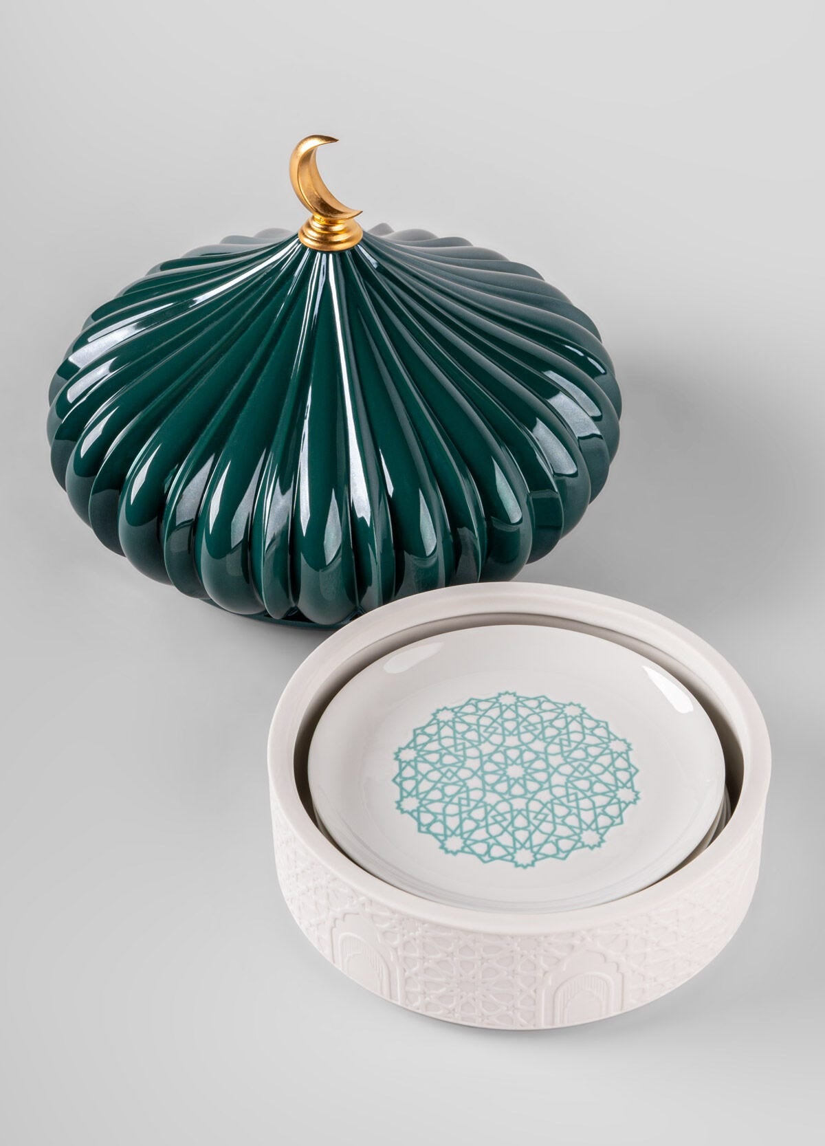 Matte white porcelain box decorated with a characteristic latticework relief, with a dome-shaped lid decorated in deep green and crowned by a crescent moon in golden luster. It contains four porcelain plates with a geometric design in the center, decorated in the tones used for the domes. The box is part of the Majestic Nights collection, which captures the spirit of the Thousand and One Nights, the charm and mystery of an age-old culture, of refined, delicate and magical art. The taste for geometric decoration and painstaking ornamentation is the source of inspiration for a collection conceived for celebrations around the table or to create a warm, welcoming atmosphere with its play of lights and scents. gives us.