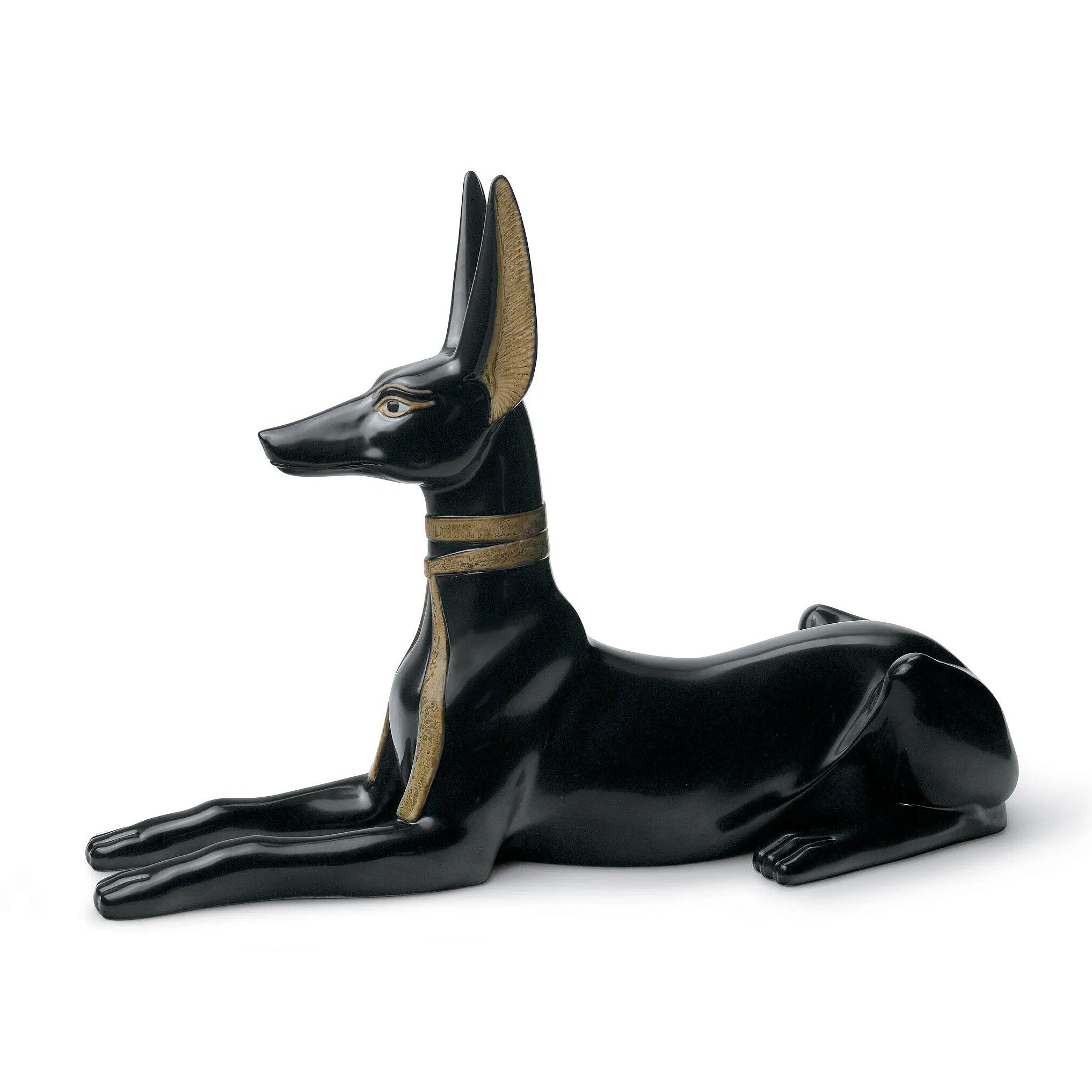 Large scale piece in a style unusual to Lladró representing Anubis, the god of Ancient Egypt. A replica of the original piece, found in the tomb of King Tutankhamun, which guarded the mummy. The name Anubis is of Greek origin and is attributed to the jackal-headed god. In Egyptian mythology it was associated with mummification and life after death. Its black colour in Ancient Egypt wasn't associated with mourning and fear, but rather fertility and prosperity, as the black silt deposited by the rising river levels was favourable to the harvest.