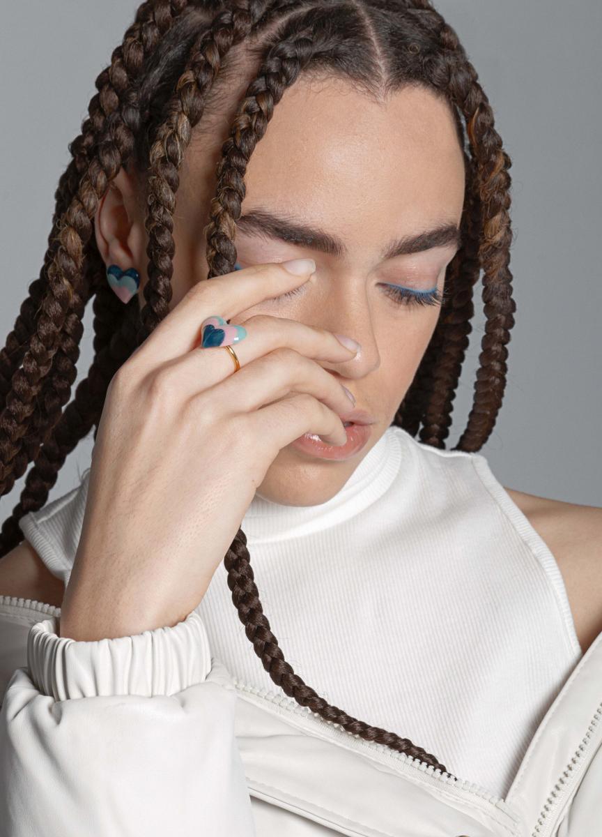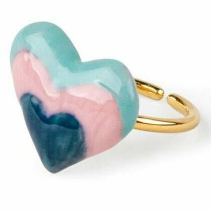 Porcelain ring from the Rainbow collection, dedicated to love. A love unfolding like a rainbow with the different colors conveying its positive energy. Adjustable ring handmade in glazed porcelain and decorated in pink, blue and turquoise tones. The metal part is gold-plated 925 sterling silver. It belongs to the Rainbow collection inspired by love.