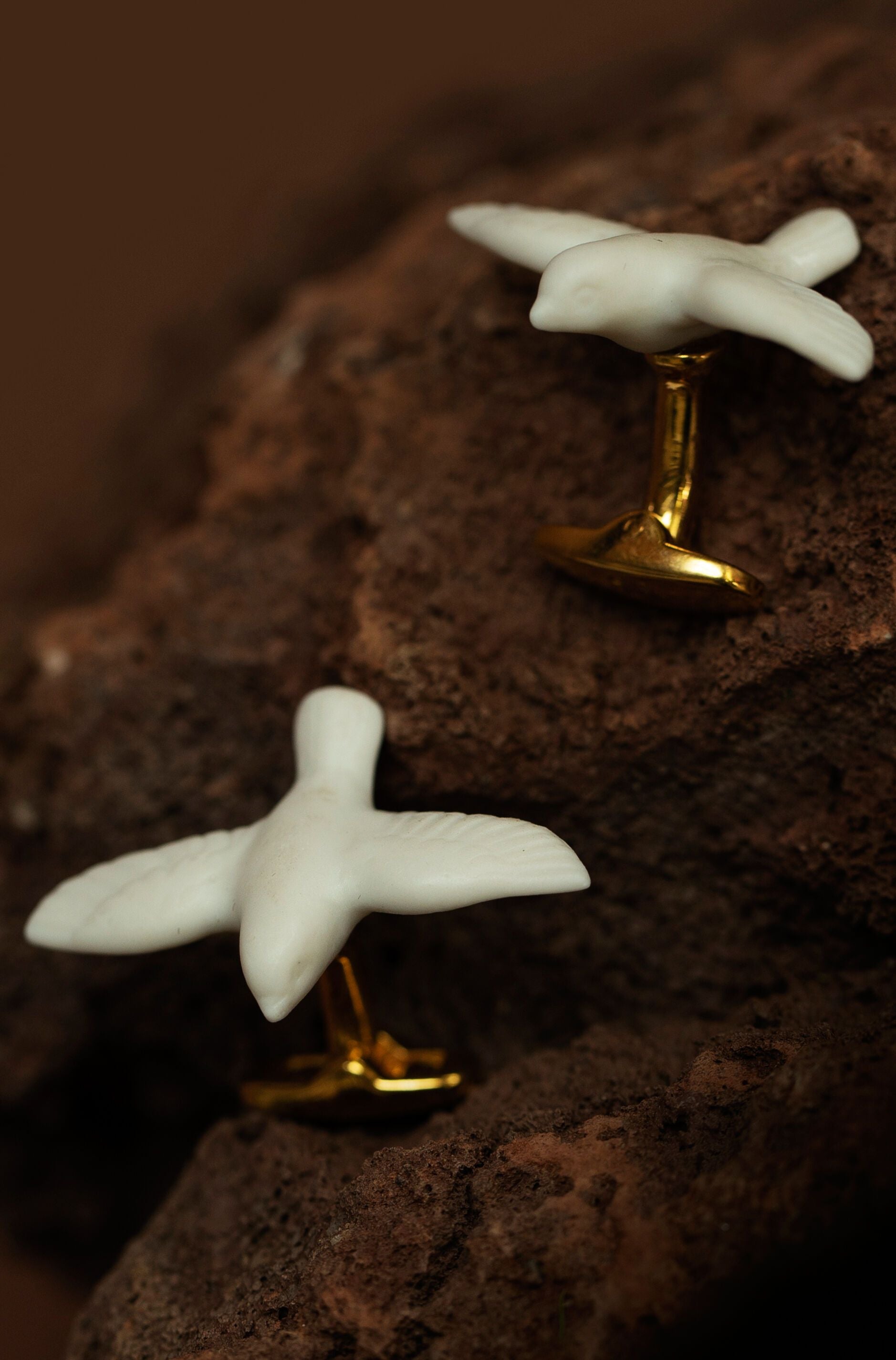 Brass cufflinks plated in 18 carat gold with a small handmade bird in shiny white porcelain.