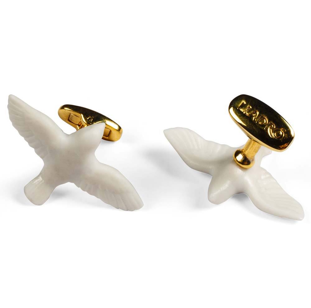 Cufflinks from the Magic Forest collection, Lladro's first foray into the world of jewelry in collaboration with the German designer Bodo Sperlein. Small handmade porcelain birds perched on branches of sterling silver with a gold finish. Pieces of delicate beauty, very luminous and festive, in which the main focus is on Lladro's modelling ability. A small handmade work of art in Valencia, Spain.