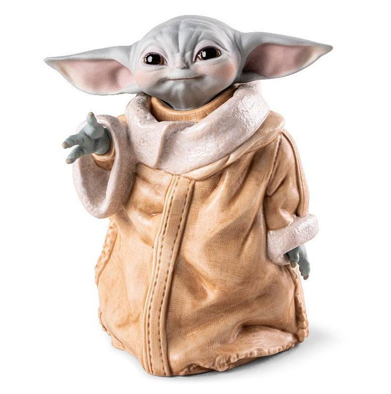 Grogu, the cute beyond words jaw dropping surprise that NO ONE saw coming at the end of The Mandalorian's first episode, instantly entered the heart of every Star Wars fan around the world. The same species as Jedi Master Yoda and possessing his same connection to the Force.  Grogu instantly injected interest and excitement into Star Wars like no other character has.  In this handmade sculpture, the Master Artisans at Lladro have done an amazing job of recreating his cuteness and innocence.