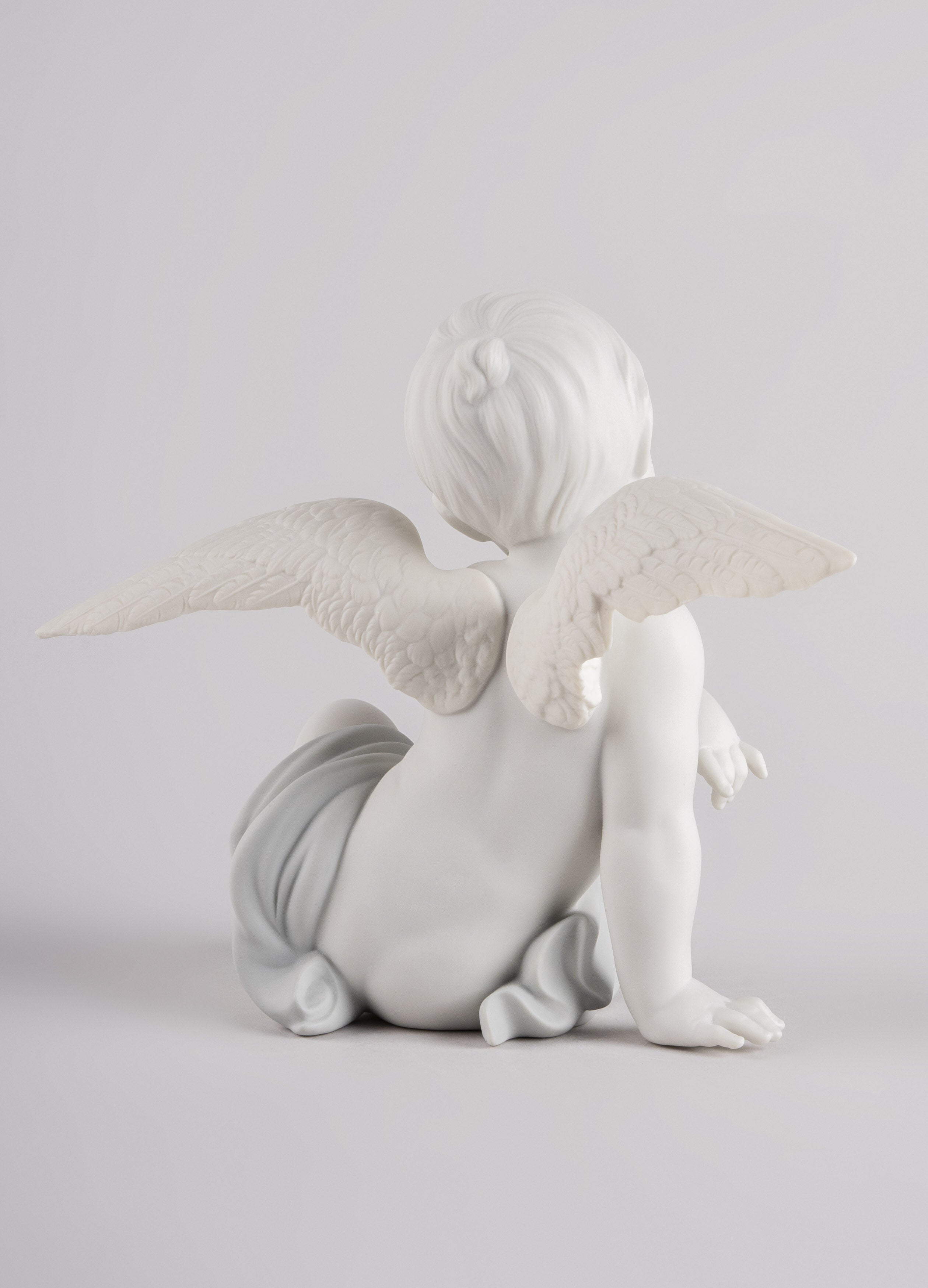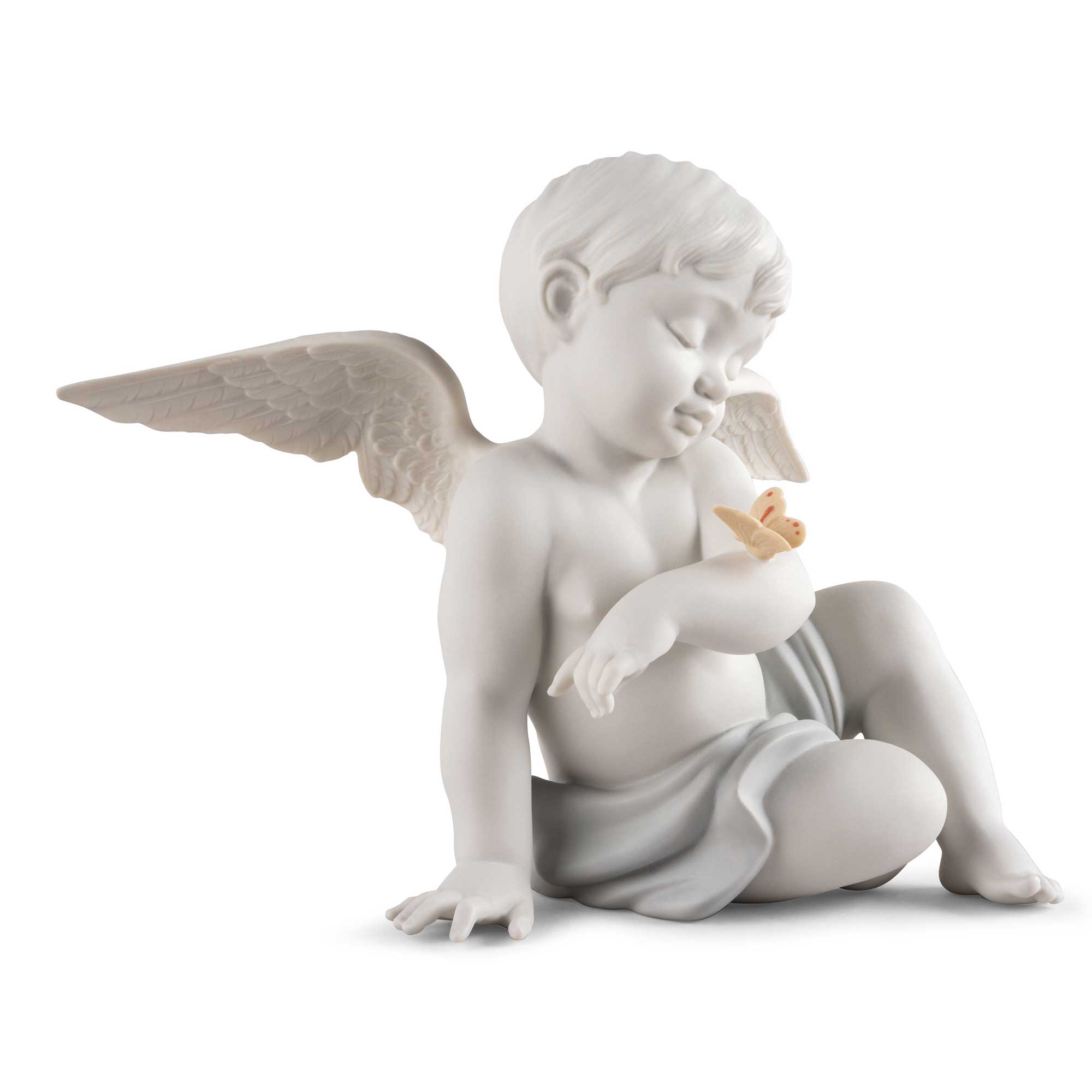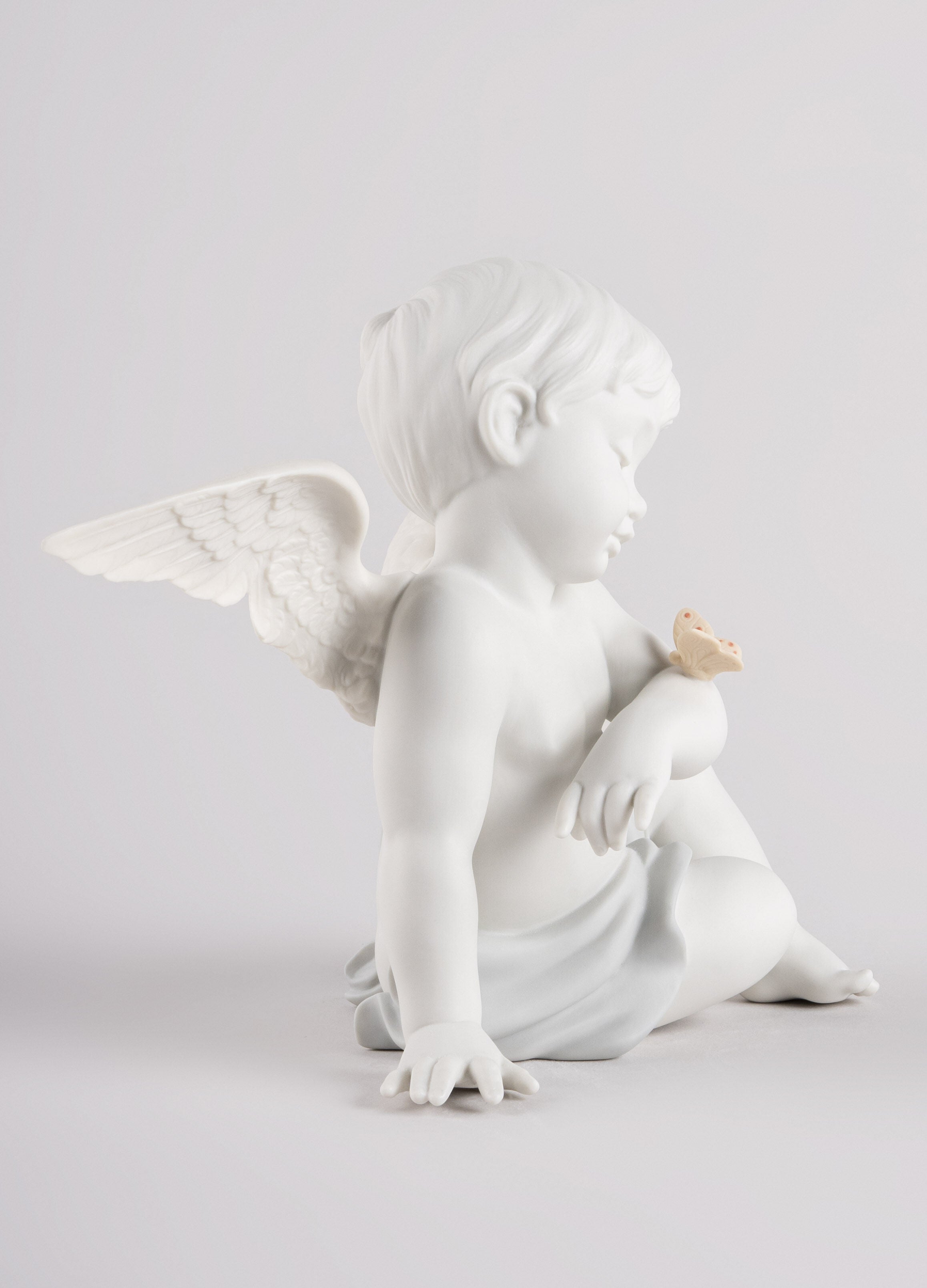 Piece depicting a tender moment between a cute cherub and a butterfly. Angels, the stars of many creations coming from the Lladro workshops, now have a new depiction. A cherub, with perfectly executed facial features and exquisitely etched wings, looks in wonder at a cute little butterfly that has landed on his arm. Made in matte white porcelain with subtle notes of color, the scene produces tender emotions.