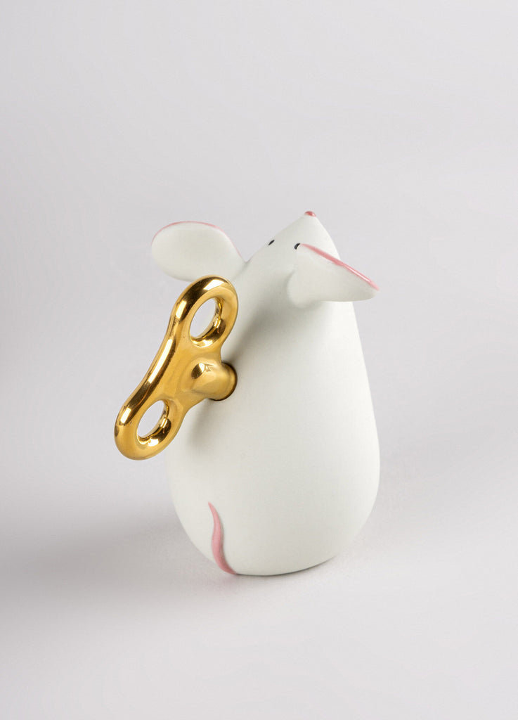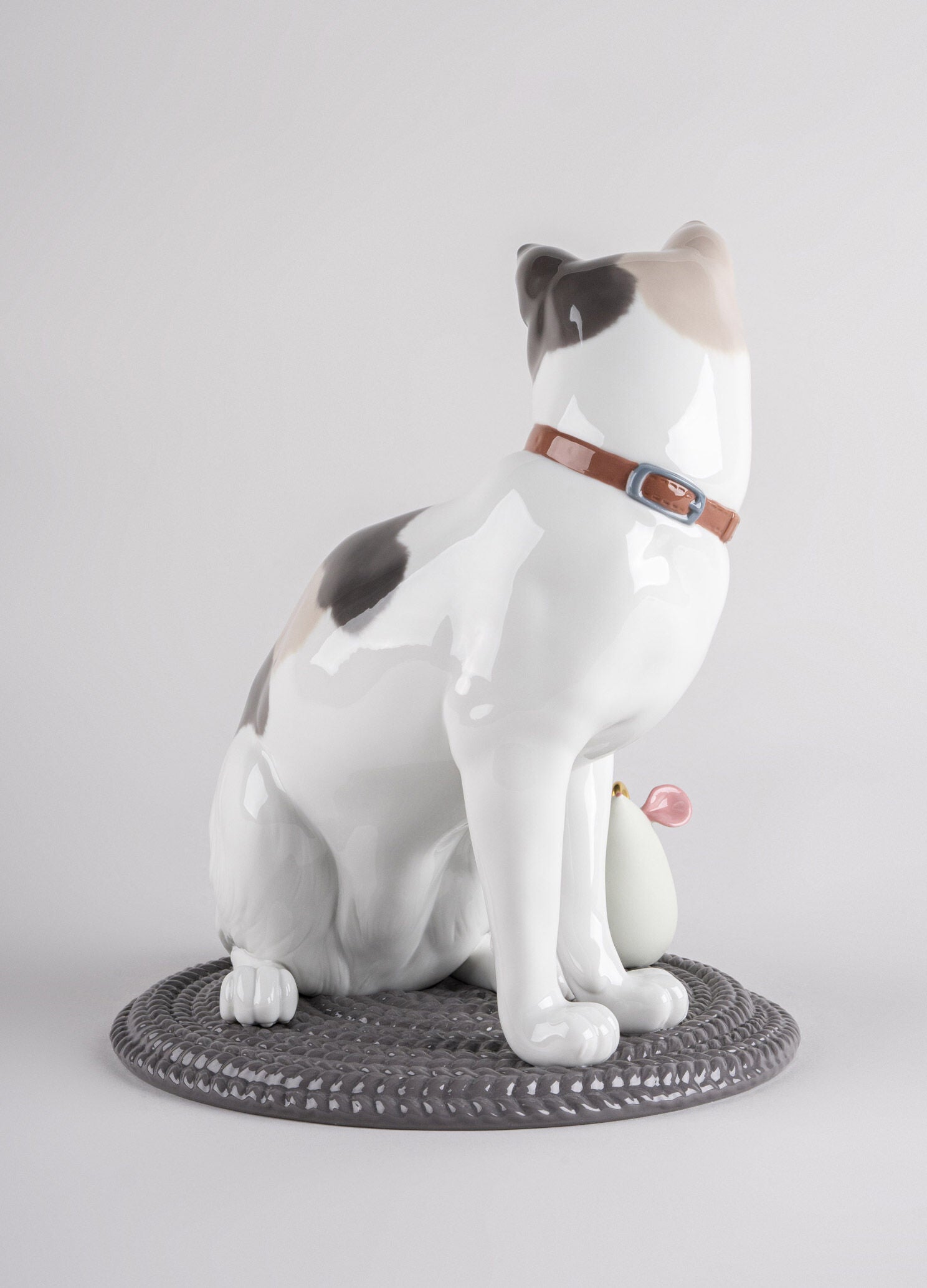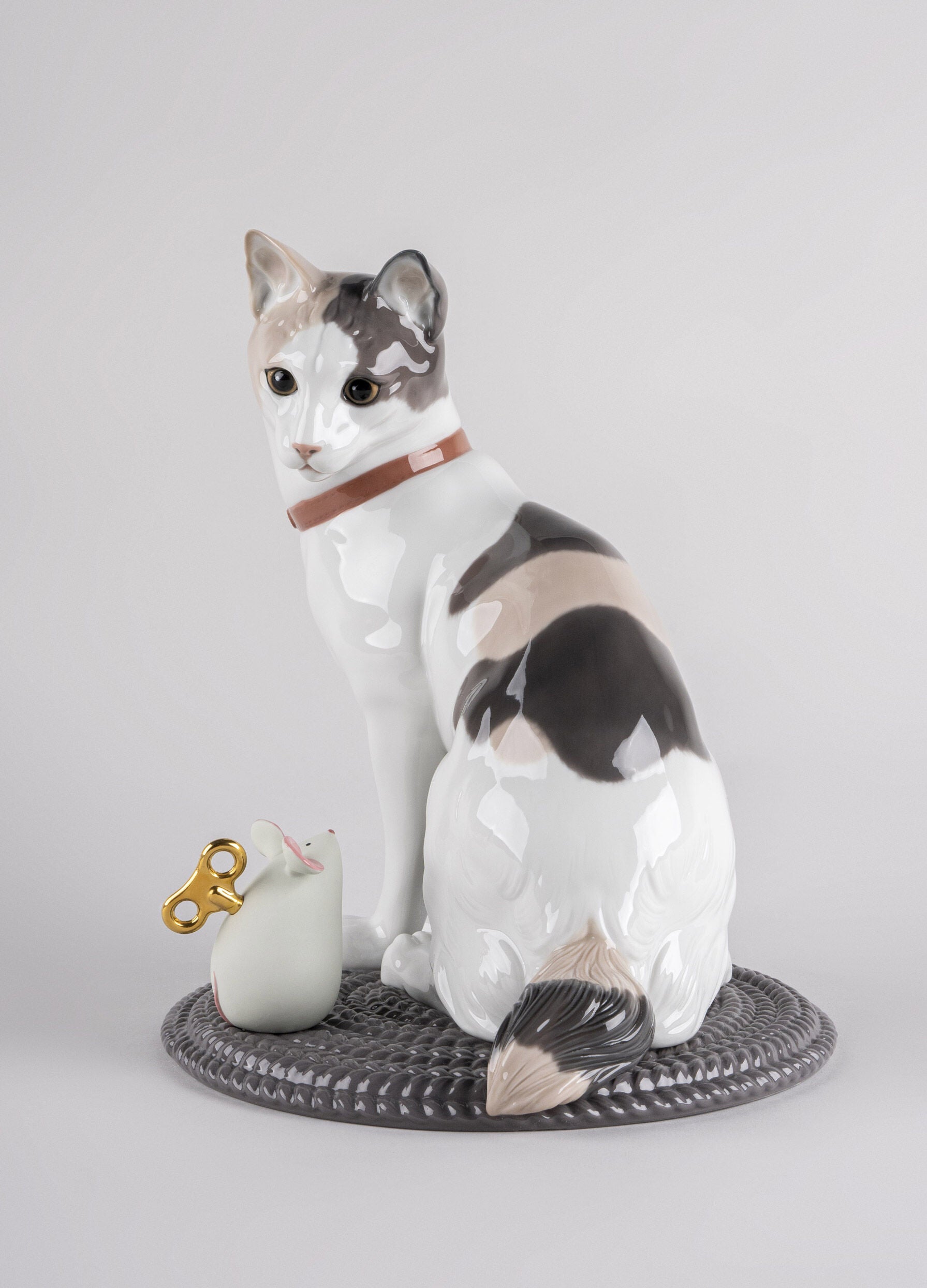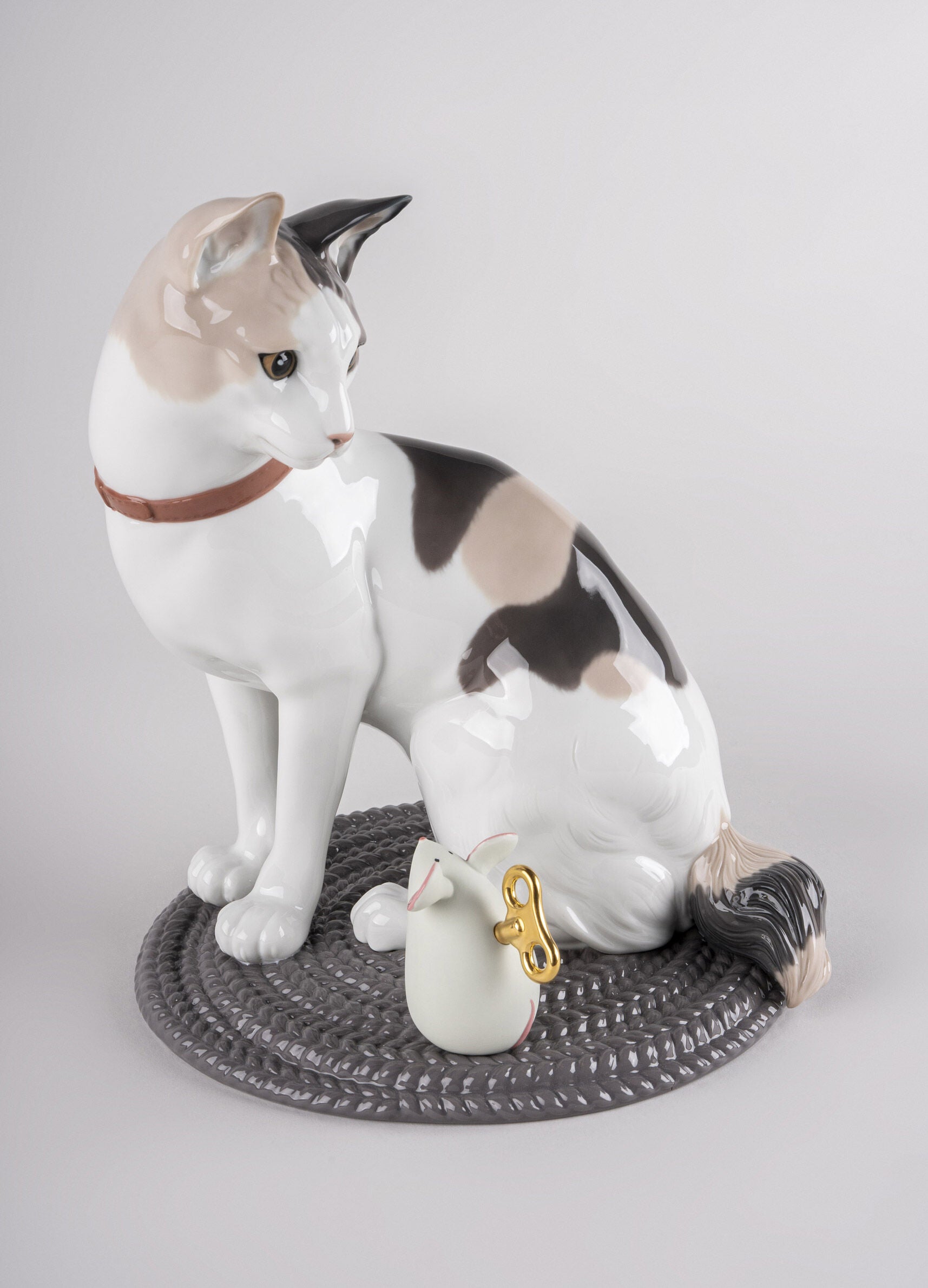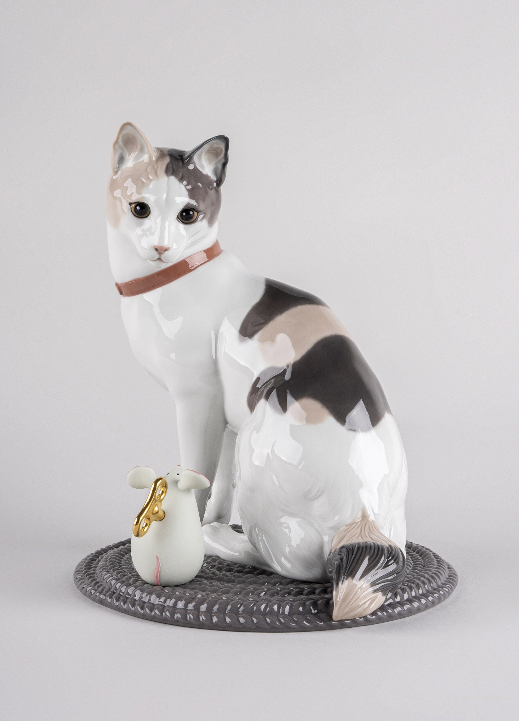 This beautiful cat, made in glazed porcelain, is accompanied by a very special friend, its toy mouse. The former boasts a realistic decoration with special attention paid to the execution of the face and its gaze. The mouse, on the other hand, is made in matte porcelain with touches of glaze in its ears, eyes and nose. Although this lovable couple come together, as the mouse is not fixed to the mat, it can be placed at will.