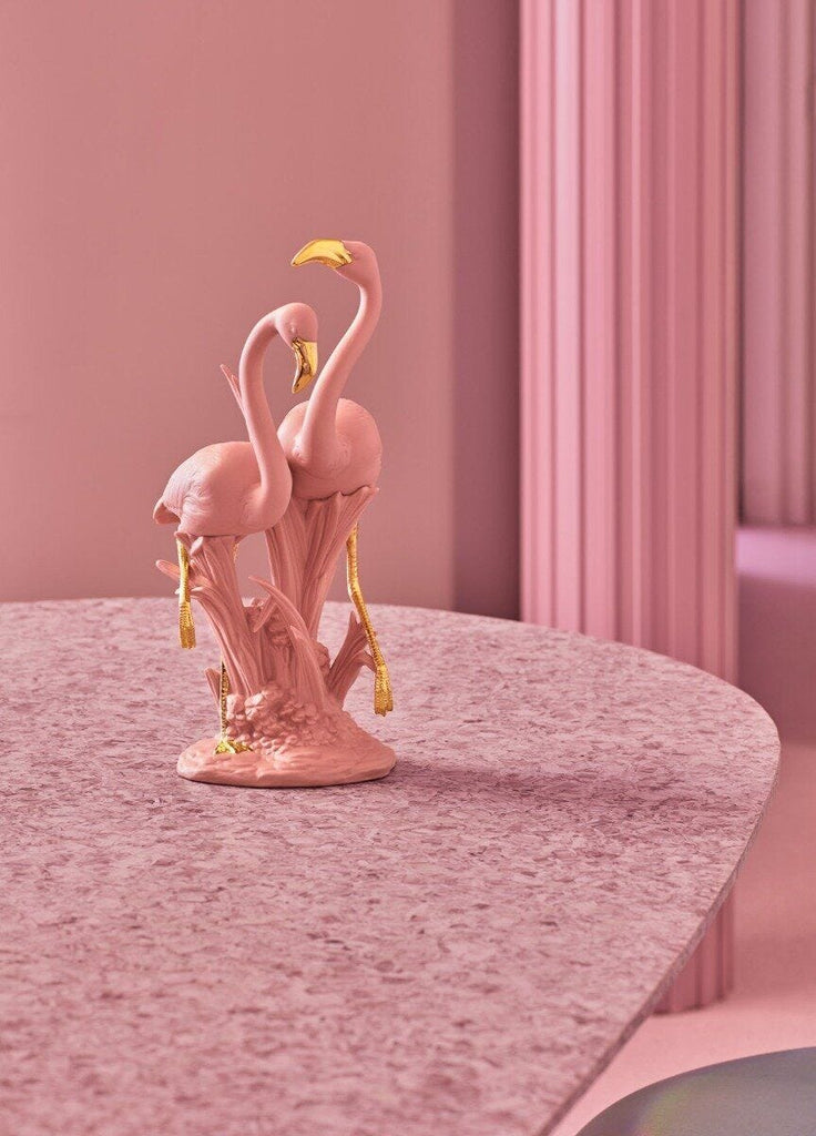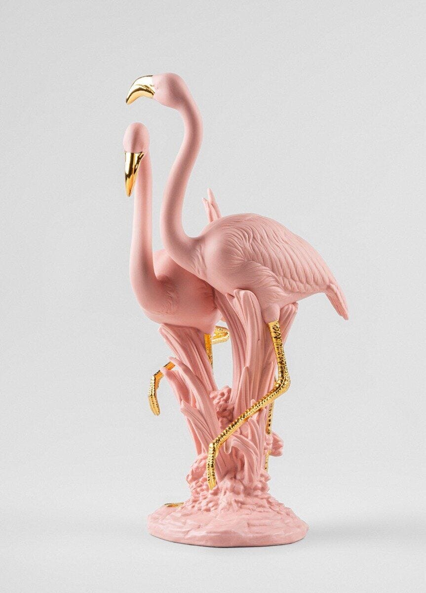 Flamingos are one of the most stylized and striking birds. The name means “flame-colored”. Because of its fire-red color, the ancient Egyptians believed that it was an embodiment of Ra, the sun god. Flamingos are generally long-lived birds, and a recent observational study has shown that they form lasting bonds of friendship with each other. The symbolism of flamingos and their instantly recognizable anatomy inspired Lladró artists to depict them in this creation. A couple of flamingos made in matte porcelain with a surprising decoration in pink and golden luster. The result is a very evocative and decidedly contemporary design.