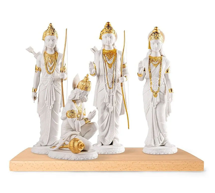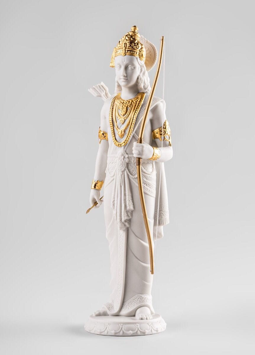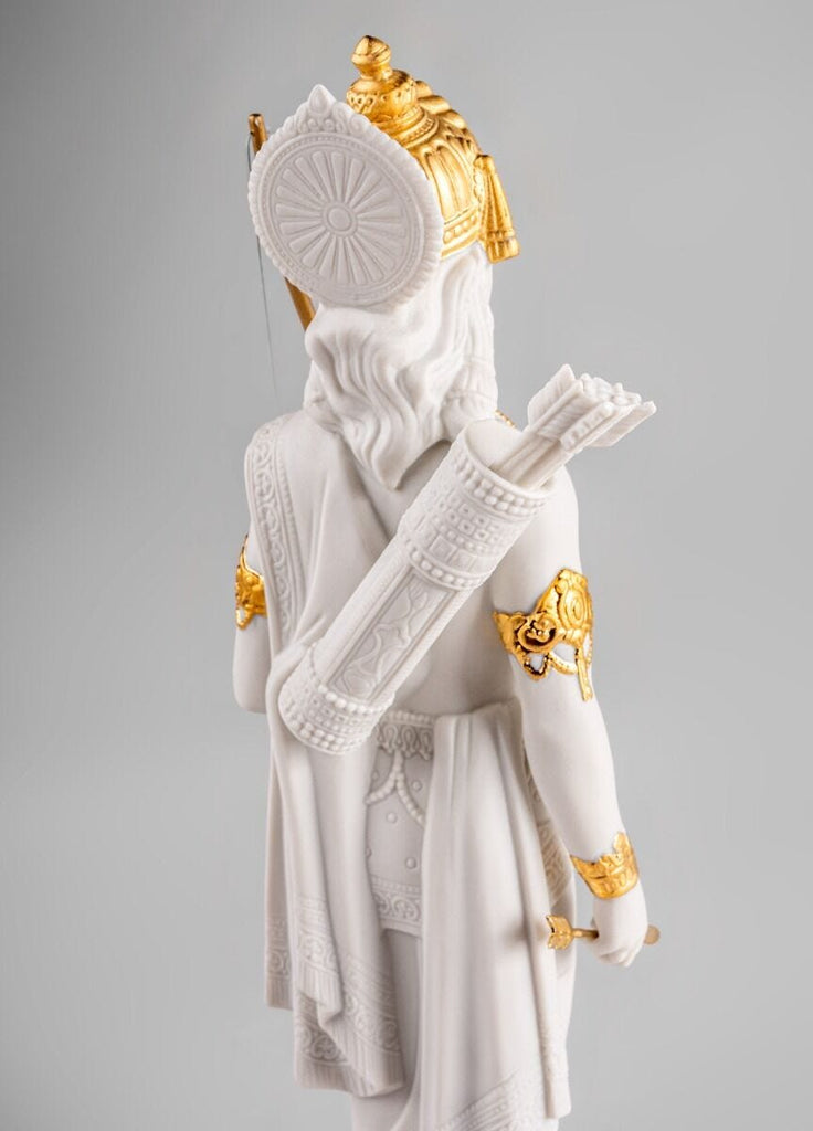 Lakshman, the Hindu prince known for his devotion to truth and justice, is, together with his brother Rama, Sita and Hanuman, one of the four characters in Rama Darbar, which represents the ideal of the happy family. In this matte white porcelain creation, Lakshman, the god who incarnates the fulfilment of duty and sacrifice, is portrayed with all his attributes: helmet, bow and arrows. Golden luster was chosen for the decoration, standing out against the white background and enhancing the sculptural and ornamental work of the piece.