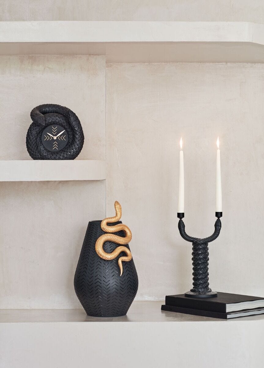 Matte black porcelain vase from the Snakes collection. The snake is a fascinating creature that arouses imagination, fear and curiosity in humans. According to different cultures, it is an ancestral symbol of the life cycle, of wisdom and knowledge, spirituality or power and protection. The design of this piece is based on the contrast between the pure lines of the vase, decorated in an austere black color, and the sinuous movement of the snake, decorated in golden luster.