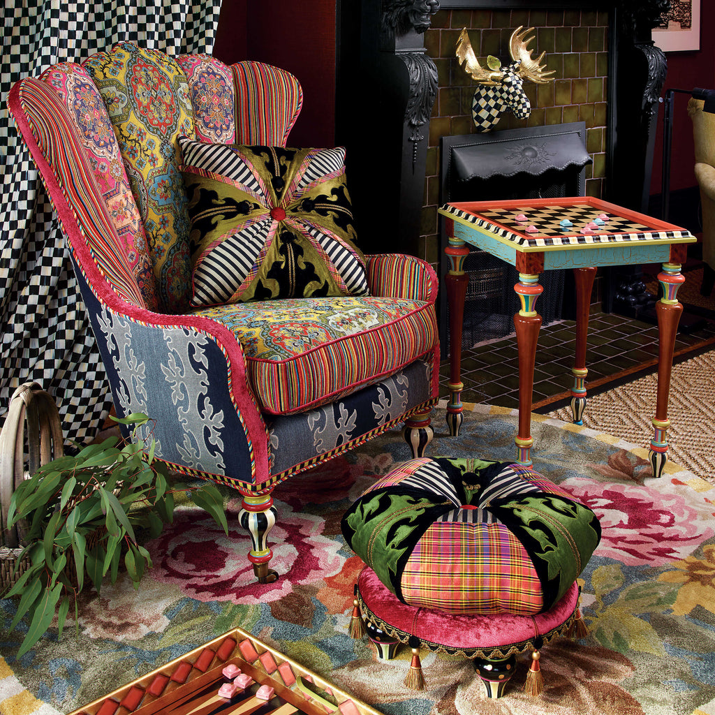 Inspired by the fabulous, famous London marketplace, our Portobello Road Footstool is bursting with patterns: technicolor plaids, black and white stripes, moss-green damask, and orchid-pink velvet. Oversized rickrack trim, swinging tassels, and hand-painted terra cotta feet make this armchair accent worthy of the most engaging conversations.