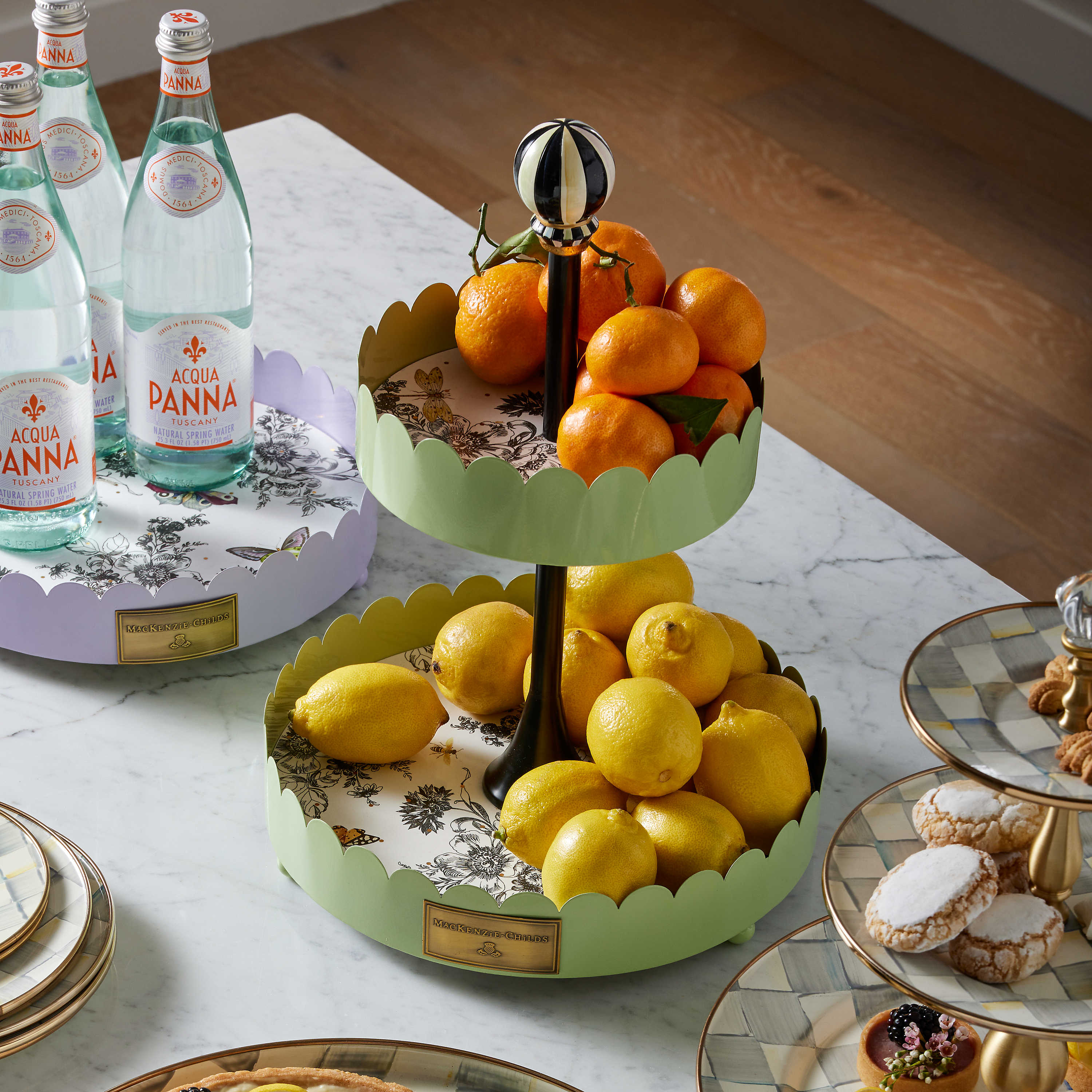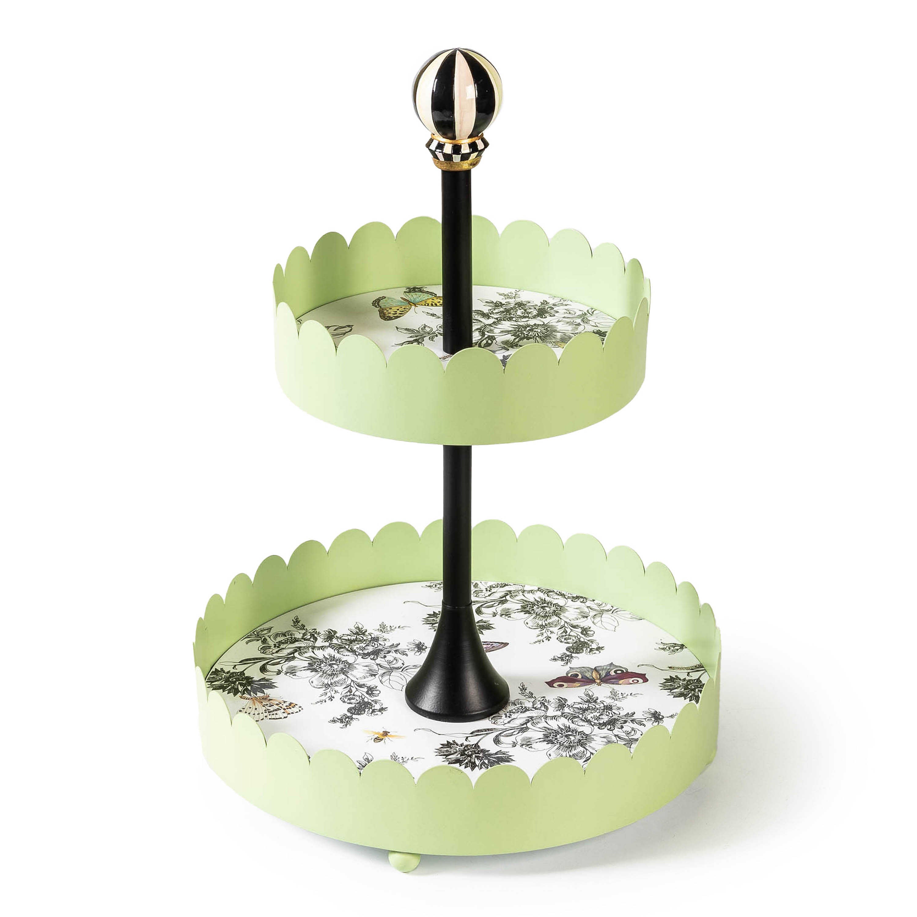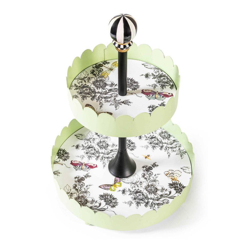 We’re aflutter for this two-tier metal stand, featuring a pattern of butterfly toile that highlights the butterflies and bees with a pop of color, trimmed with pistachio scalloped edges and topped with a Courtly finial.