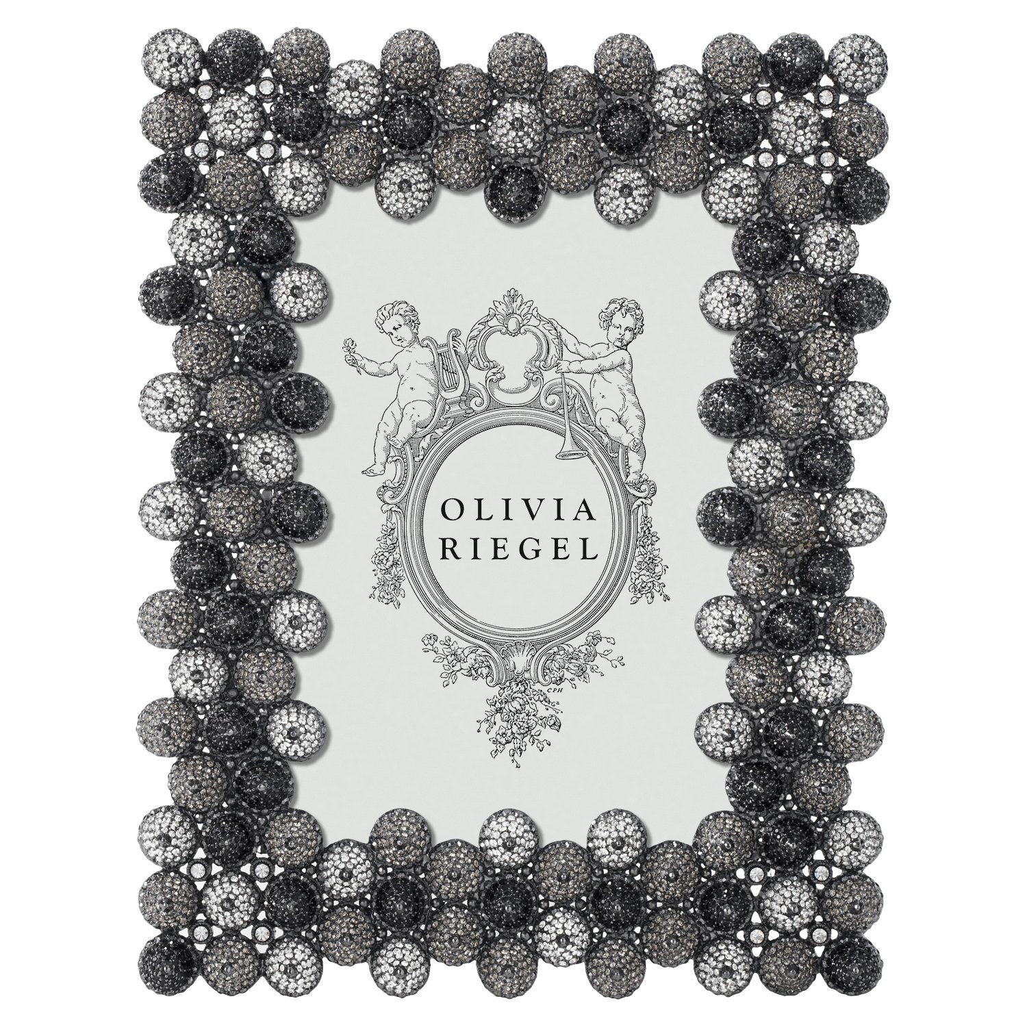 Cast pewter with hundreds of hand-set clear, gray, and jet-black European crystals. Black moire silk back with easel for vertical or horizontal placement.