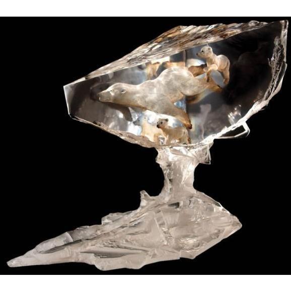 A family of polar bears is captured underwater as they "swim" in a hand-carved block of the highest quality Lucite.