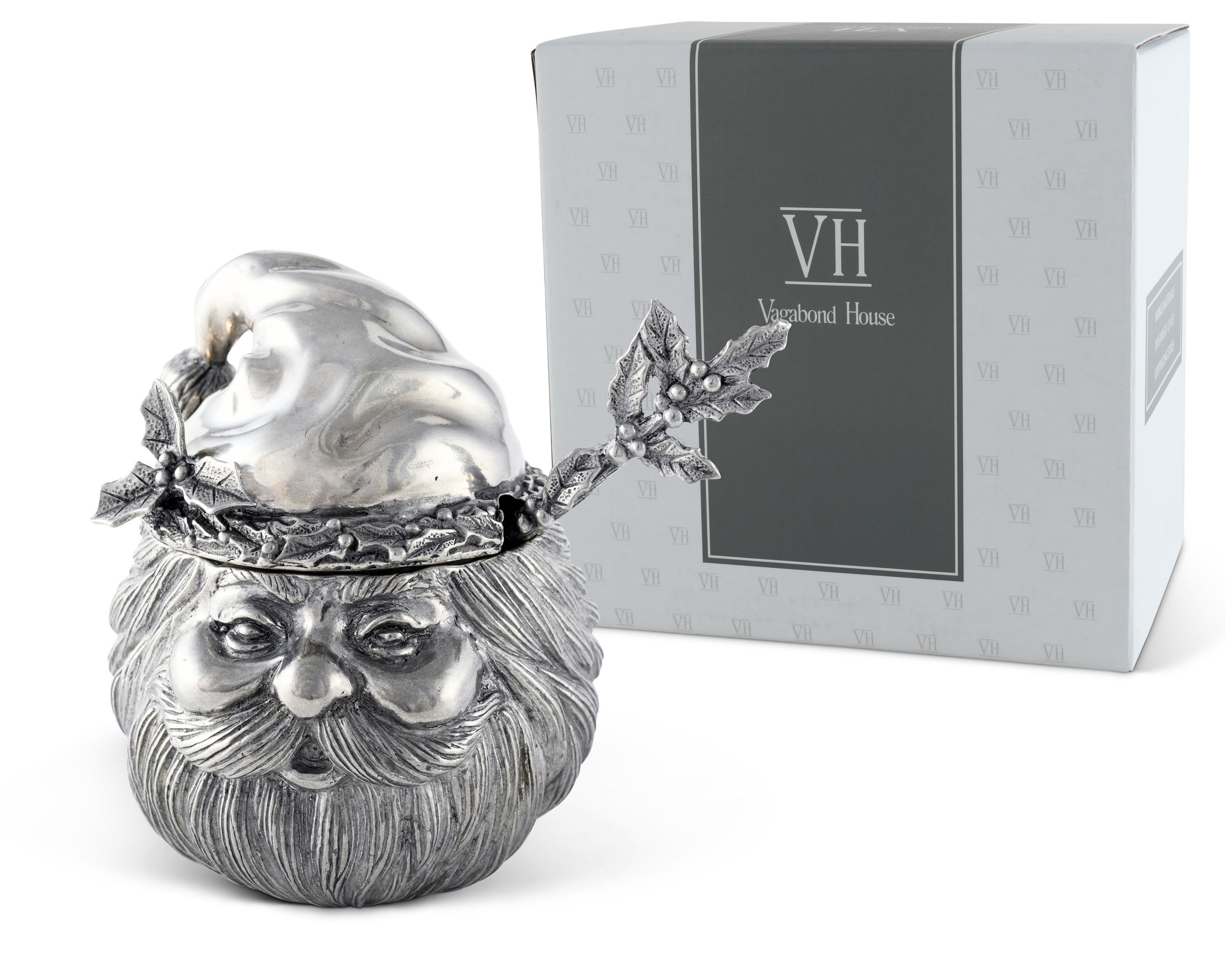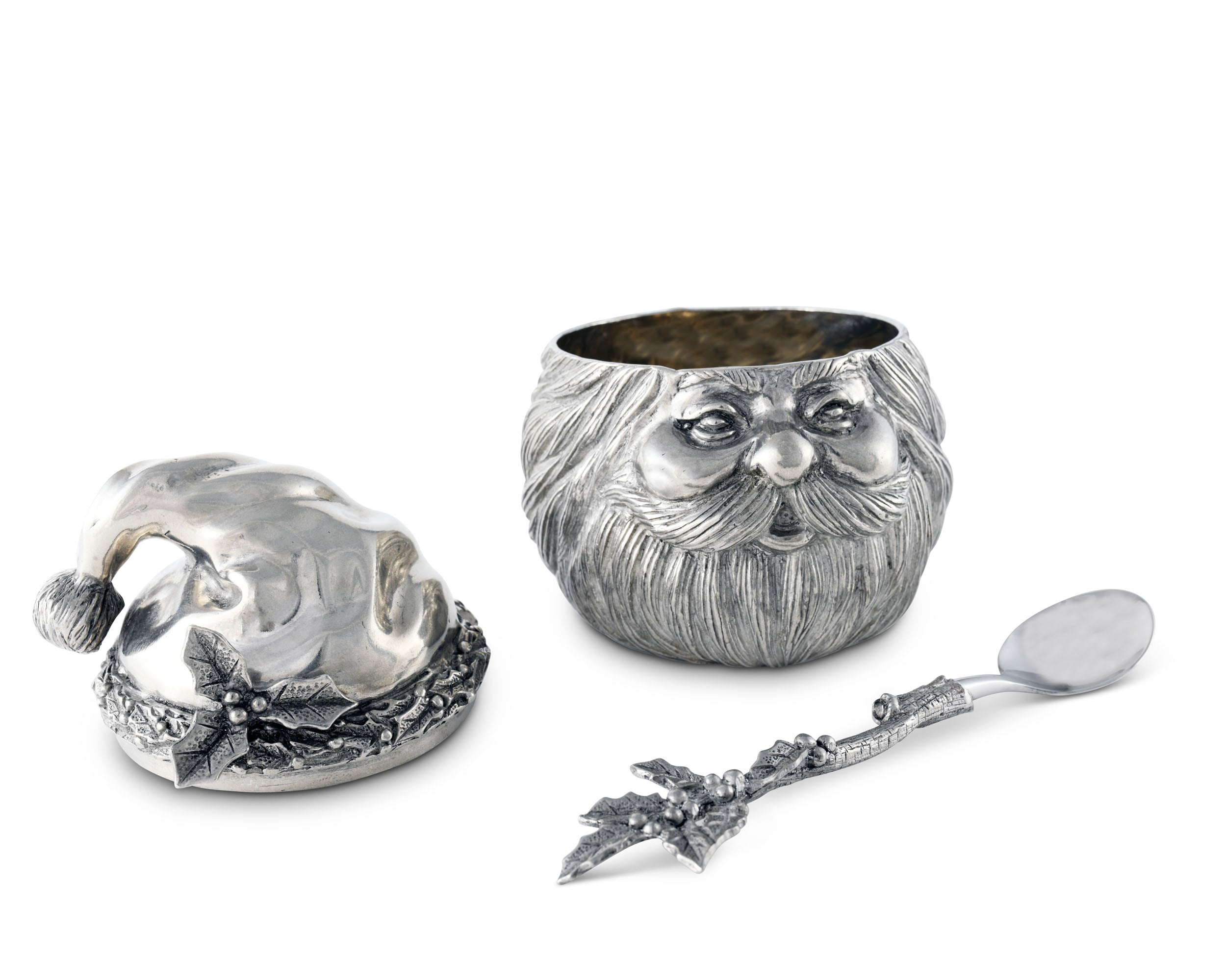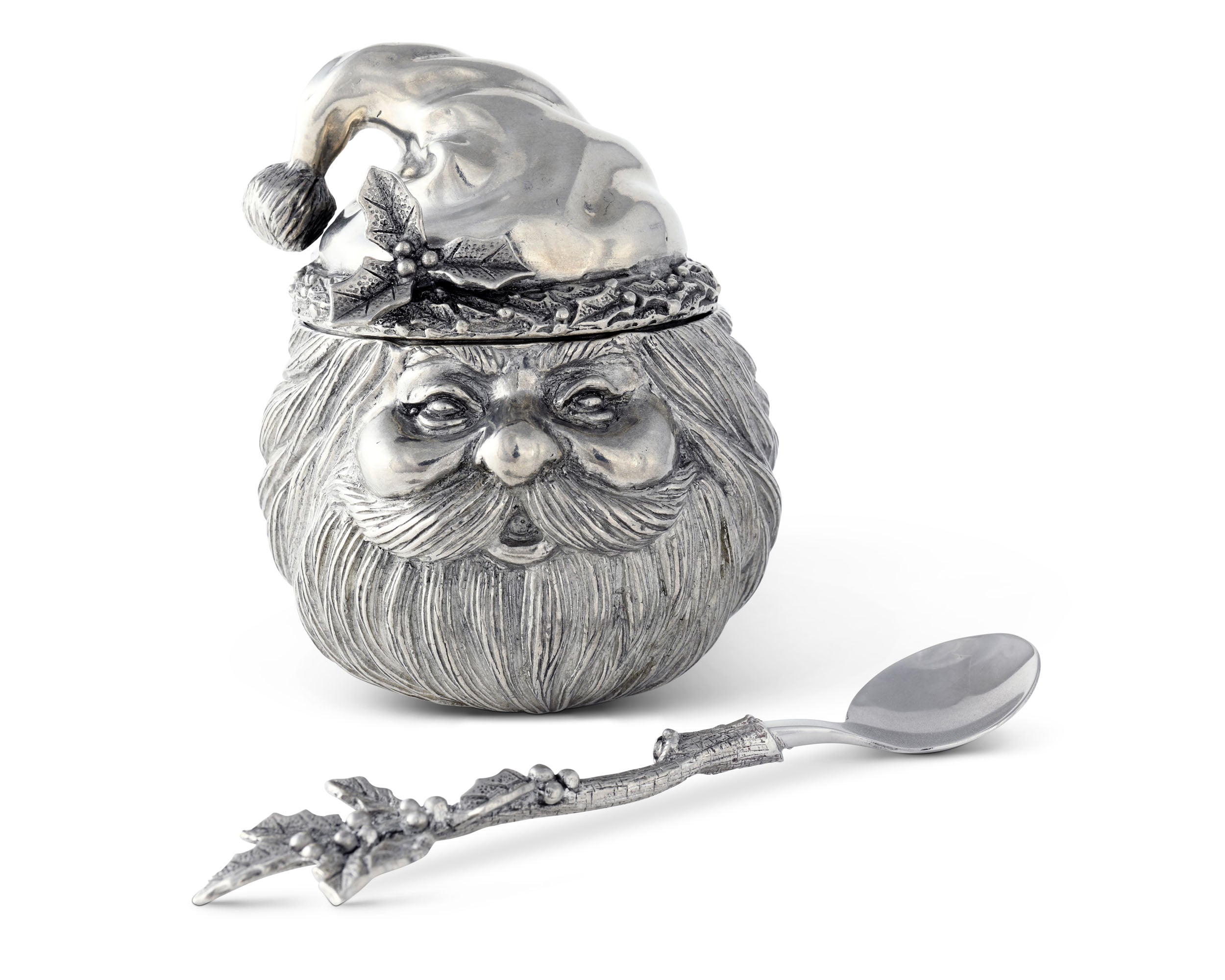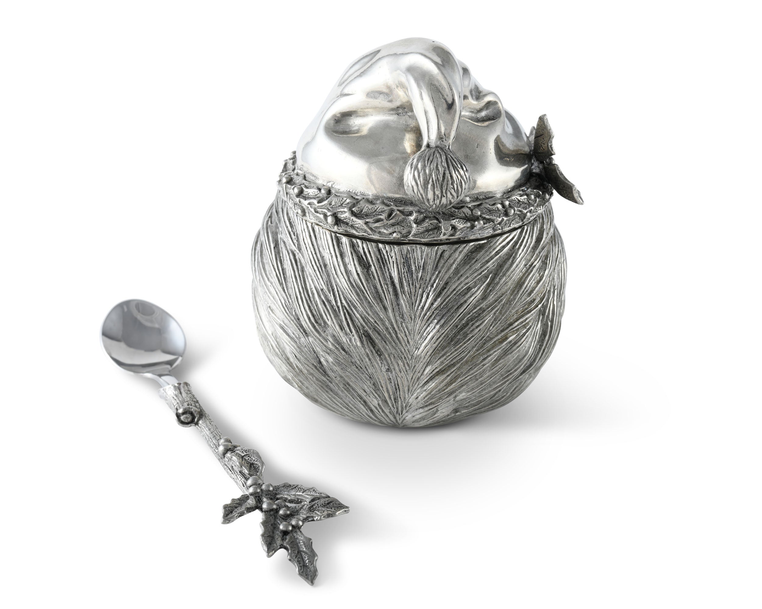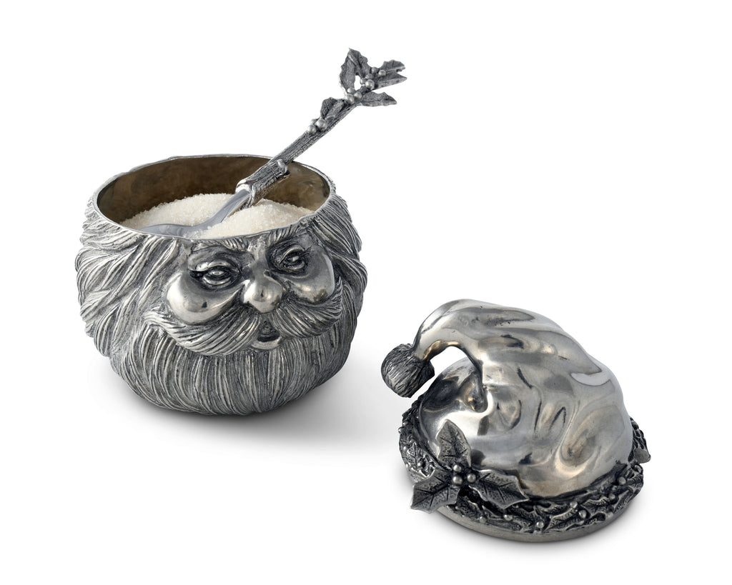 Crafted in the shape of Santa's head, our sugar bowl captures his jolly spirit in pure-pewter form. Thick, defined hair covers much of St. Nick's round face and head, while his hat droops with the weight of a pom-pom. A hand-painted holly branch injects some color into this exquisite design as it extends from the ornamental band on Santa's hat. Spoon sold separately.