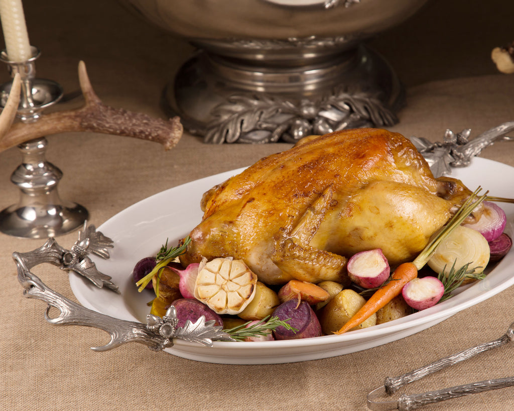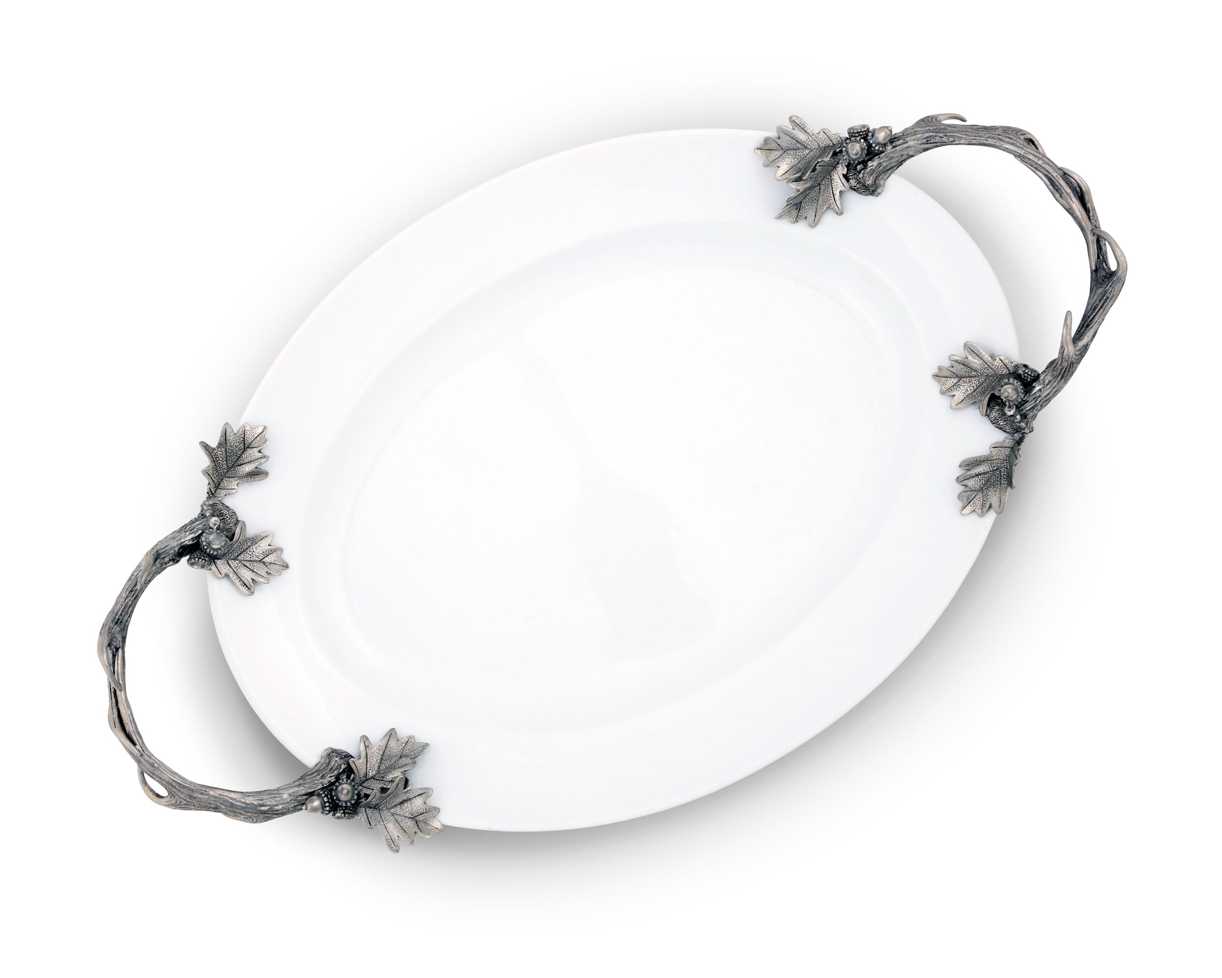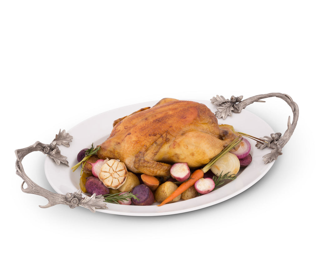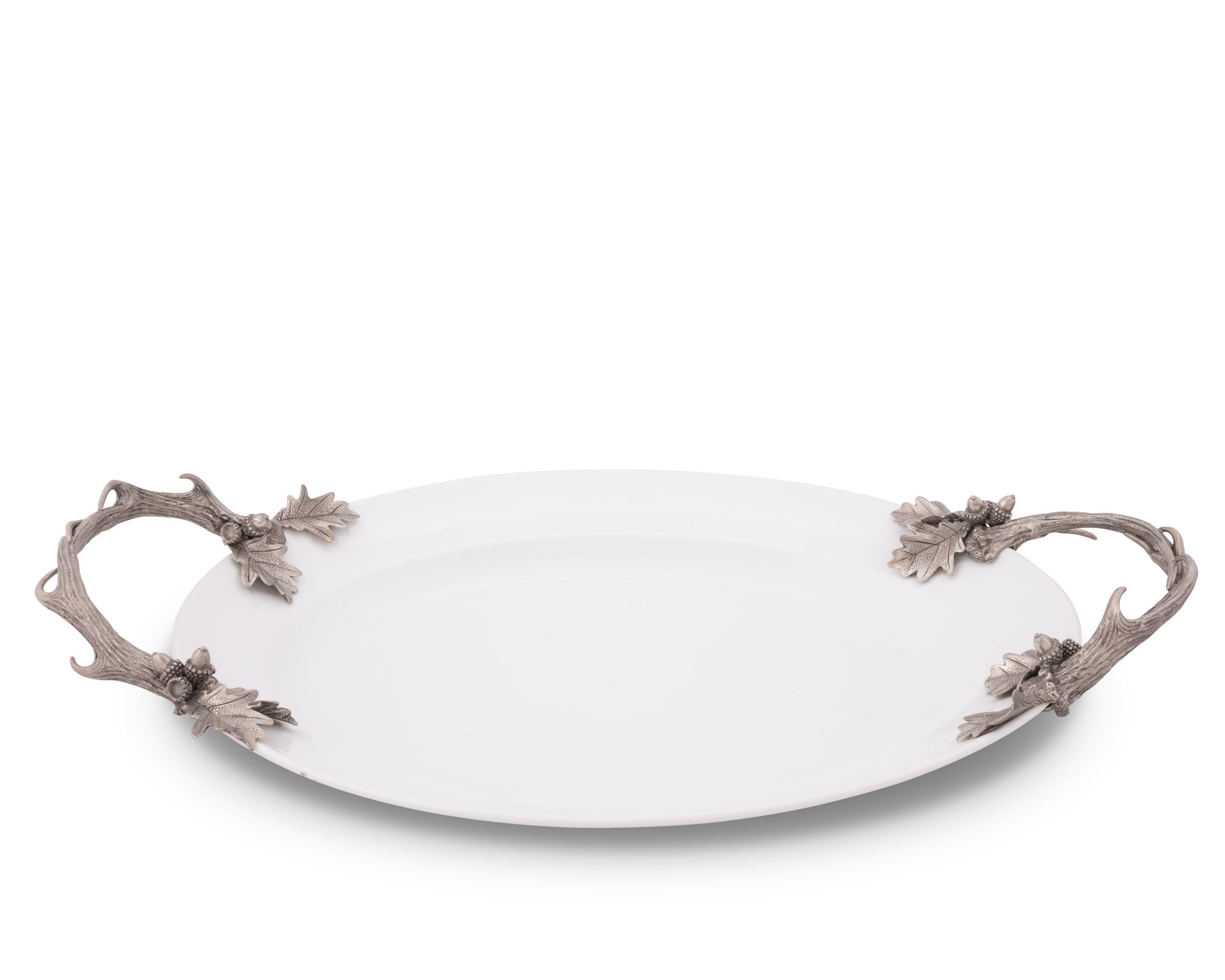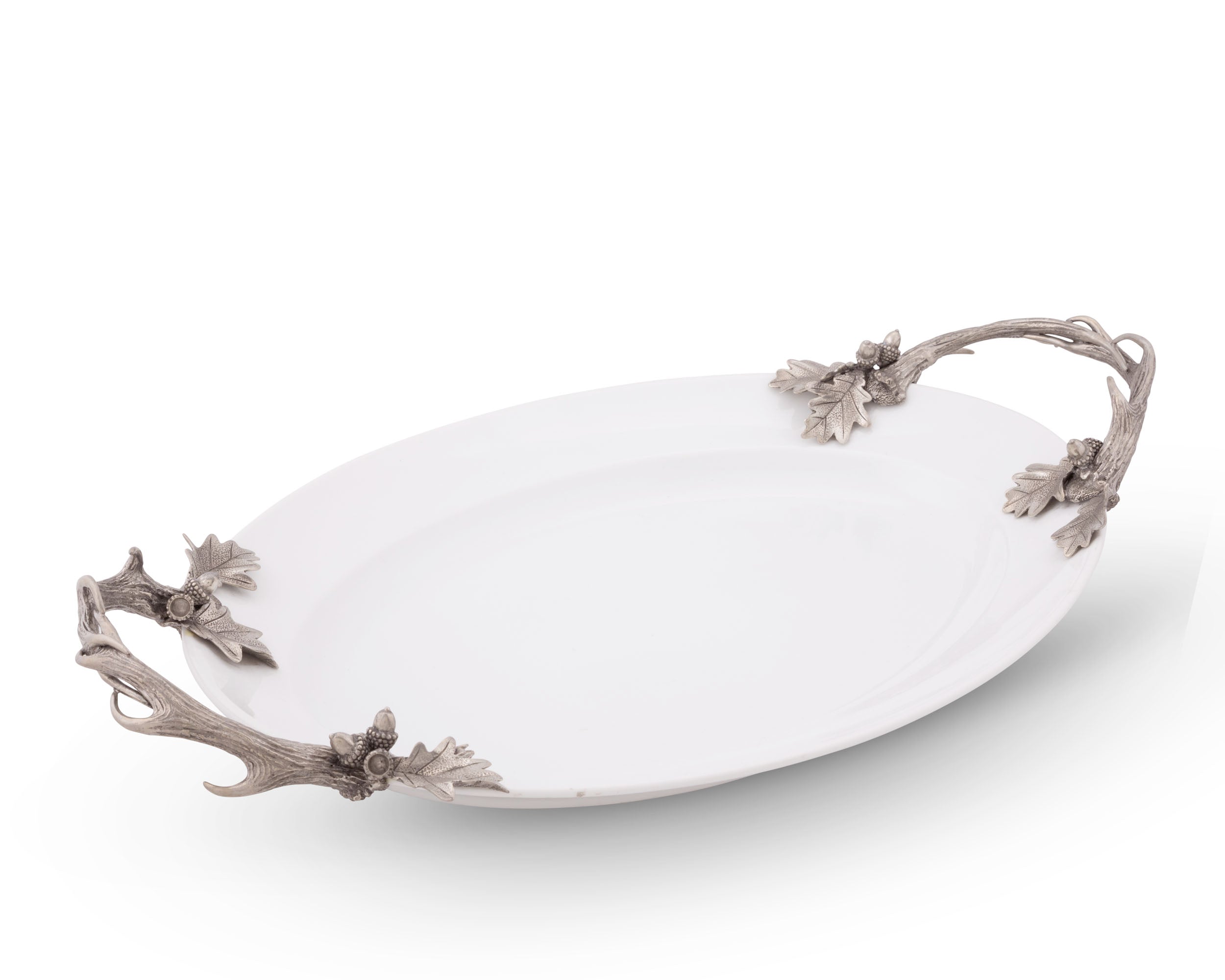 Vagabond House's Fallen Antler Oval Stoneware Serving Tray adds dramatic style to any setting. Intricately detailed, pure pewter handles are cast from a mold of real antler and finished by a scattering of precious pewter leaves and acorns. Unique tray has a rustic yet uniquely elegant vibe.