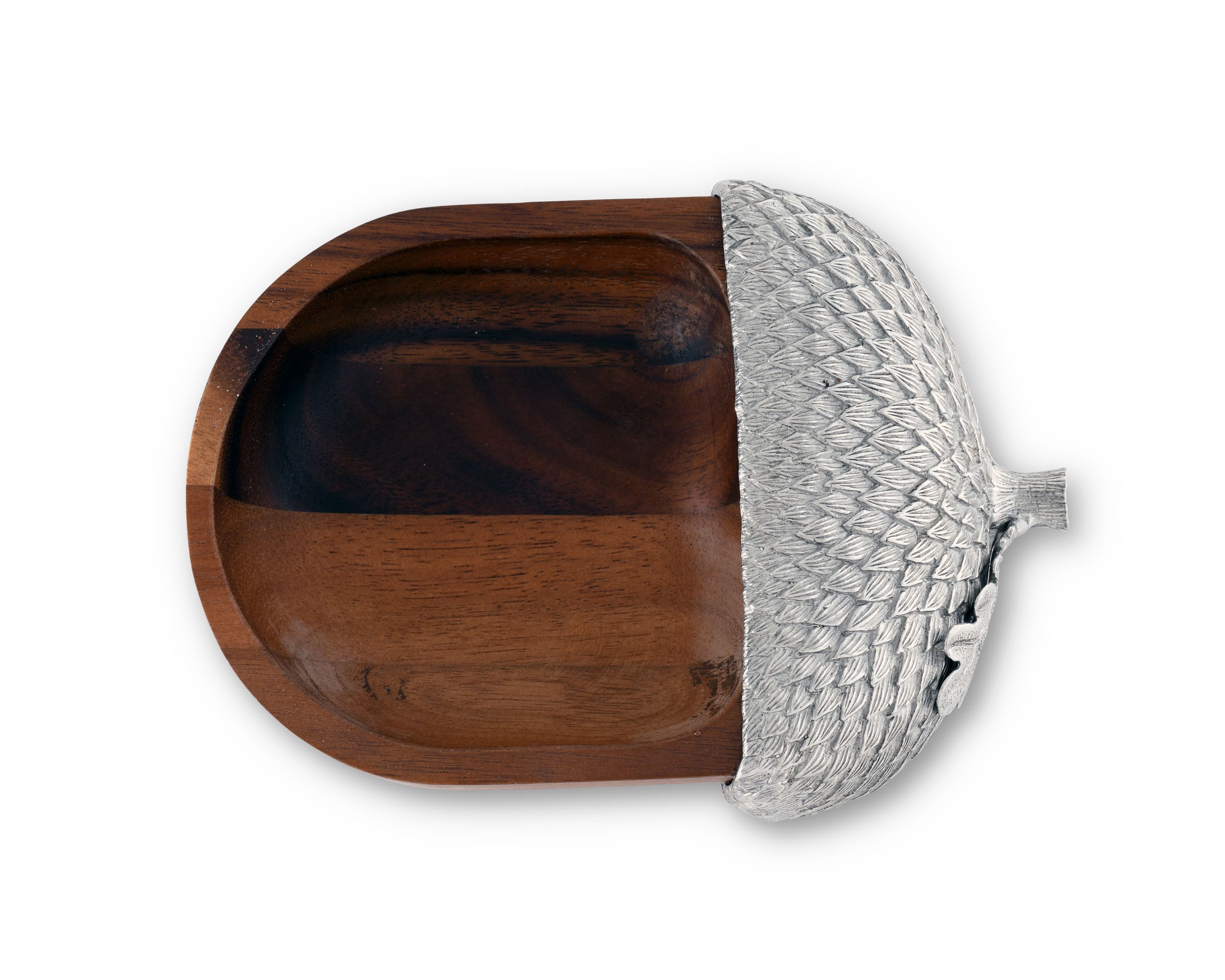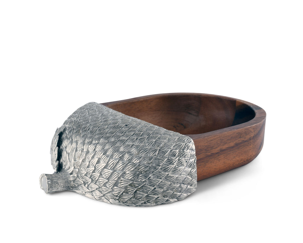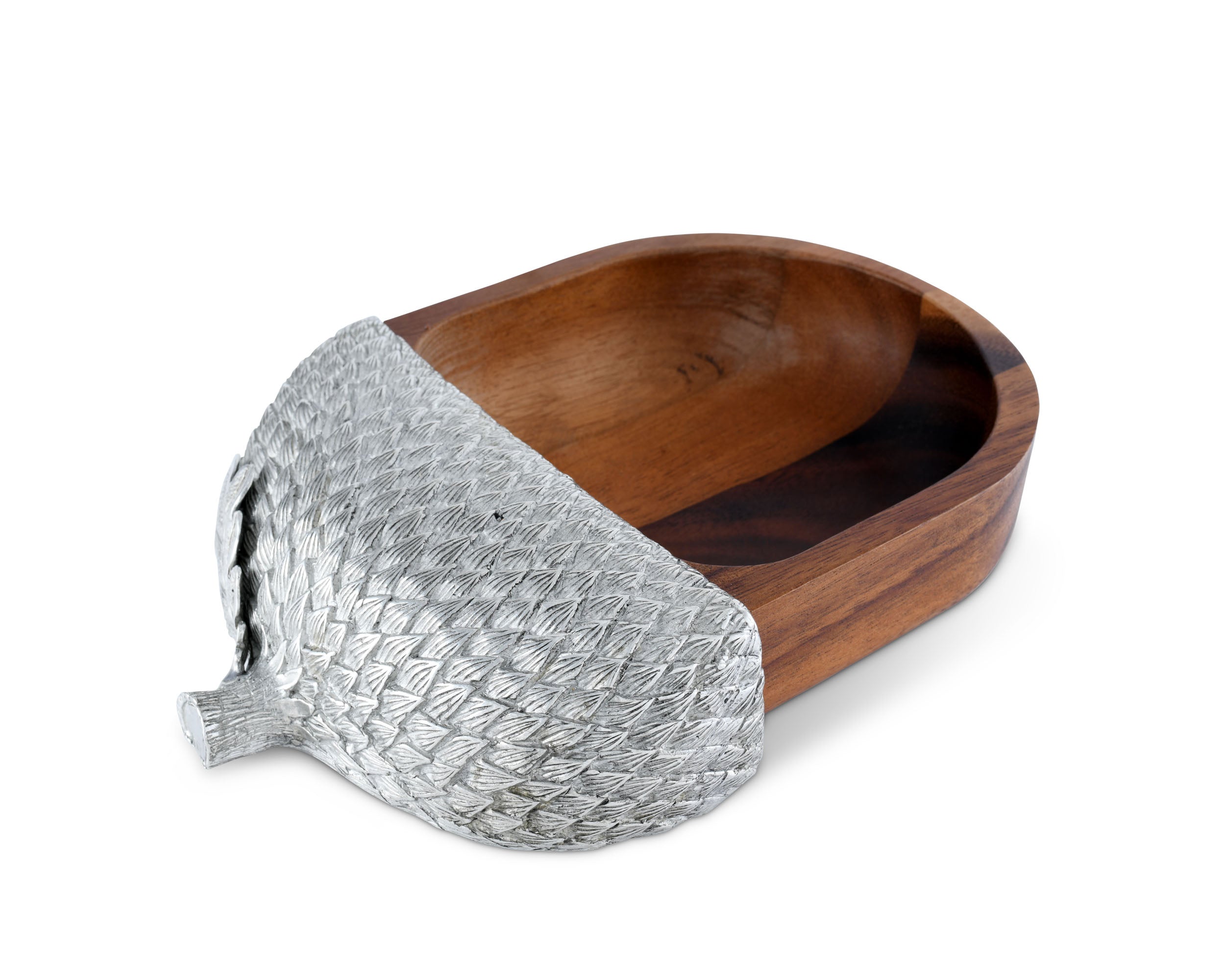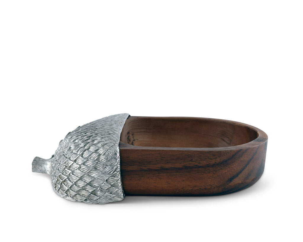 Hand crafted from naturally chatoyant acacia and richly detailed pewter, Vagabond House's Pewter & Acacia Deep Acorn Nut Bowl that echoes the acorn theme.