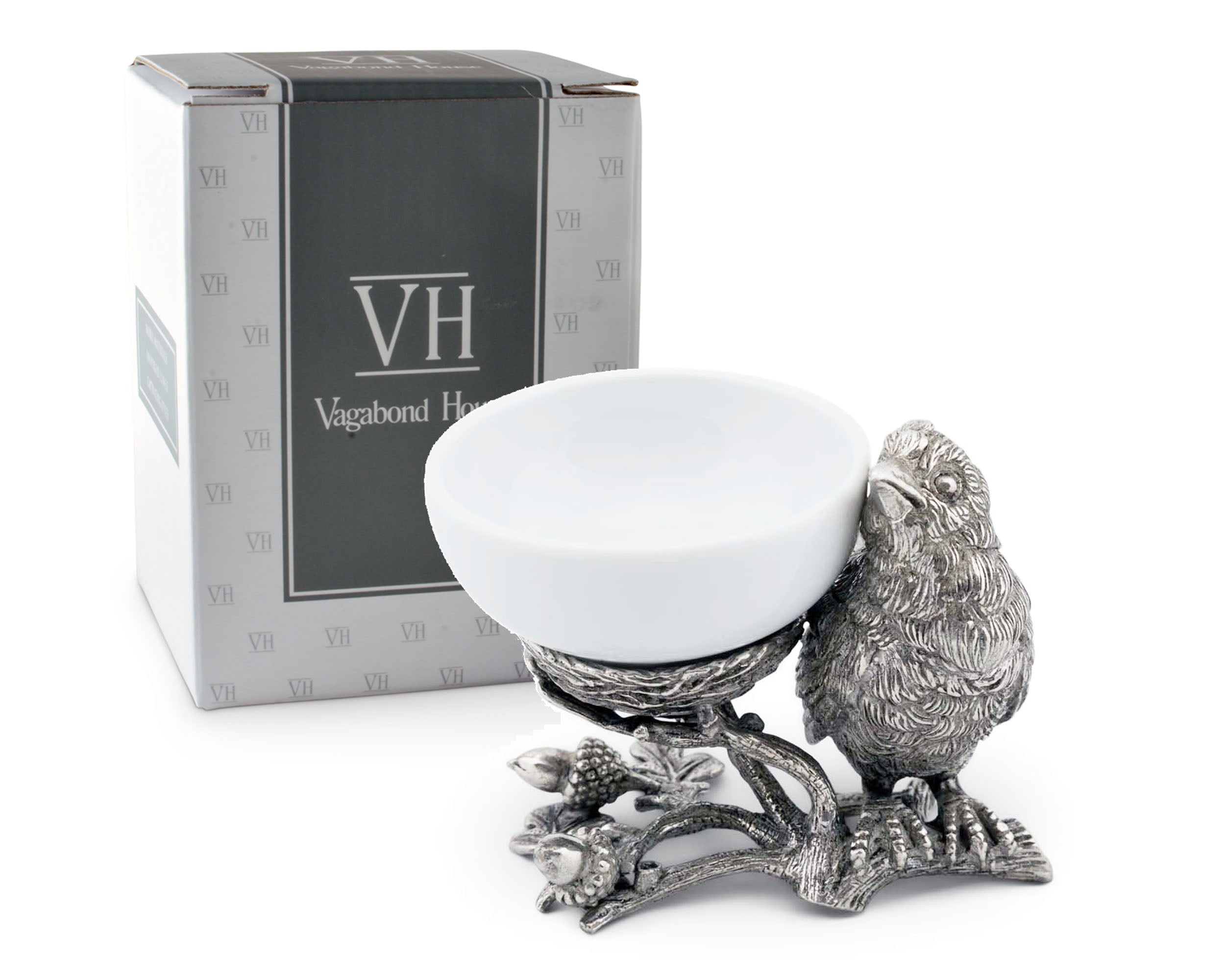 Small in size but big in detail Vagabond House’s Song Bird Salt Cellar is a study in miniature pewter art. A petite pewter nest rests on an oak branch with tiny acorns at the end. Cozied next to it rests a sweet songbird. Fill the stoneware cellar with salt or spice and place into the nest and the artwork is ready for your table.