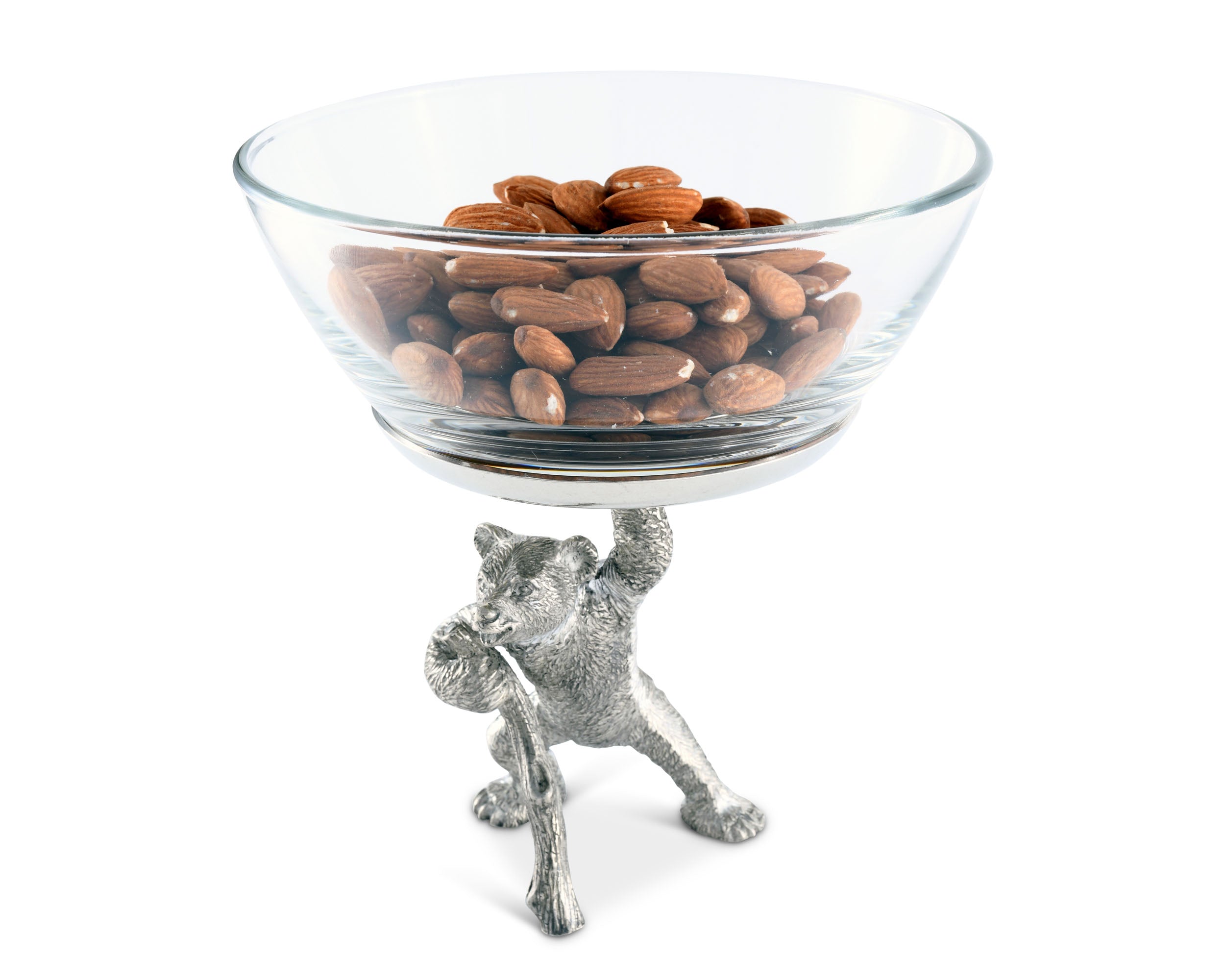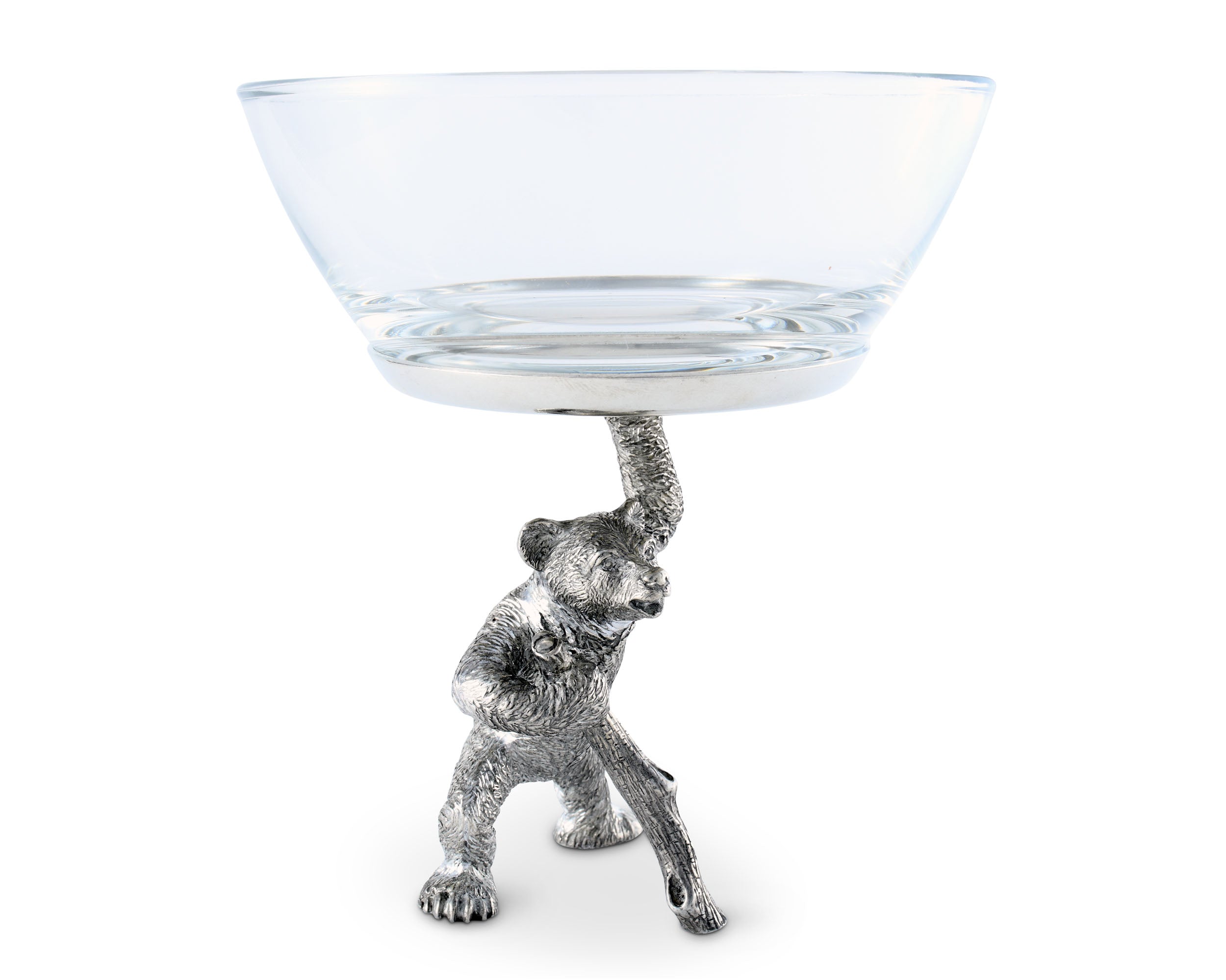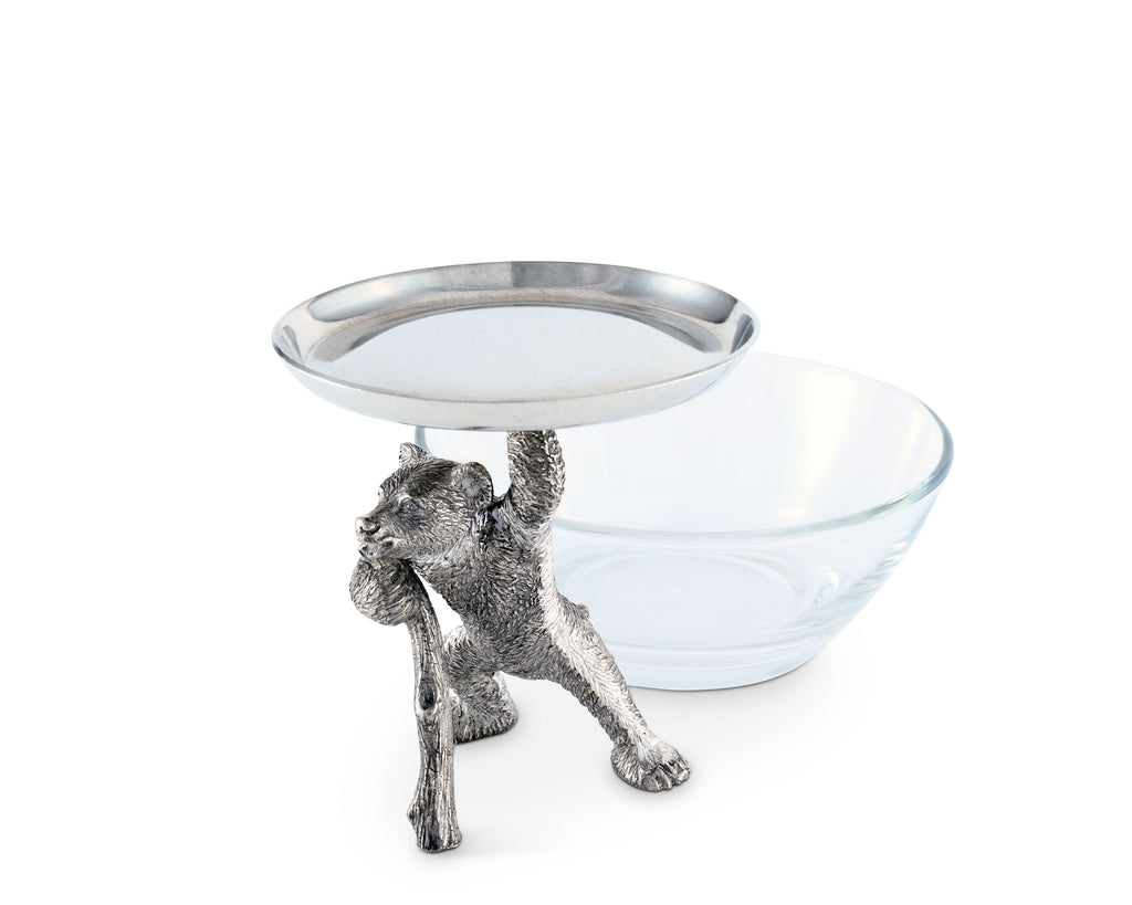 Like a waiter in training, this pure-pewter bear hoists a circular stand into the air with his left arm as his other grips onto a stick for support. Featuring realistic paws and thick, textured hair, the animal looks out playfully as if he's having fun on the job. The removable, glass bowl comes included with this appealing design.