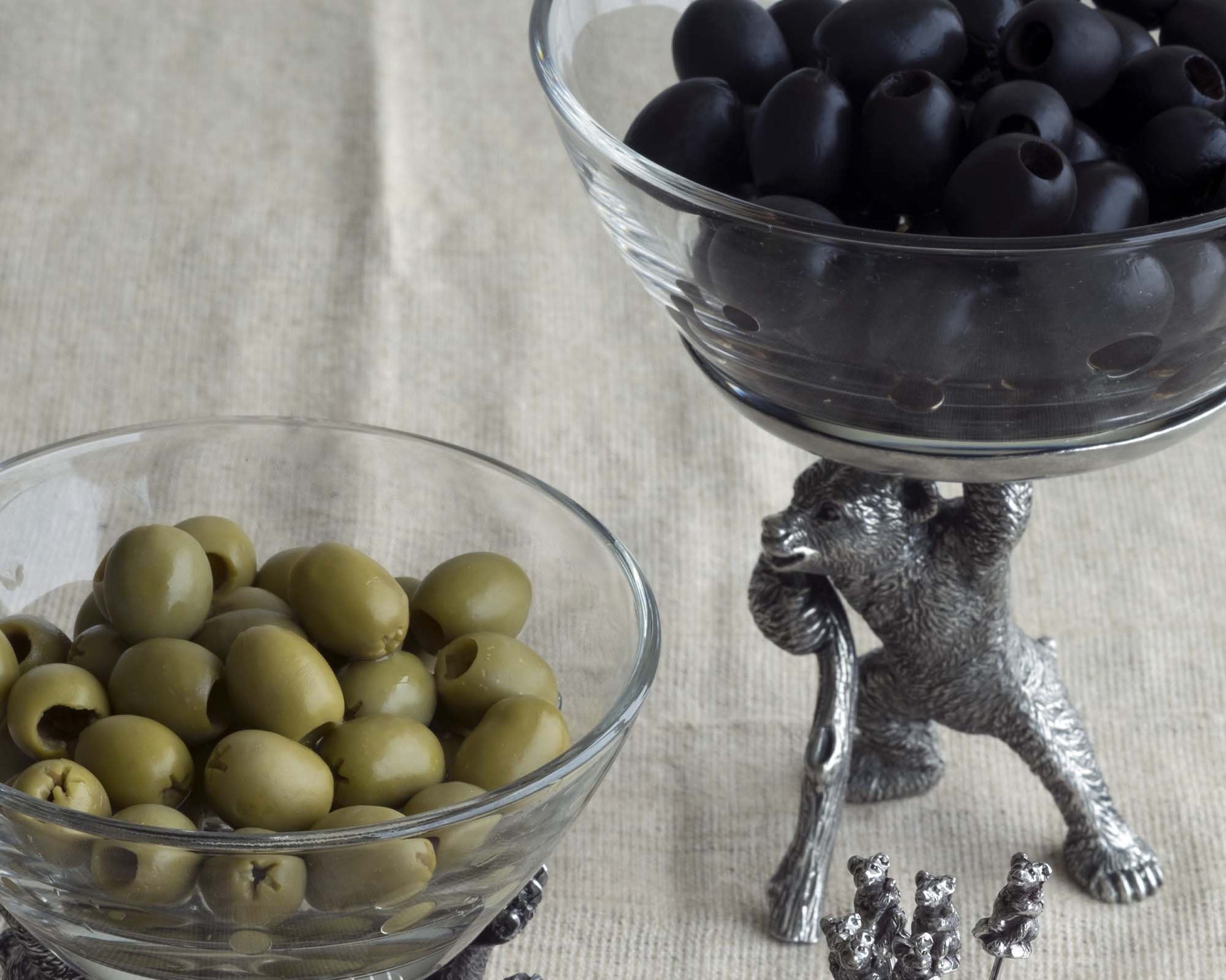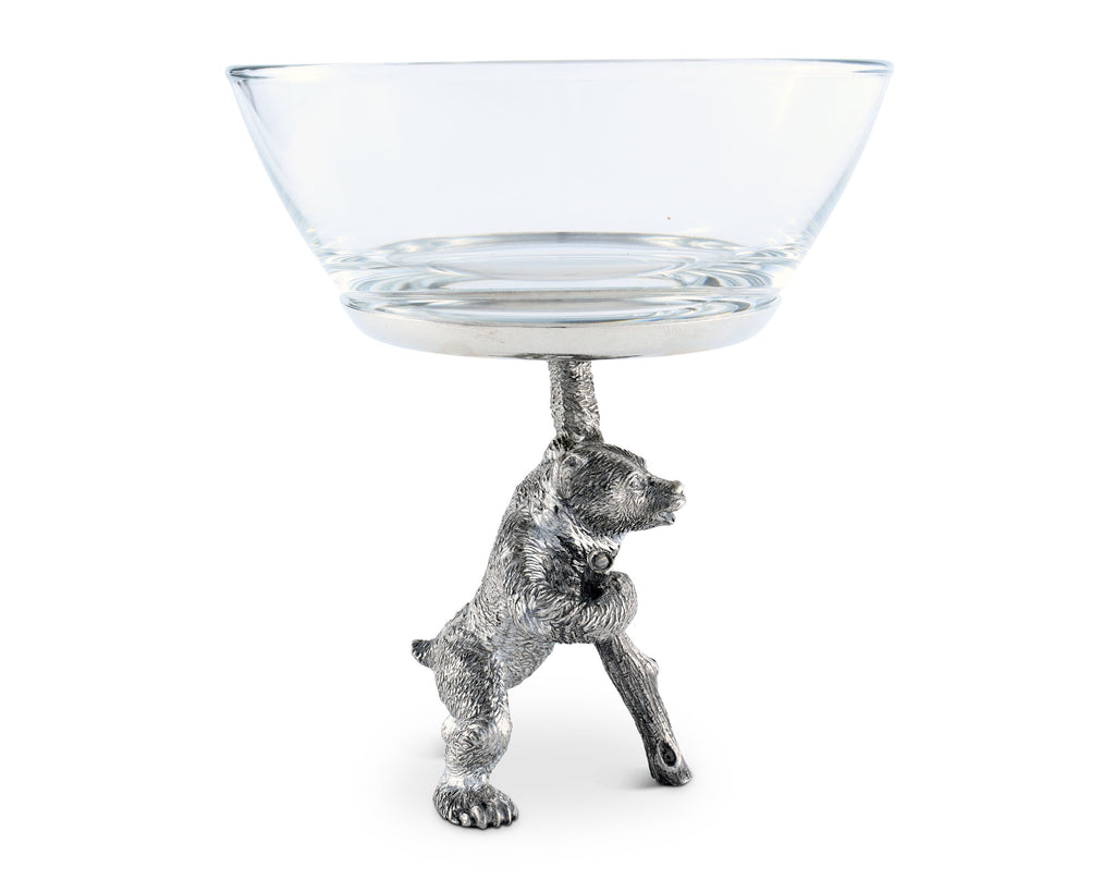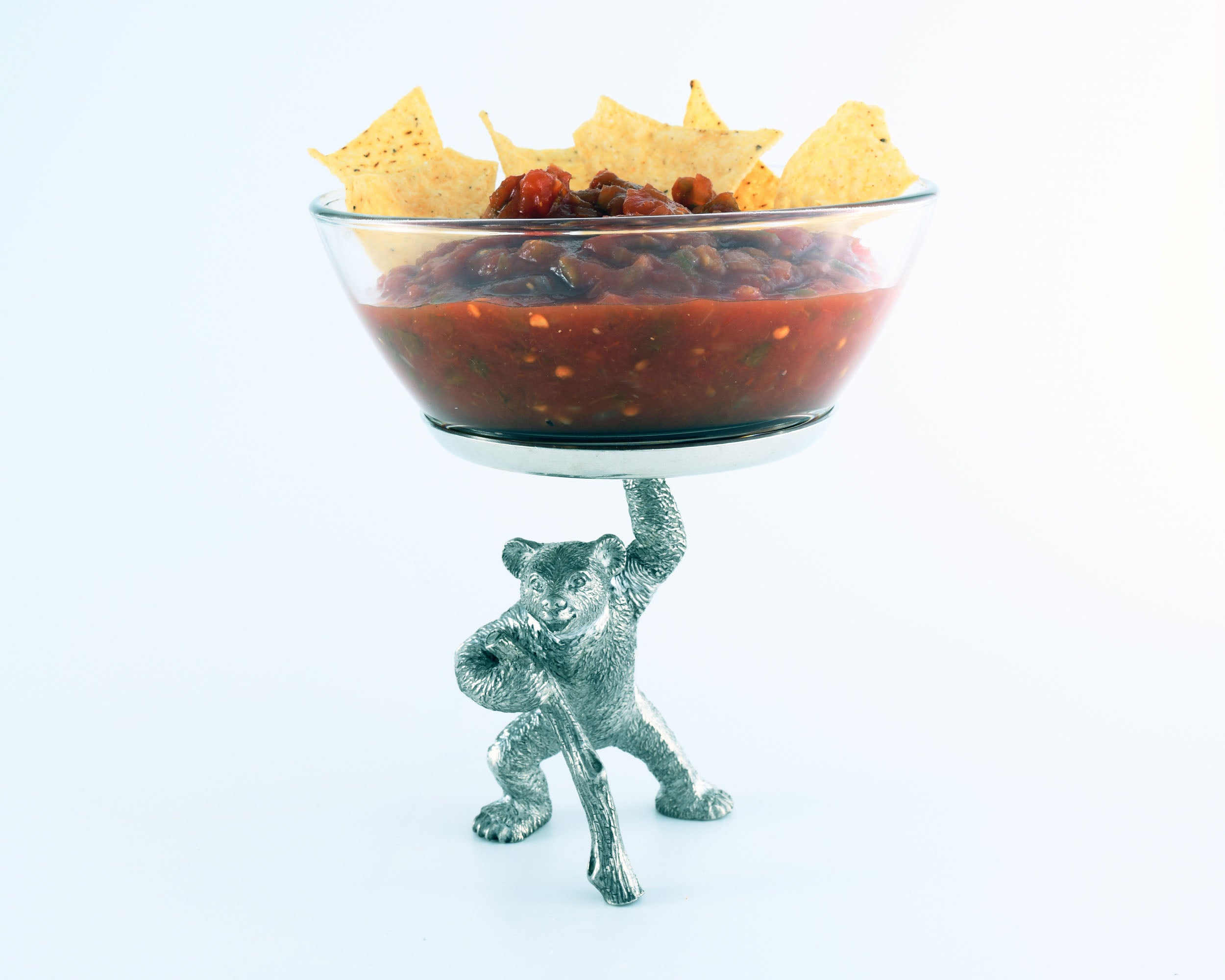 Like a waiter in training, this pure-pewter bear hoists a circular stand into the air with his left arm as his other grips onto a stick for support. Featuring realistic paws and thick, textured hair, the animal looks out playfully as if he's having fun on the job. The removable, glass bowl comes included with this appealing design.