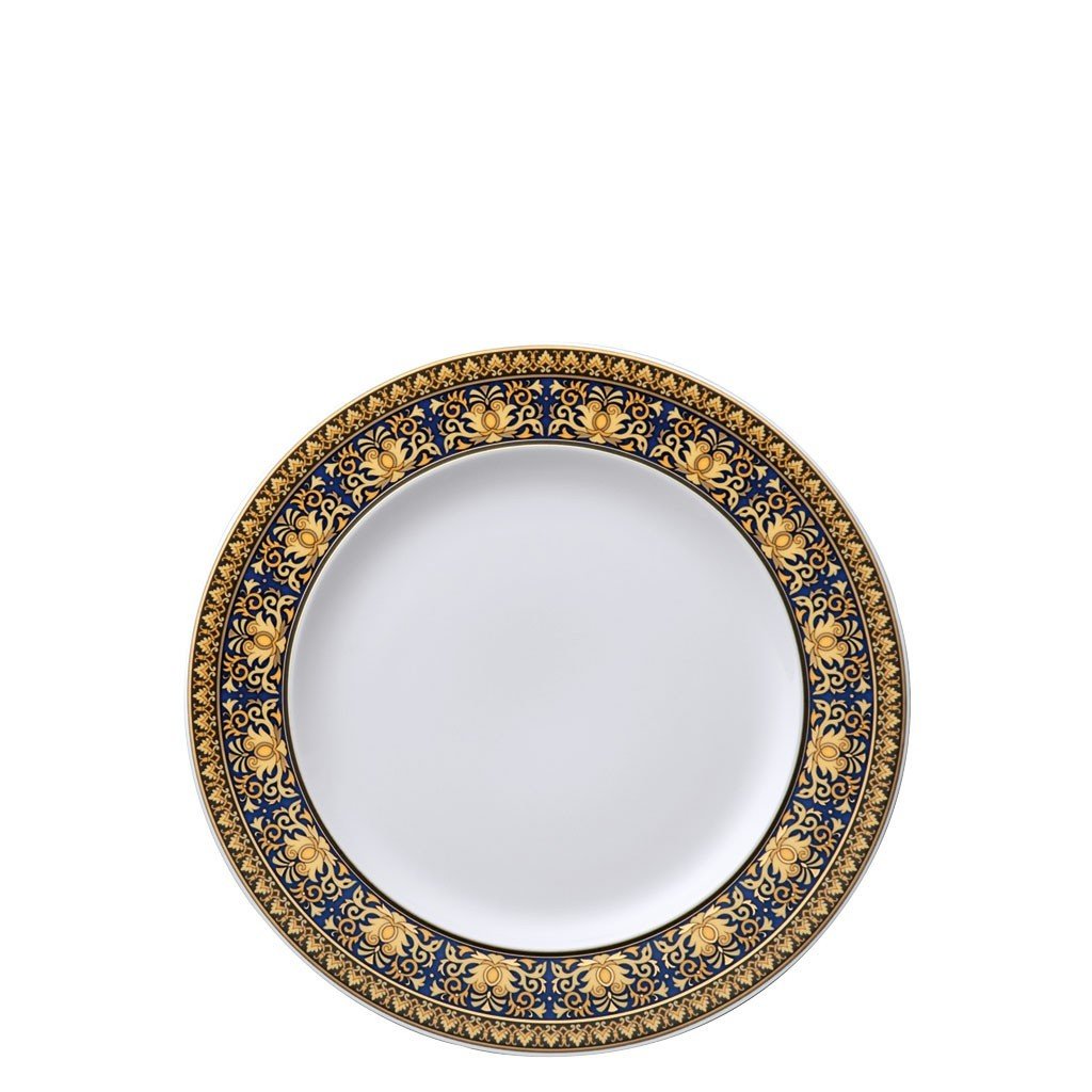 This elegant Versace dinnerware is called Medusa Blue. It is produced using the finest porcelain creating a style that is best described as luxurious and glamorous. The salad plate measures 8 1/2 inch. The most prominent color of this item is blue. Lavish ornaments decorate this piece and make it a must have for everyone in love with opulent design. The salad plate is sold as a single piece.
