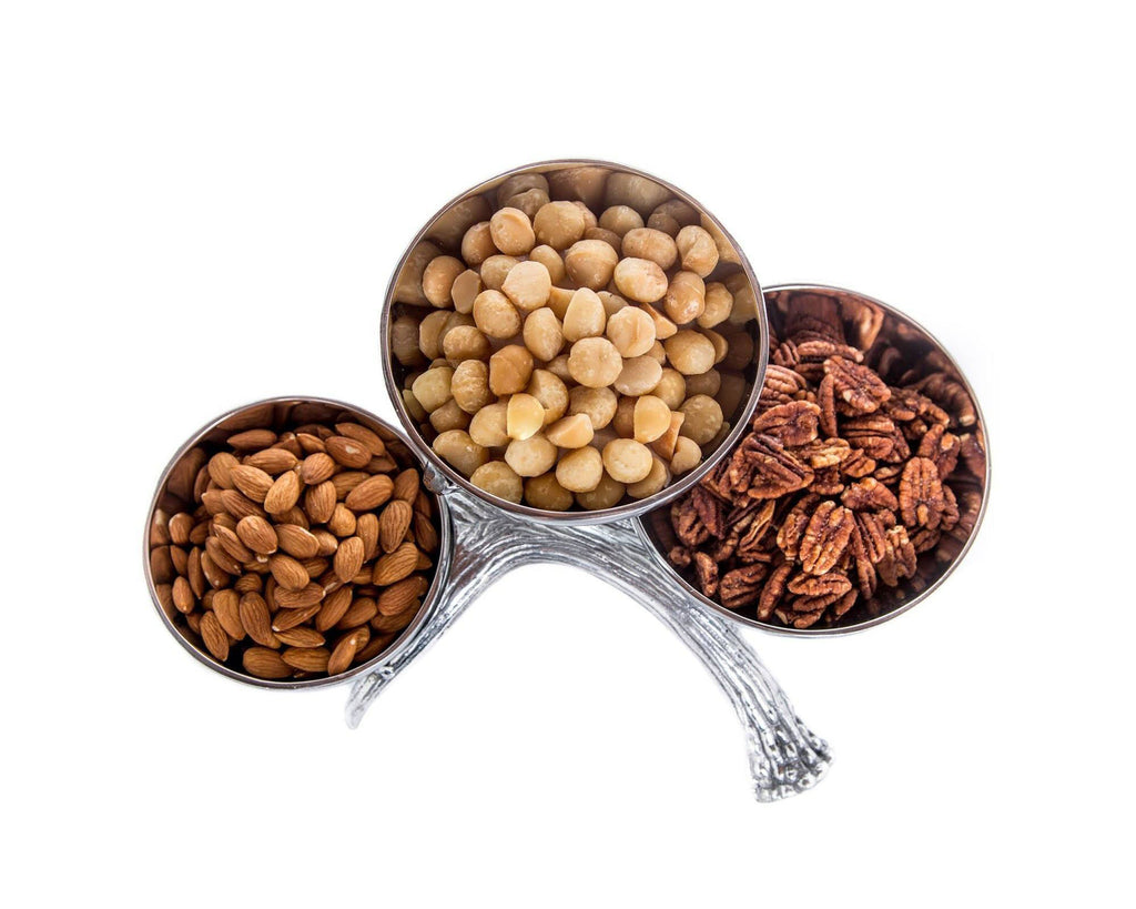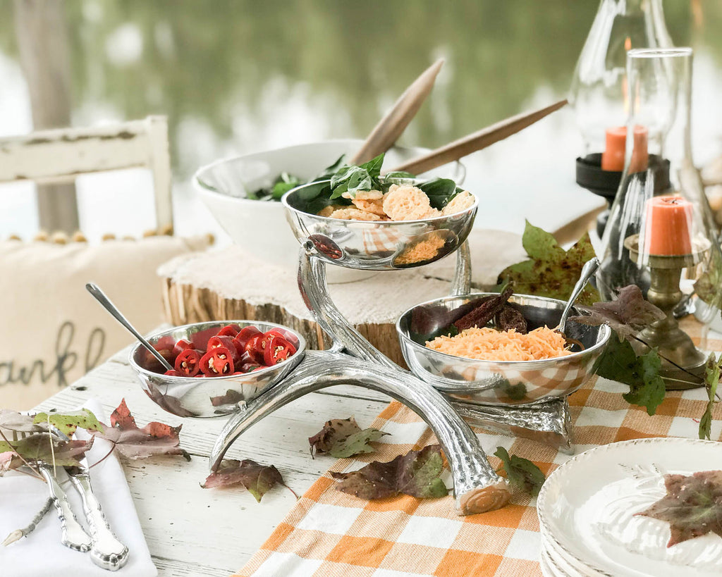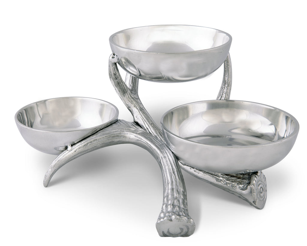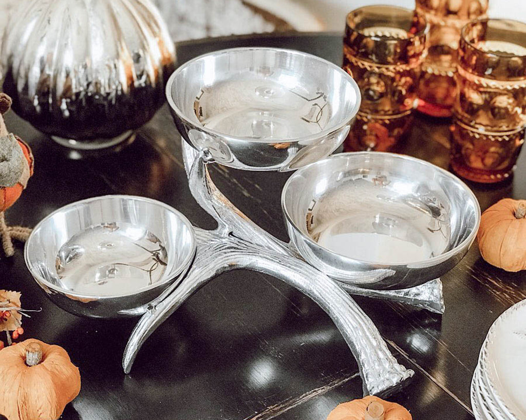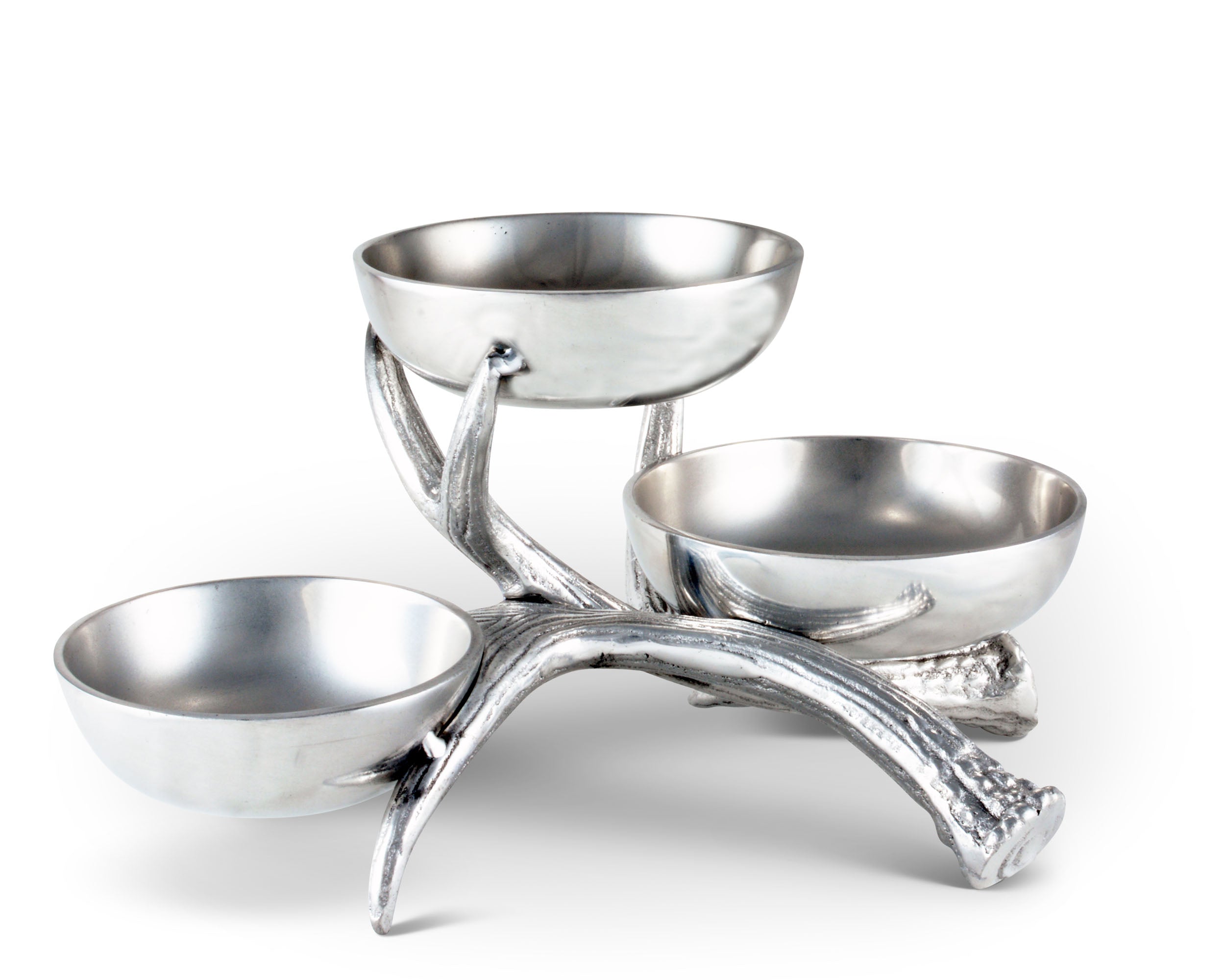 This handmade, aluminum piece features an antler base, with different points of its unique design branching off to support the three dishes. Perfect for nuts, cashews or any finger food, this bowl makes a stylish addition to your serve ware.