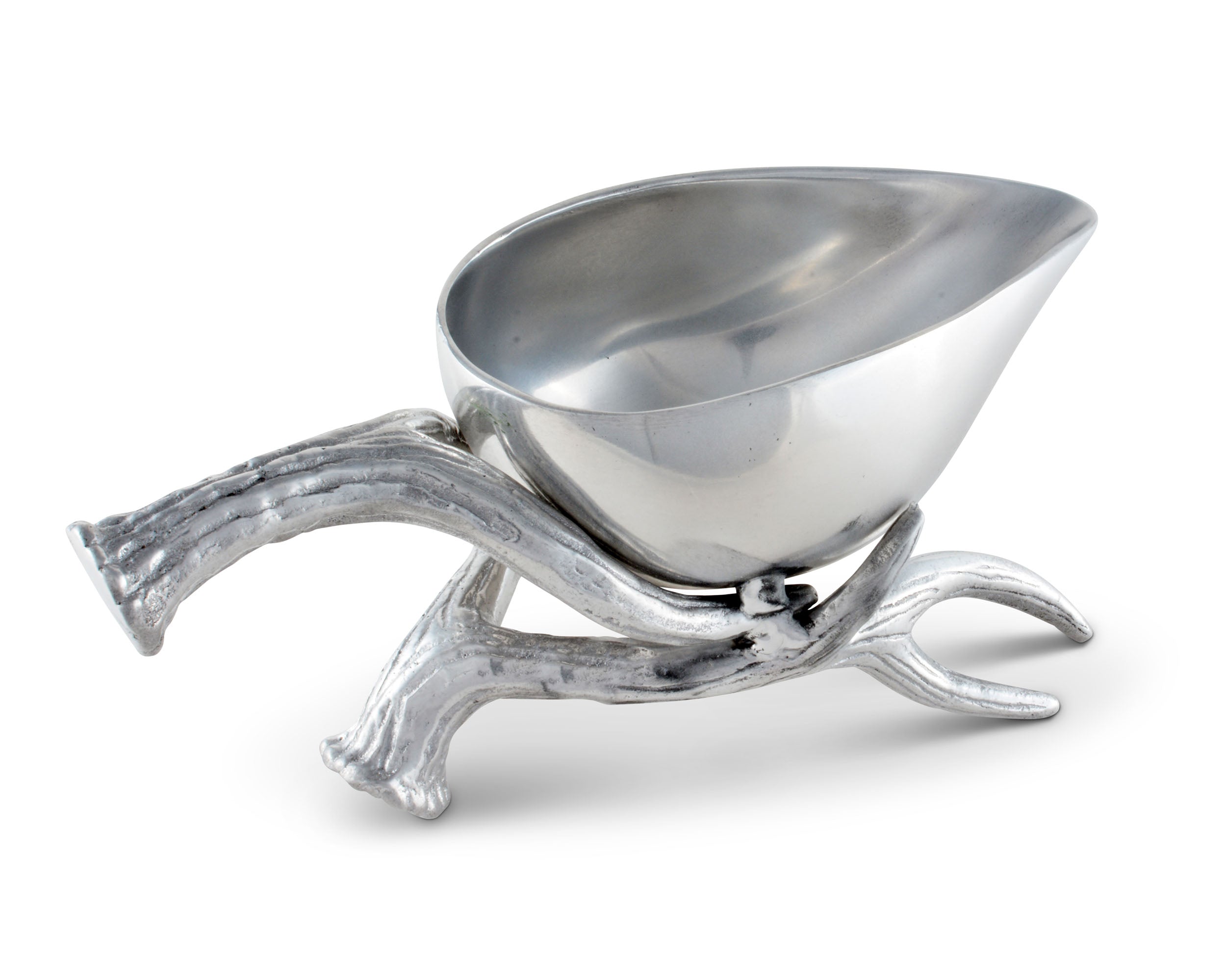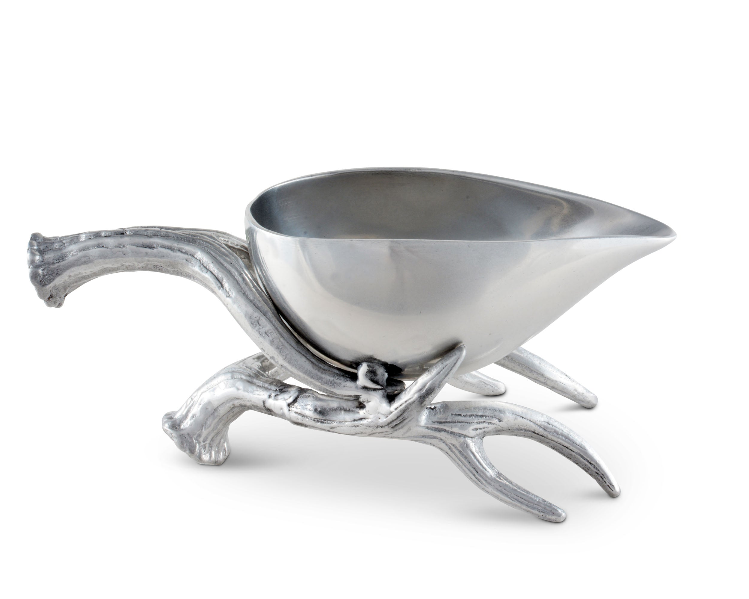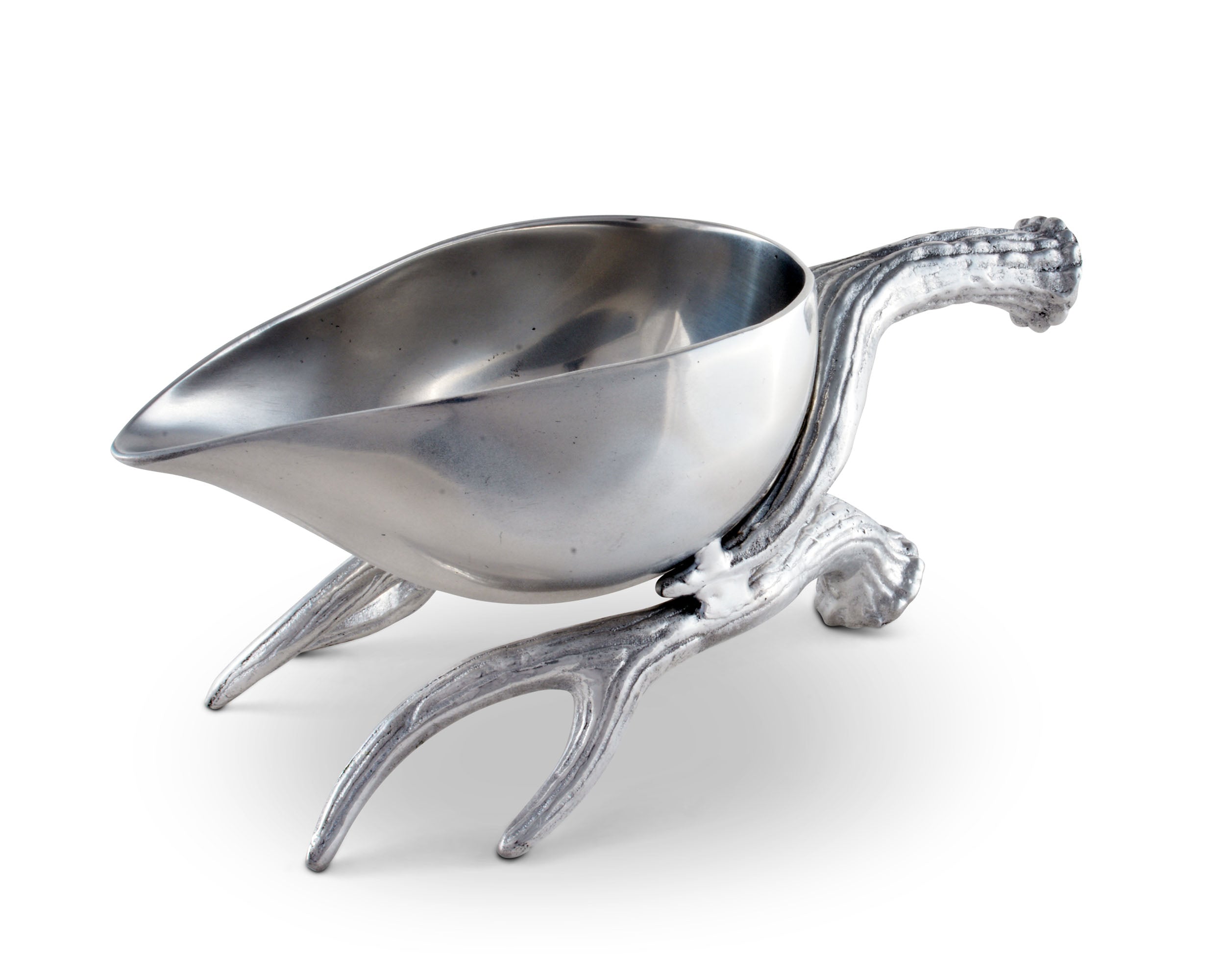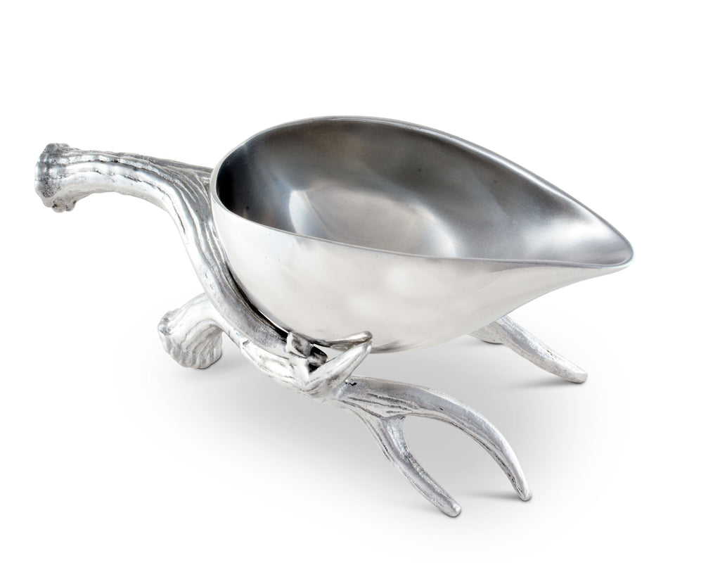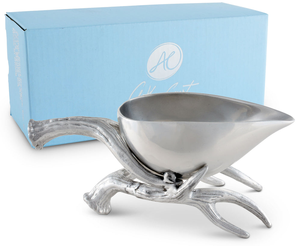 Set a stylish, wilderness-themed buffet for a special occasion with the Antler Motif collection from Arthur Court. Gleaming sand-cast aluminum is carved with detailed relief into a multipronged antler set, completely realistic from smoothly rounded tip to the circular base. Small grooves and dips give this gravy boat a rustic appeal. The antlers themselves create the handle and base of the vessel. The gravy boat itself is cast in one piece, smooth and shined to mirror-quality reflectiveness. Smooth flat "feet" keep your boat firmly on the table. This gravy boat is created from a designer aluminum alloy, intended to remain tarnish-free and approved to be food service compliant by the FDA. To clean this gravy boat, wash by hand with gentle soap and warm water, then immediately towel dry. You may choose to buff your gravy boat with a chamois cloth for extra shine. This boat comes in a gift box, ideal for a wedding registry or housewarming present.