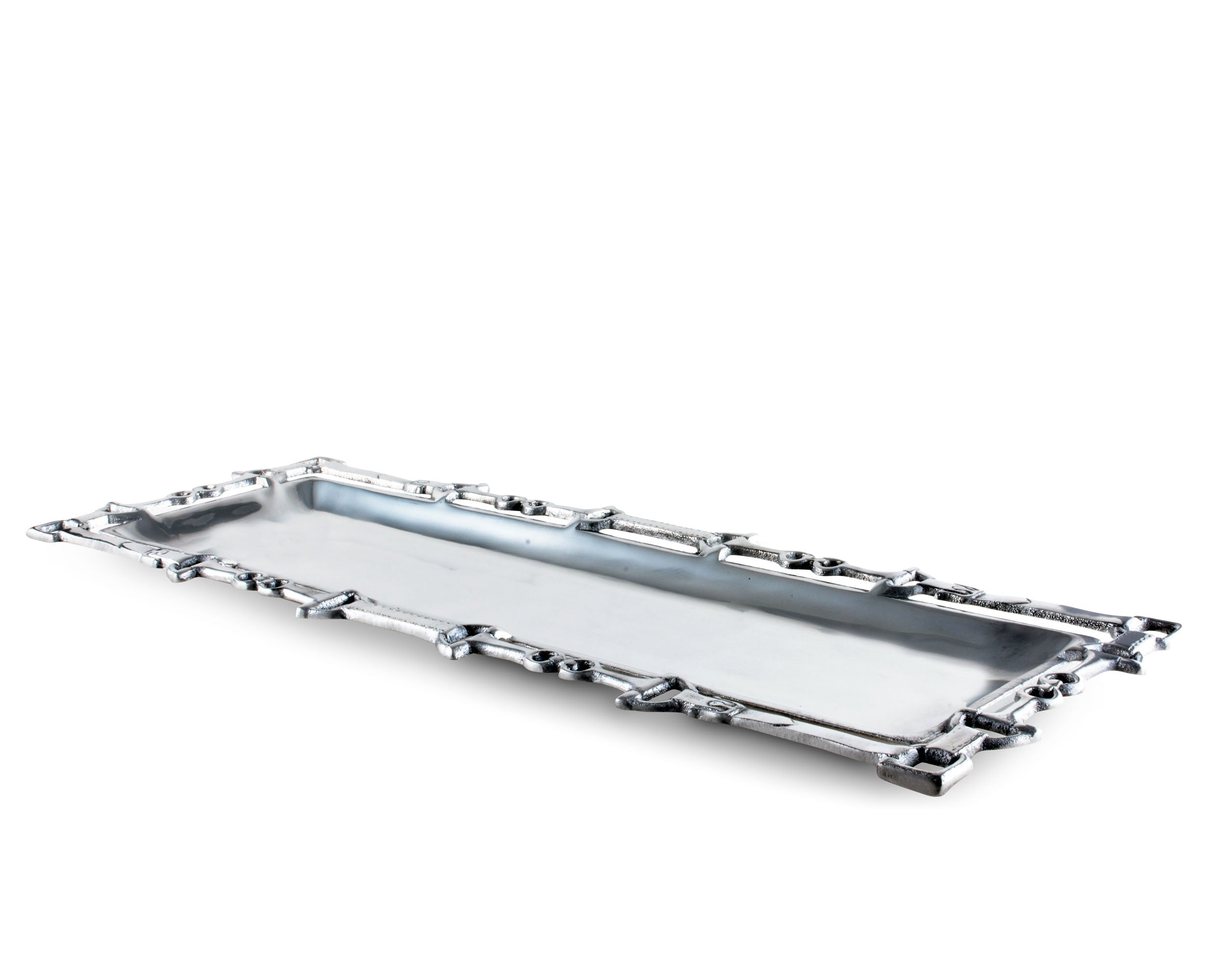 Instead of crafting bits into the edges, Arthur Court's artisans create the edges out of bits in this piece. Leathery straps connect the mouthpieces together as they surround the lustrous interior of this handmade, aluminum piece.