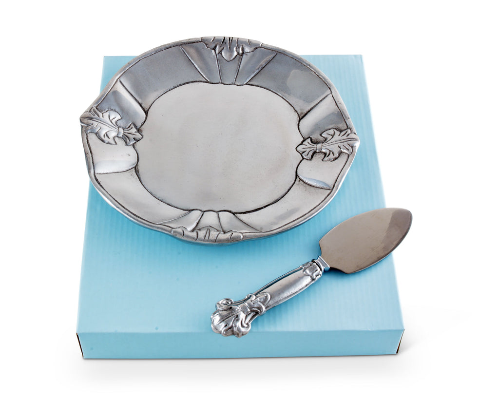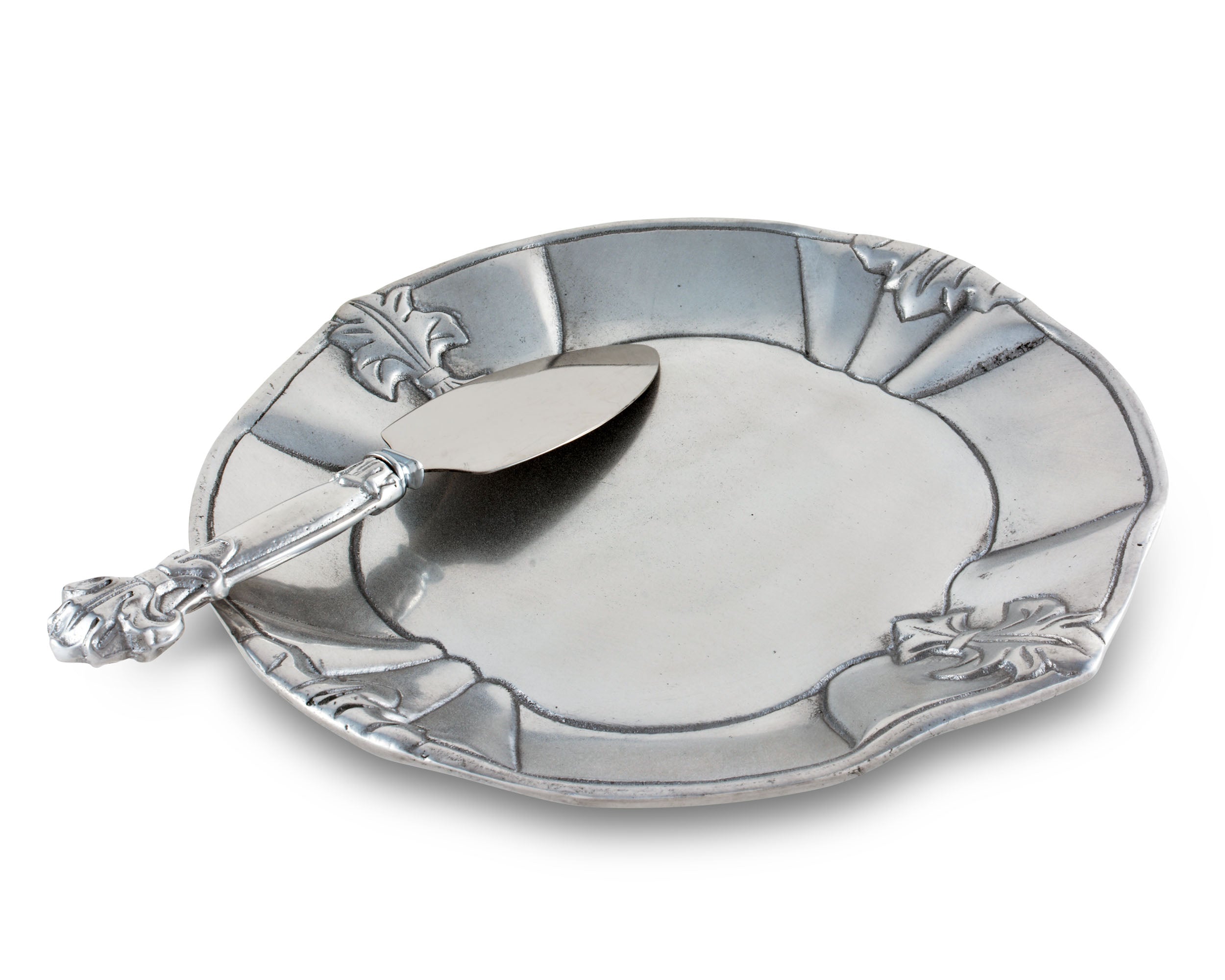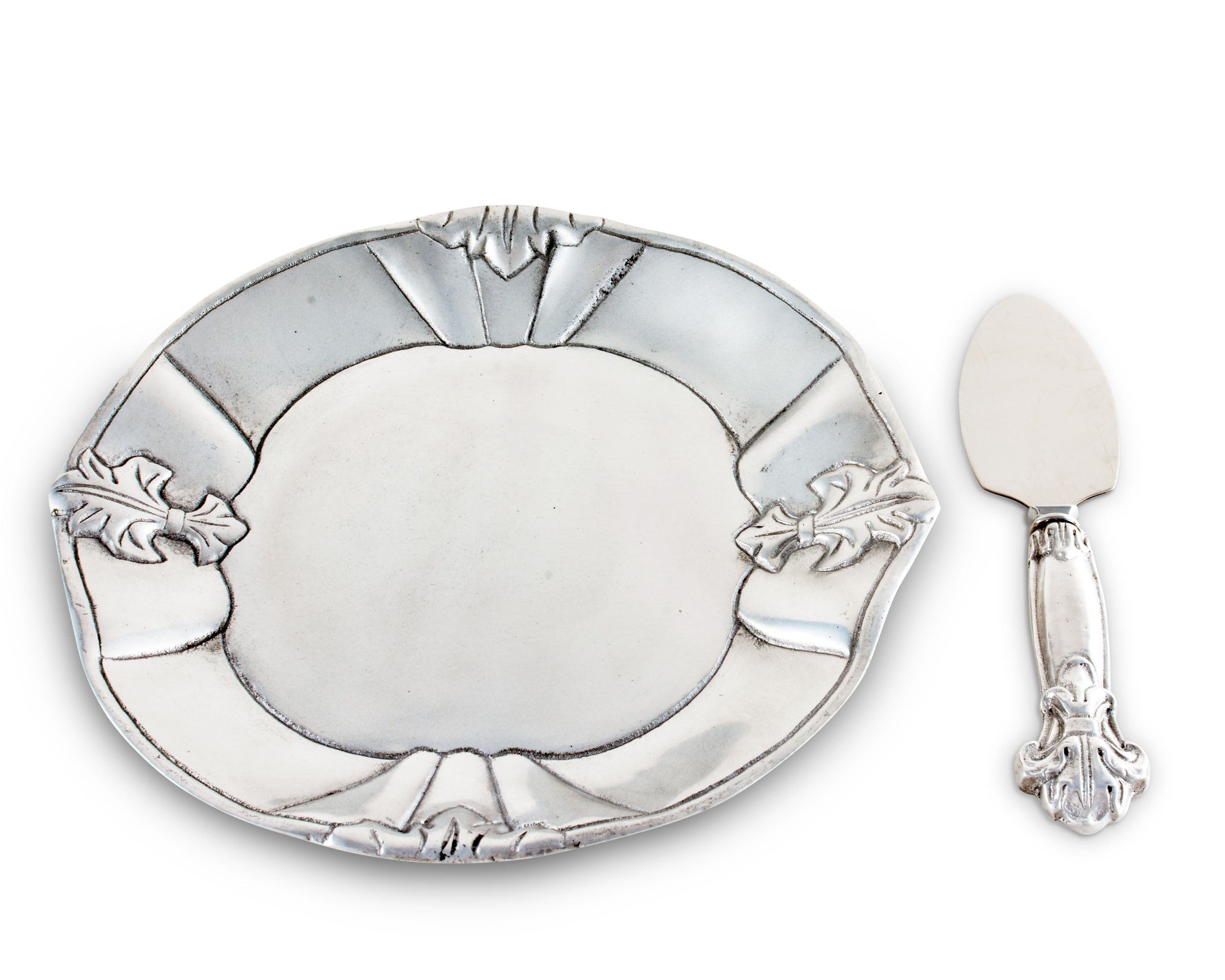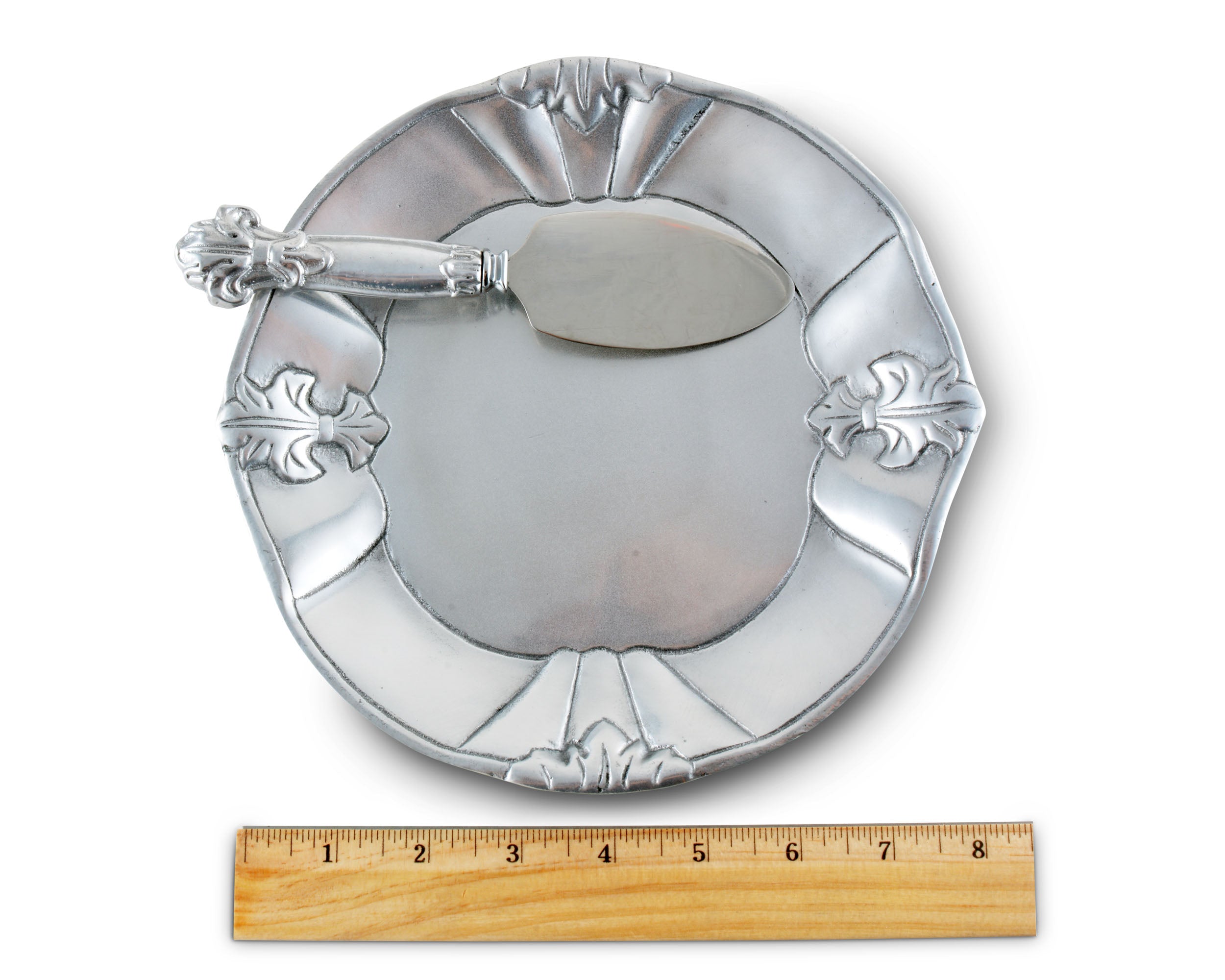 Make dessert an affair to remember by serving it on this fleur-de-lis plate and server set from Arthur Court. Ideal for divvying up everything from decadent Bundt cake slices to premium cheese selections, this opulent, French-inspired set features an 8-inch-diameter plate and sturdy serving knife for easy function and a cohesive look on your coffee table or buffet. Intricate fleur-de-lis detailing around the edge of the plate and on the handle of the server imbues this set with regal appeal. Rely on the silver finish to add a classic element to dinner parties, family dinners and holiday gatherings. The plate is made of hand-polished aluminum alloy for shine and durability, and the server handle shares that build while supporting a strong stainless steel blade for effortless slicing. Just hand wash and dry both pieces after your event ends for fuss-free care. This fleur-de-lis-adorned set comes boxed to simplify gifting at housewarming parties, wedding showers or anniversary celebrations.