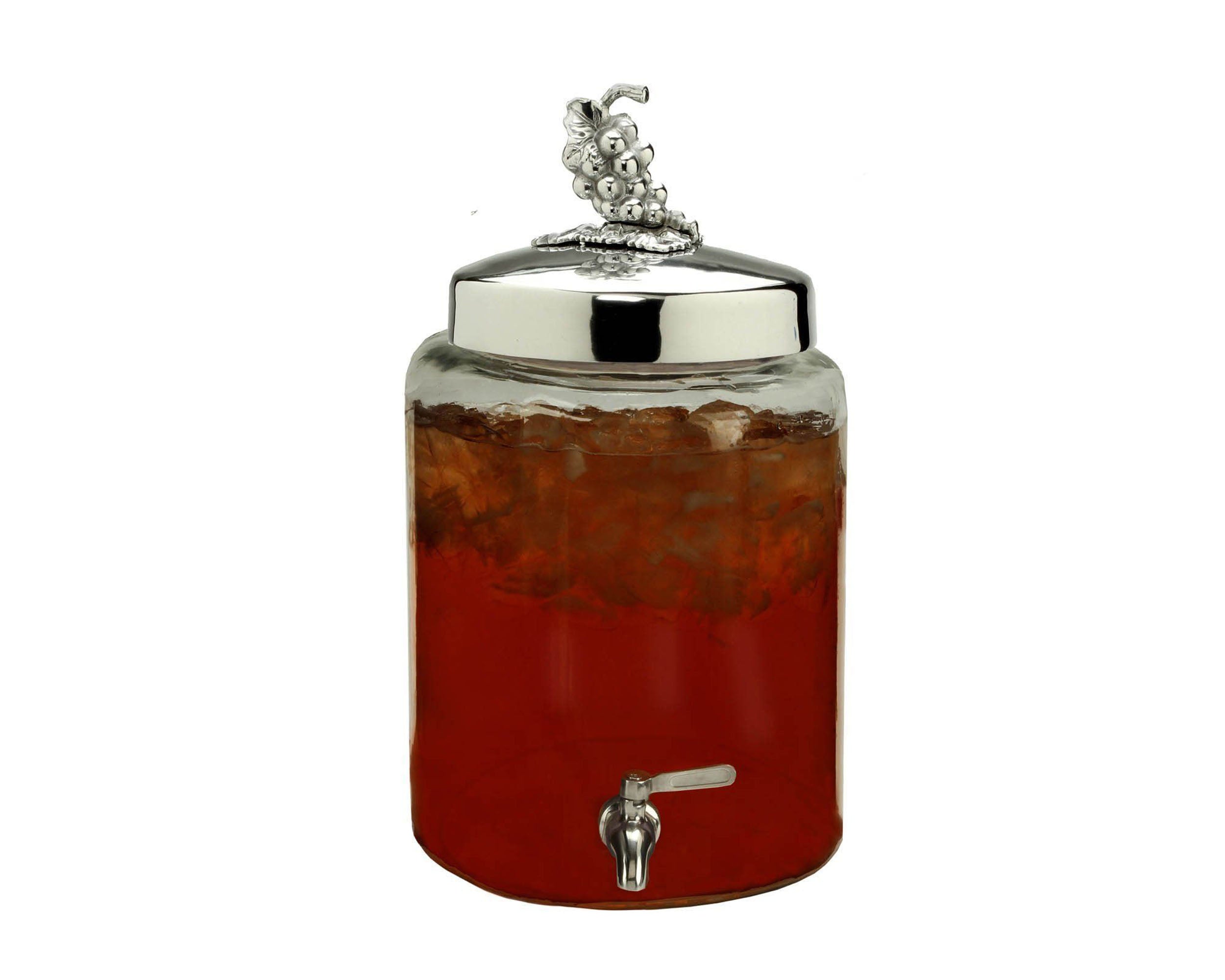 Topping the highly polished, signature aluminum alloy lid of is a figural bunch of grapes that act as a handle. The jar of Arthur Court's generously sized, 2-gallon beverage server is crafted from recycled glass. A stainless-steel spout allows for easy self-service.
