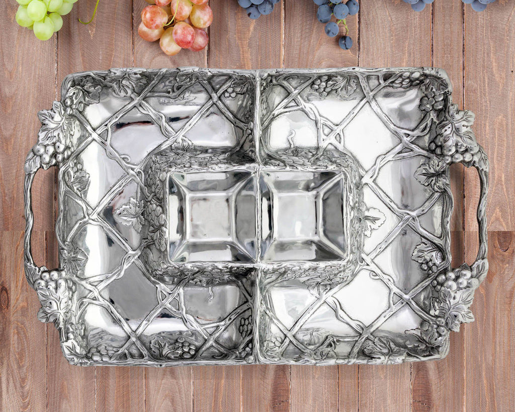A chain-link pattern covers the surface of this piece as grapes and leaves create intricate designs around the vine squares. More fruit motifs adorn the centralized bowls, raised edges and vinyl handles of this handmade, aluminum tray.