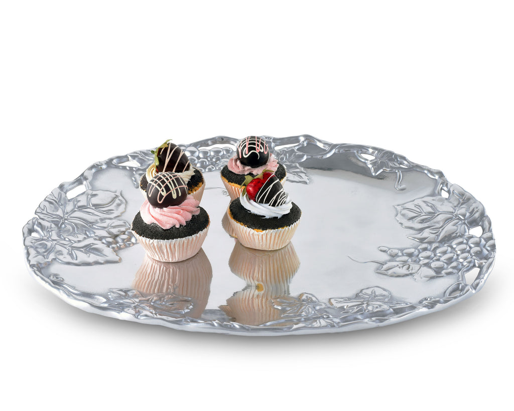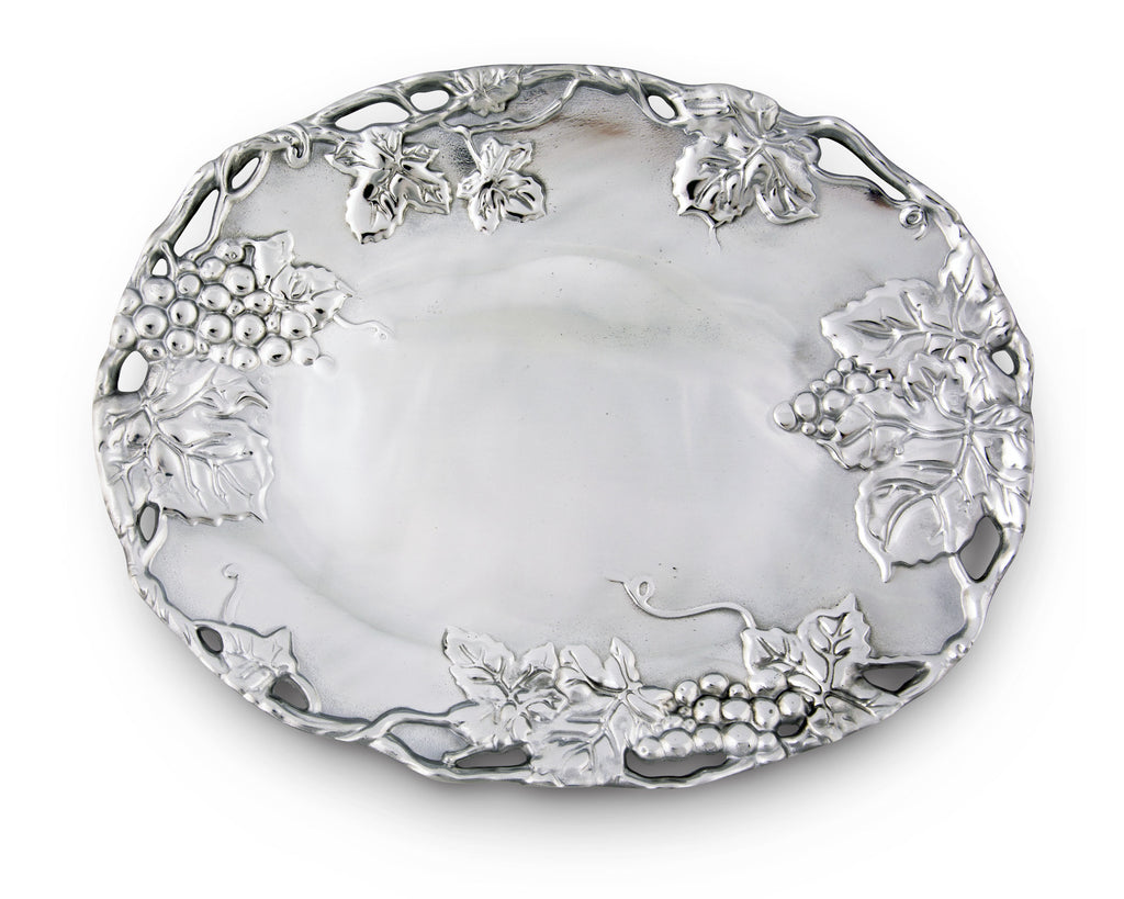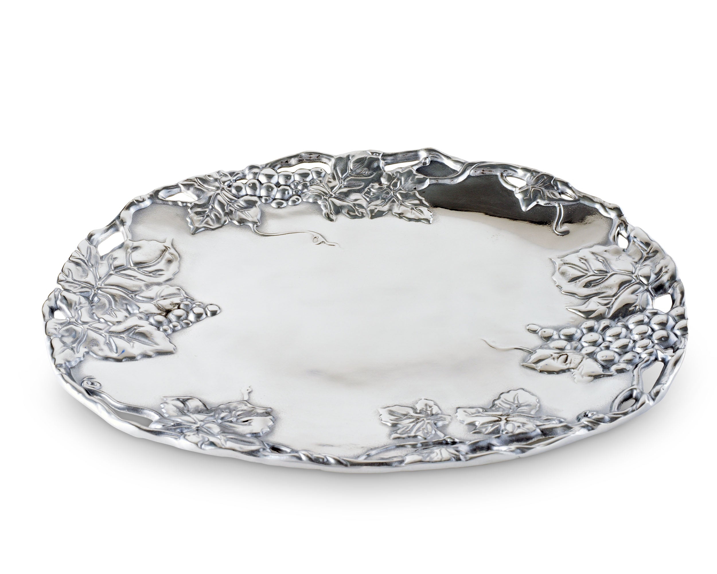 A layered vine creates the openwork border of this dish as bundles of grapes and leaves mingle just inside the edge. The incredible definition within each veiny blade and piece of fruit gives this handmade, aluminum platter a realistic appeal.