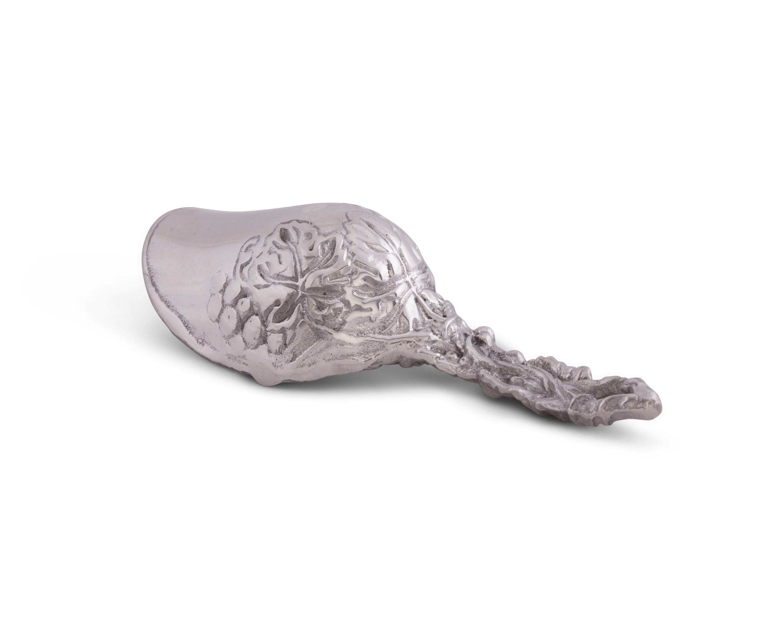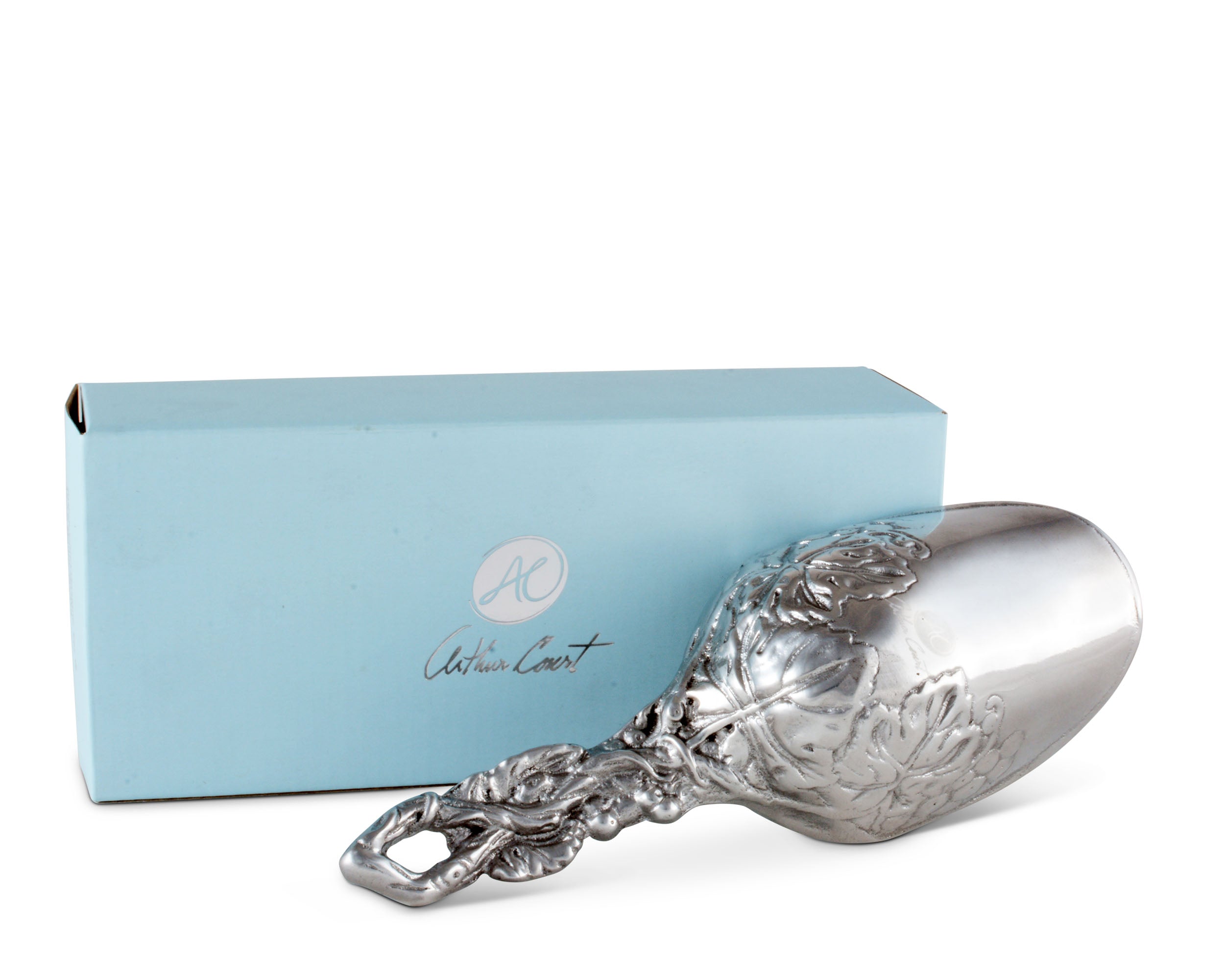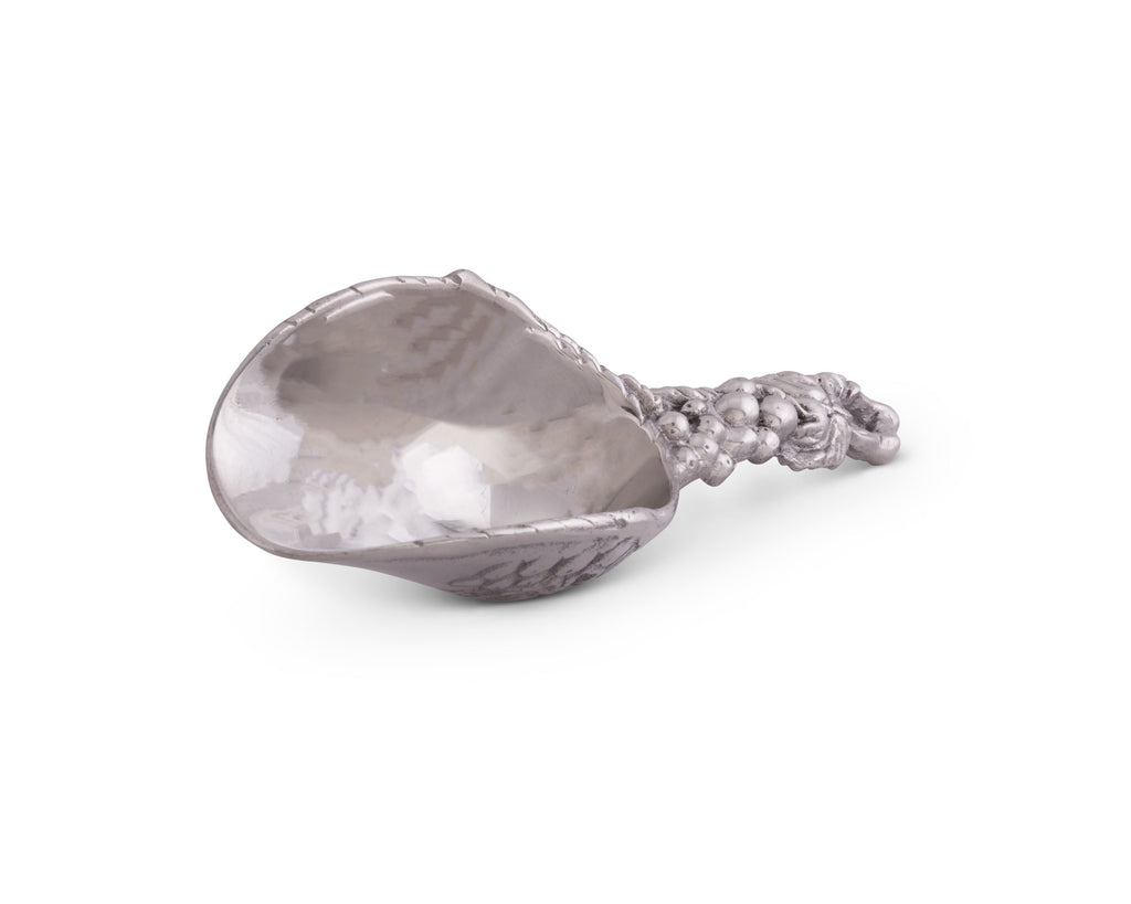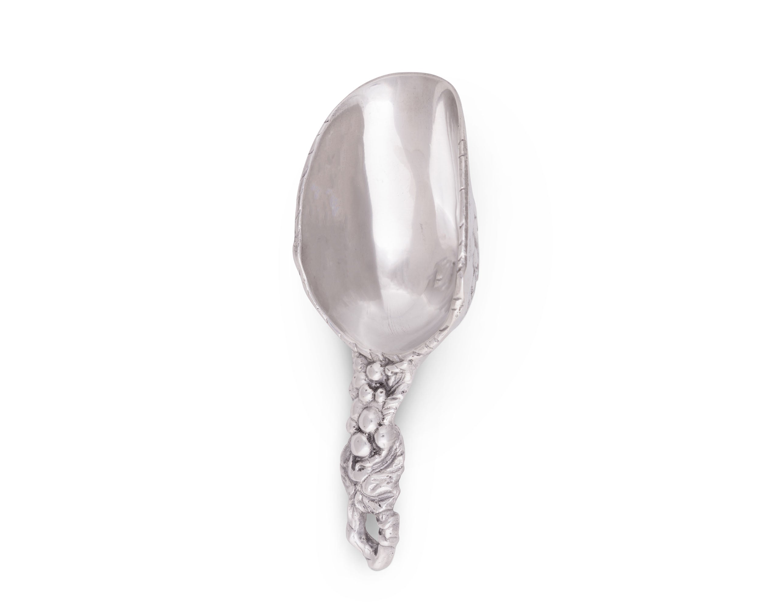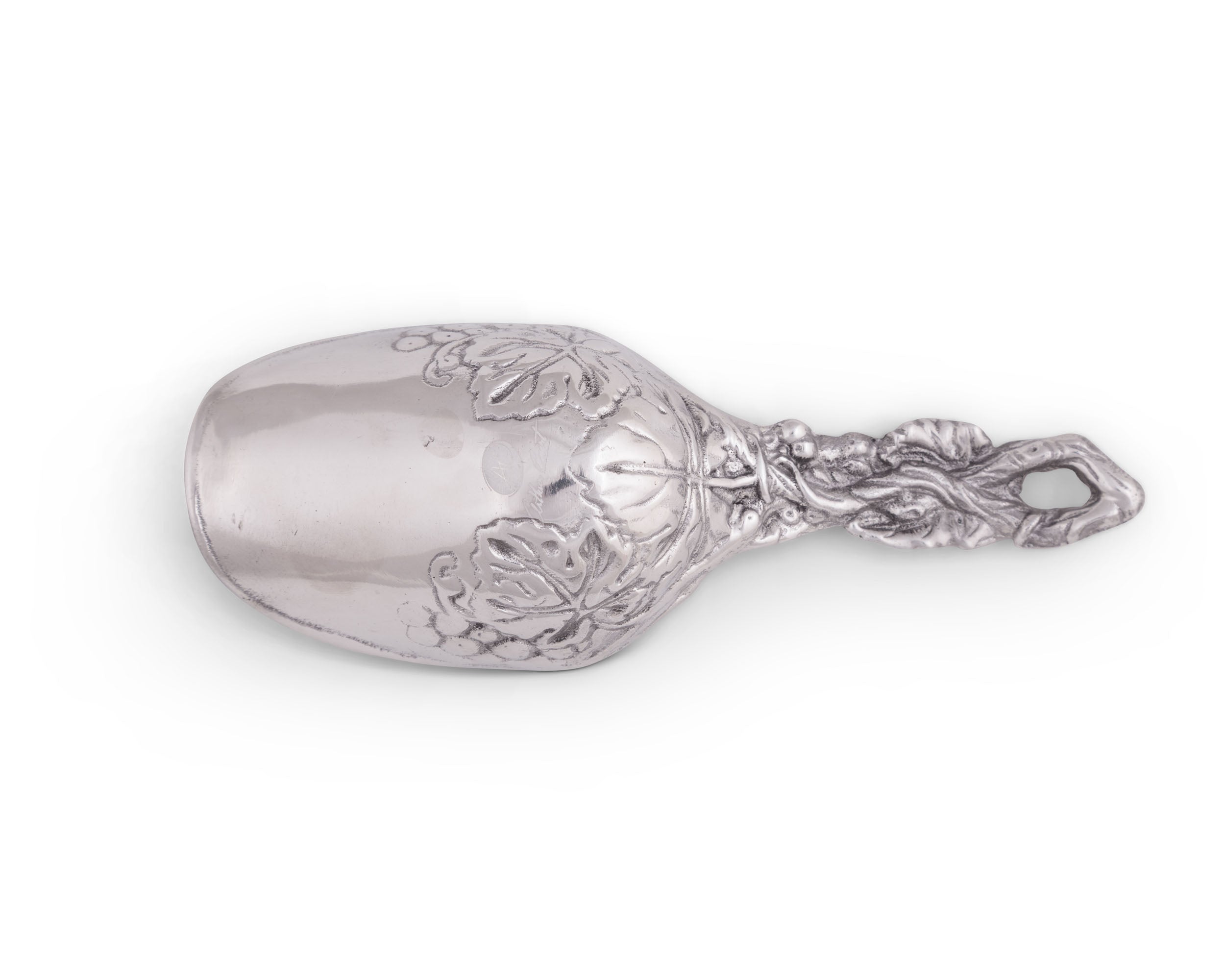 The grape motif of this practical ice scoop is signature of Arthur Court. Measuring 8 inches in length, the ice scoop is created in sand-cast aluminum. Functional and decorative, it makes serving drinks easy for the fastidious host or hostess. The handle is long enough to insure a firm grip.