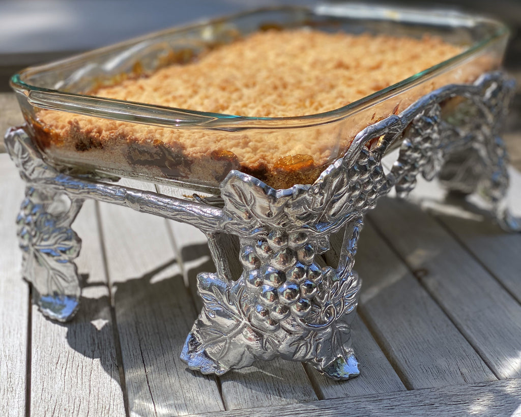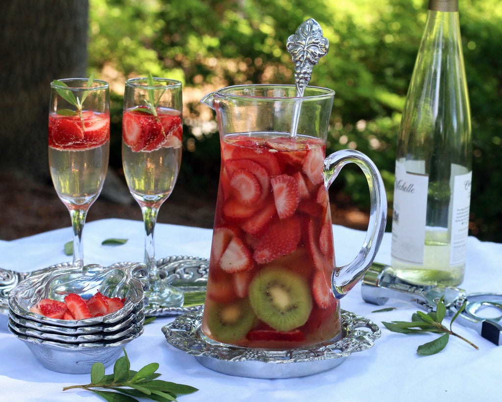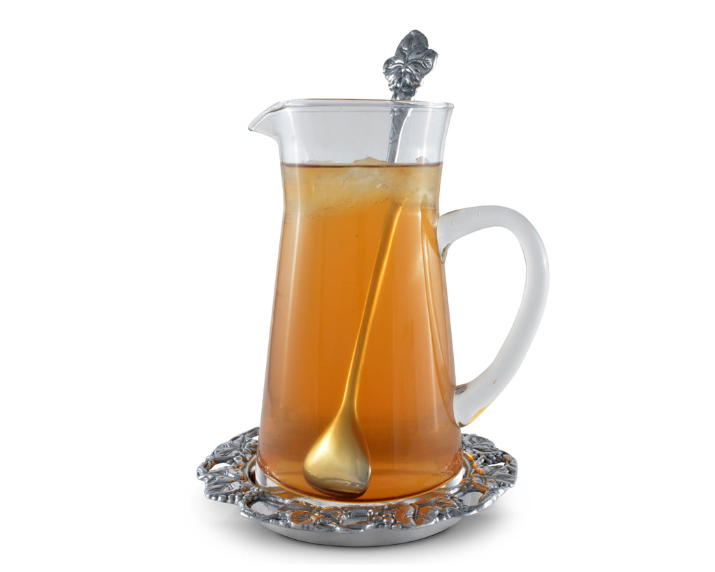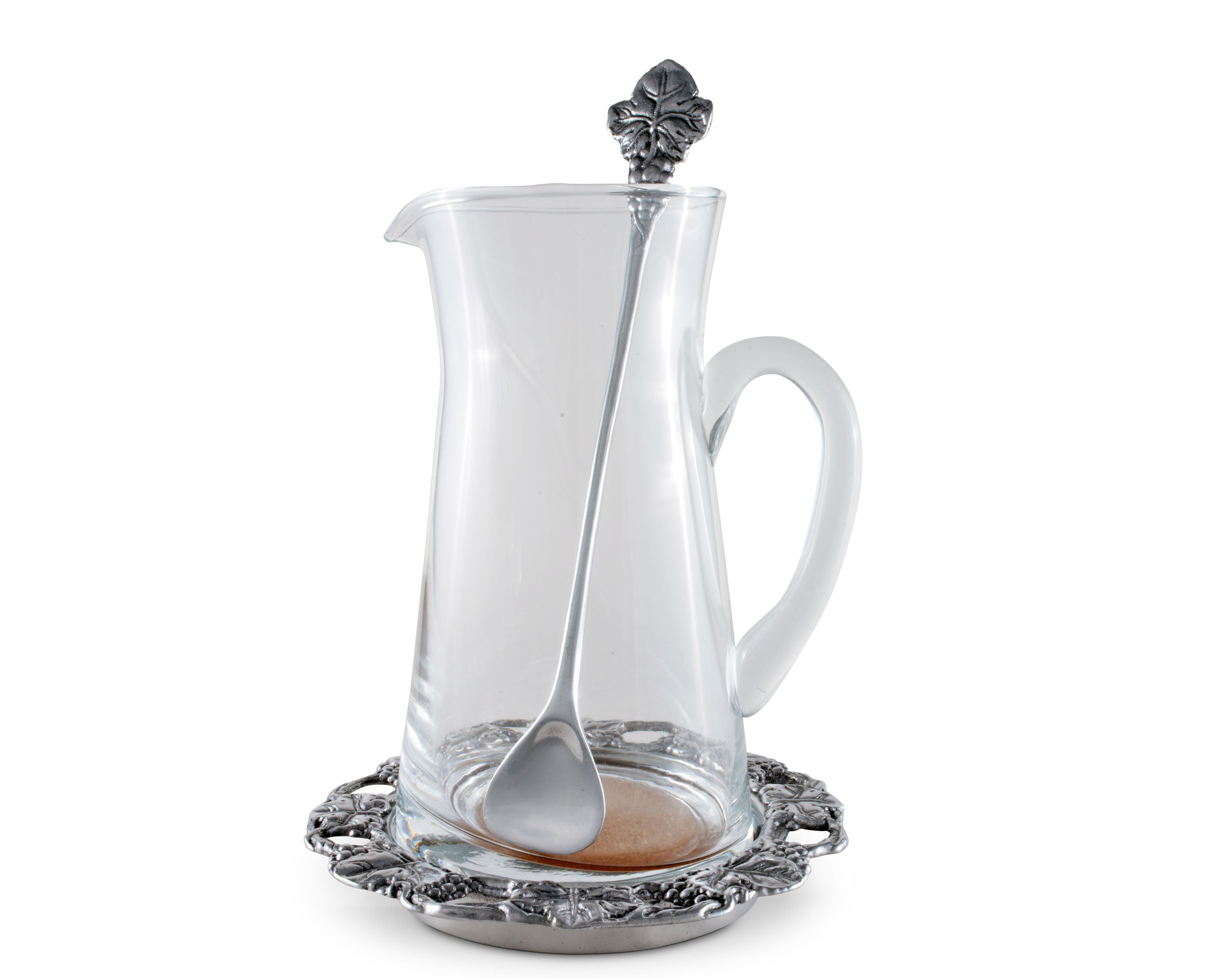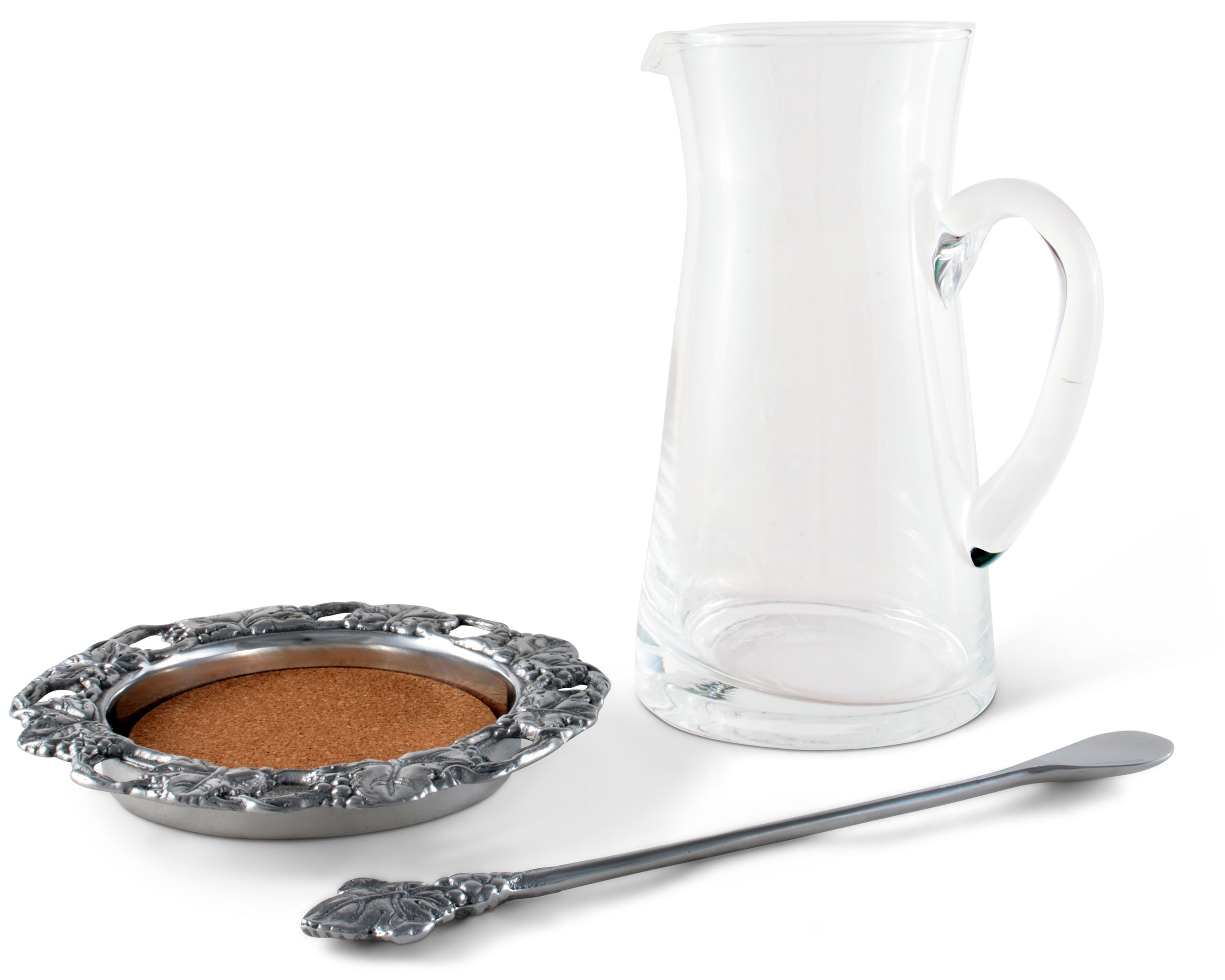 Make your next gathering an elegant affair with this expertly hand-crafted aluminum Grape Pitcher Set. It includes a generous-sized pitcher, a cork coaster protects table tops. Grapevine detailing is echoed on the stirrer. From Orange juice to Martini's, you will use this pitcher again and again.