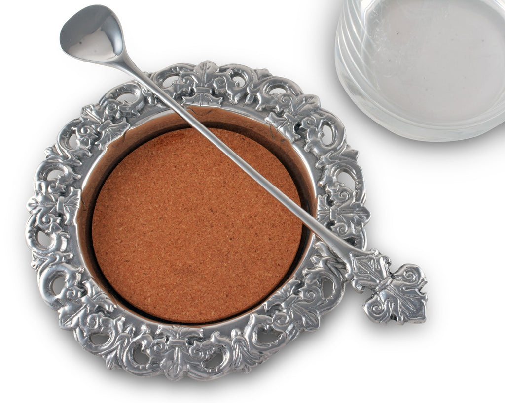 Leaves, vines and bundles of grapes combine to form the piece's openwork base, while a similar motif forms the stirring ladle's handle. The handmade, aluminum design displays a brilliant luster against the glass and removable, cork coaster.