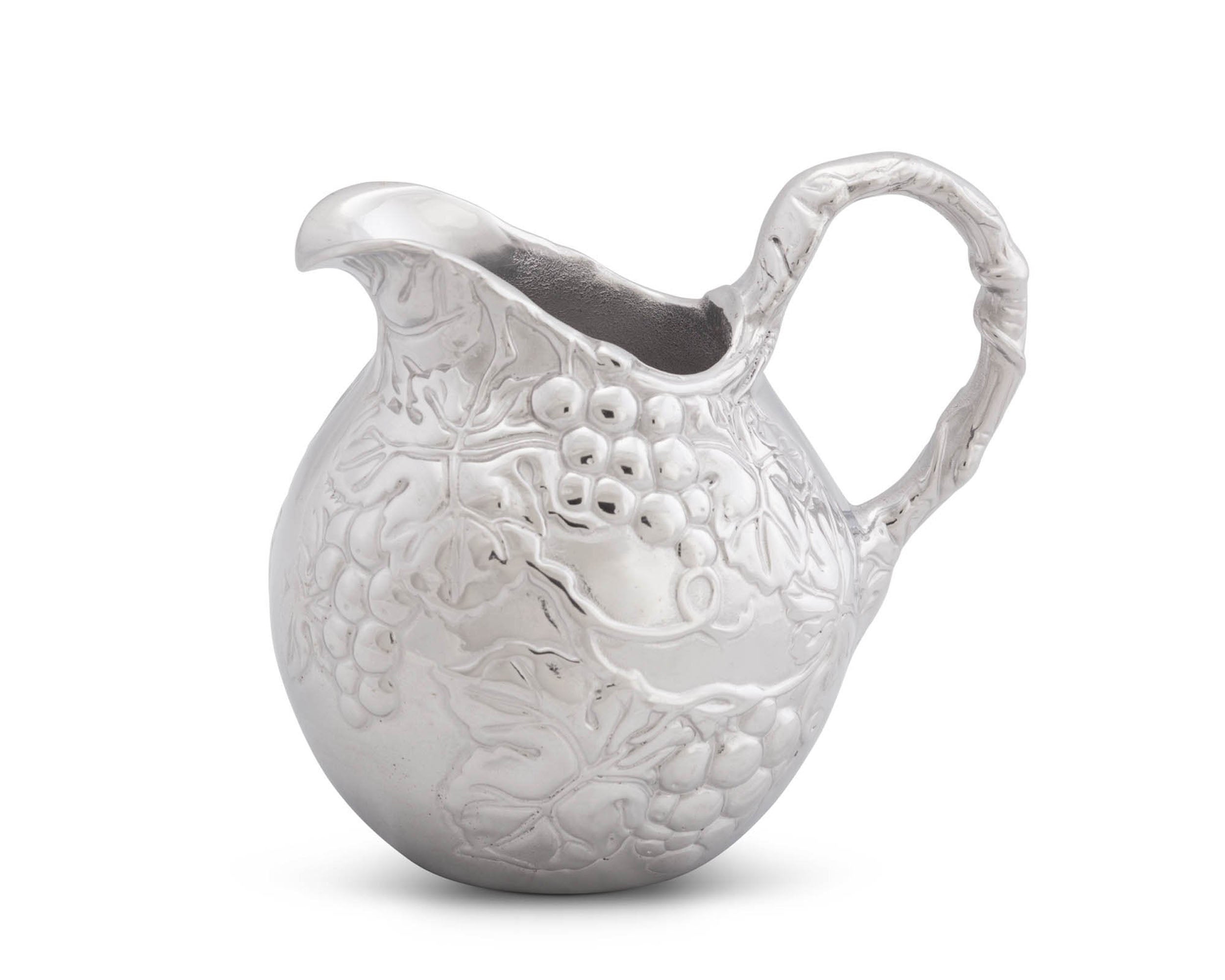 Bundles of grapes and leaves display beautifully on the piece's body, while thick, swishing vines fill in these designs and form the handle. The handmade, aluminum pitcher's spout curves up before opening into a lip for an easy pour.