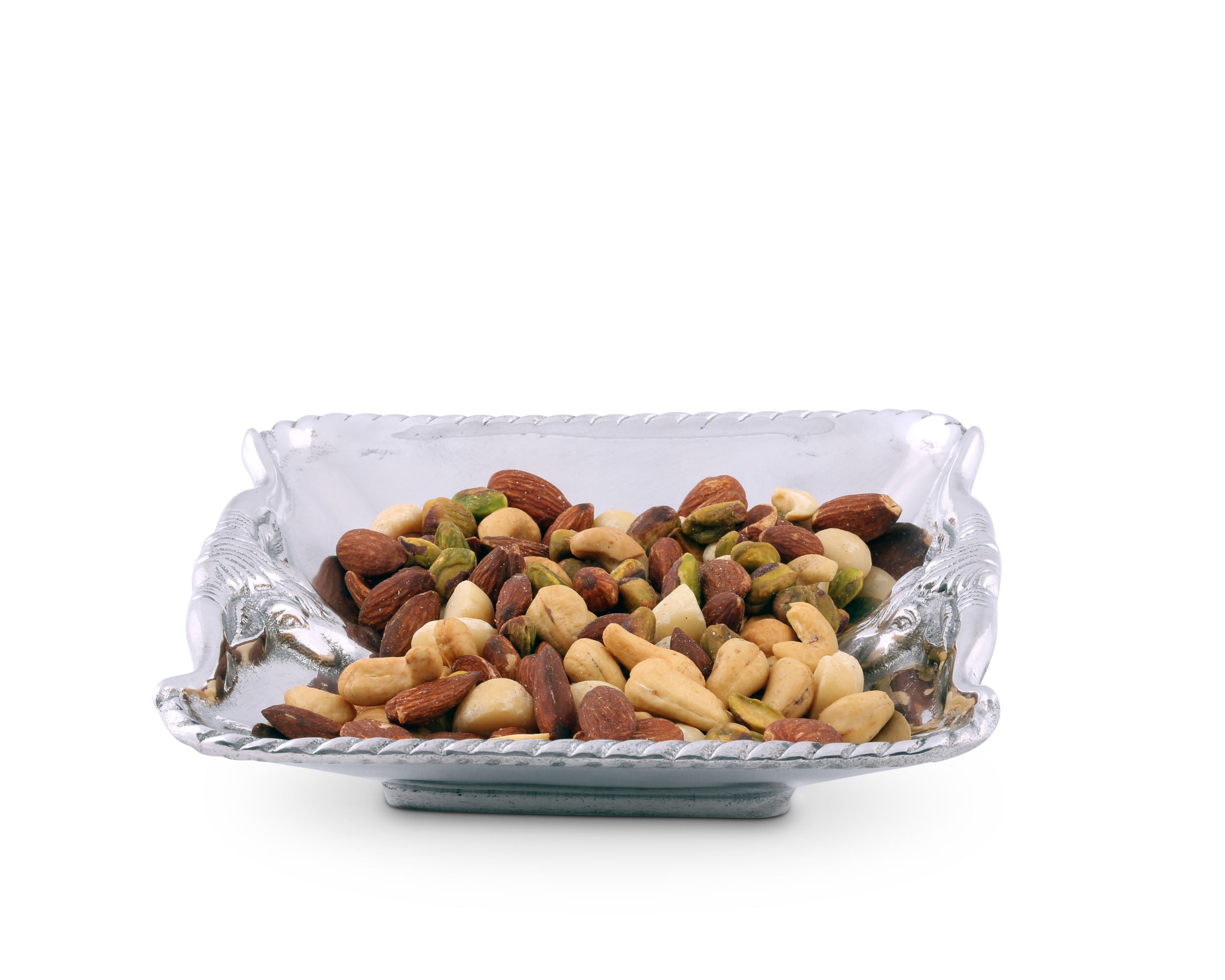 Intense steers face each other as two sides of this sand-cast piece take on the form of their horns. The extended U-shape of these features interrupts the ropy pattern that borders the edge of this handmade, aluminum bowl.