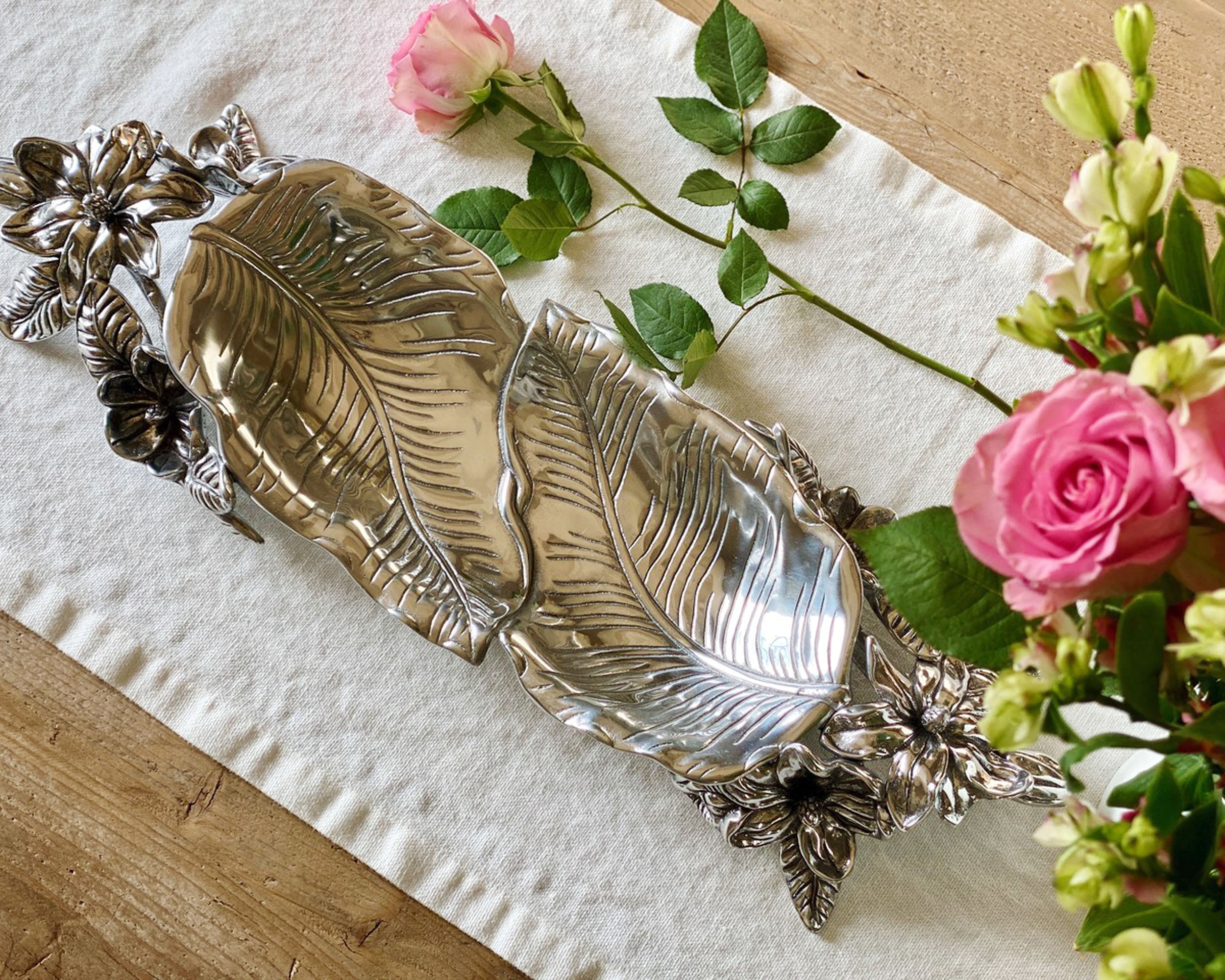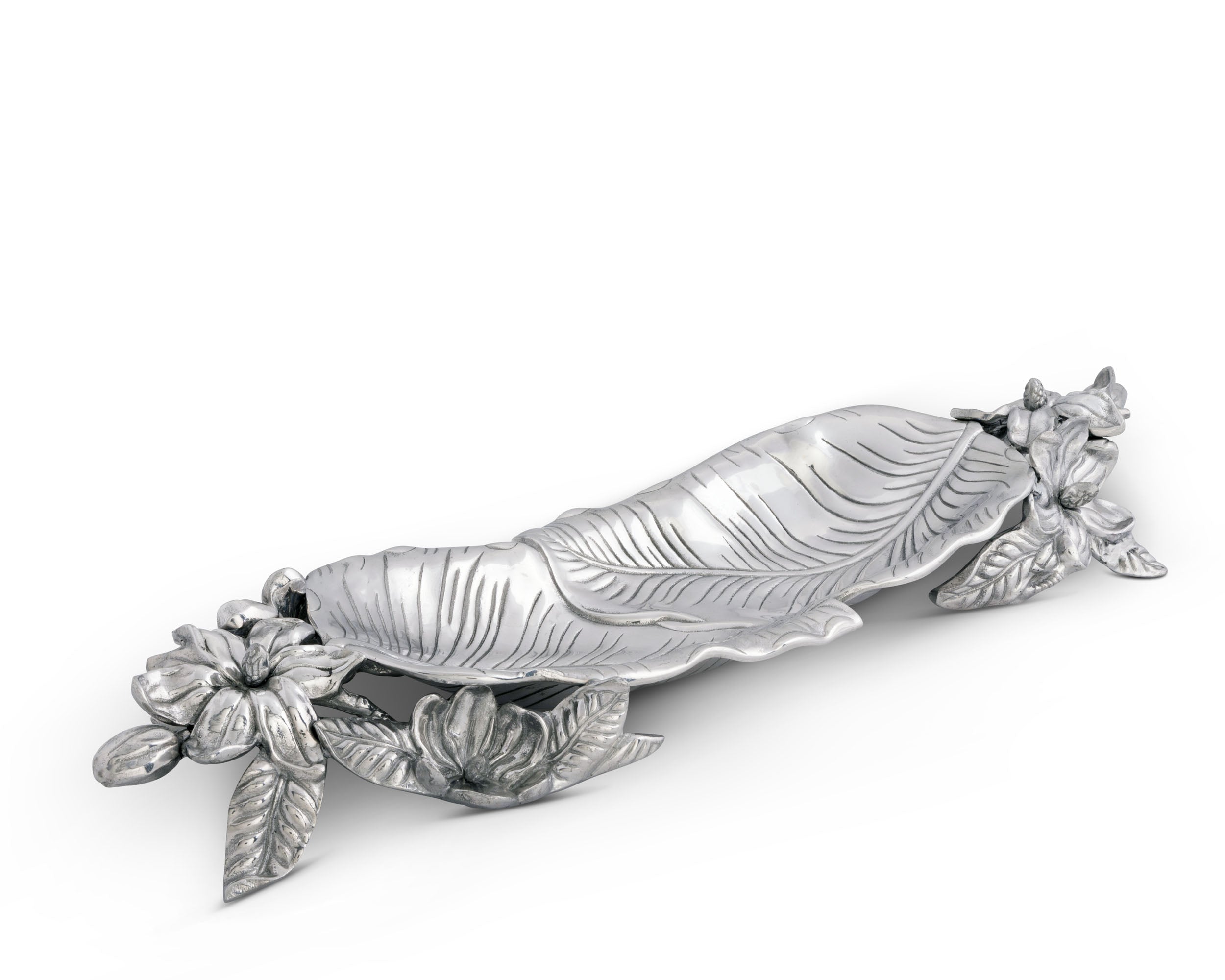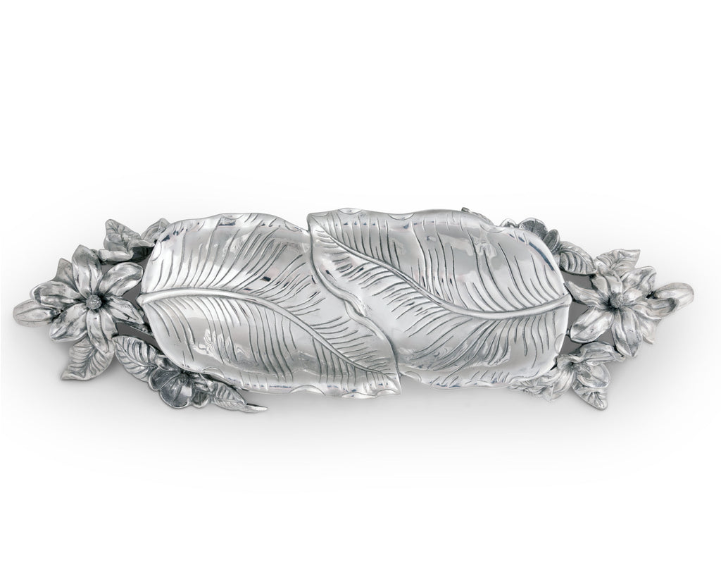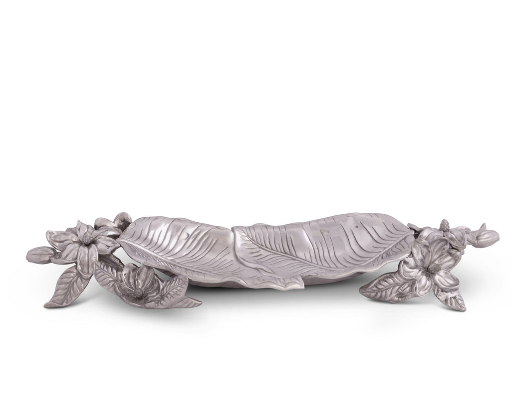 An elegant arrangement of magnolias and plants form fashionable handles for this elevated dish, while large, overlapping leaves create the detailed basin. Arthur Court's handcrafted, sand-cast aluminum reflects the remarkable definition within each of these designs.
