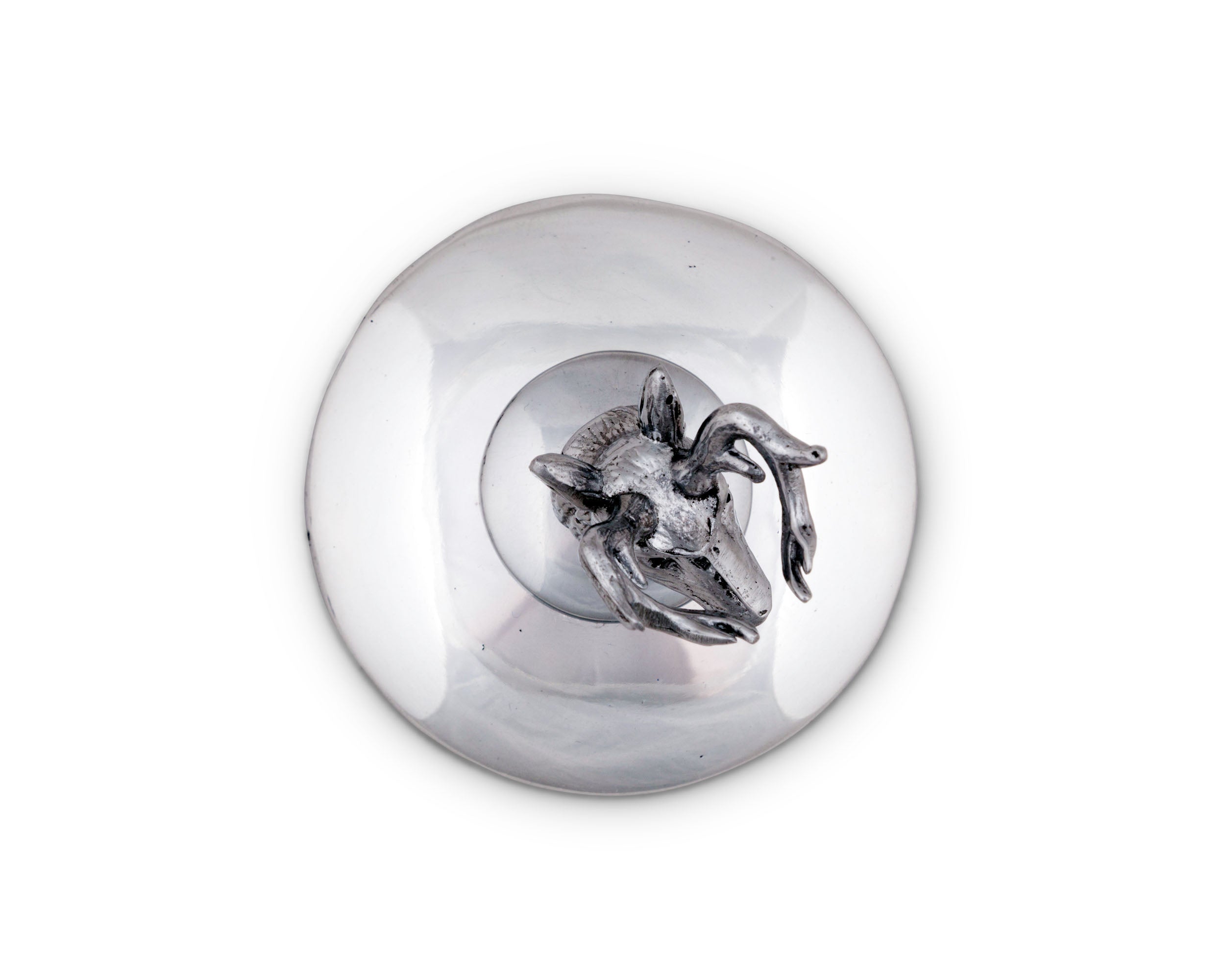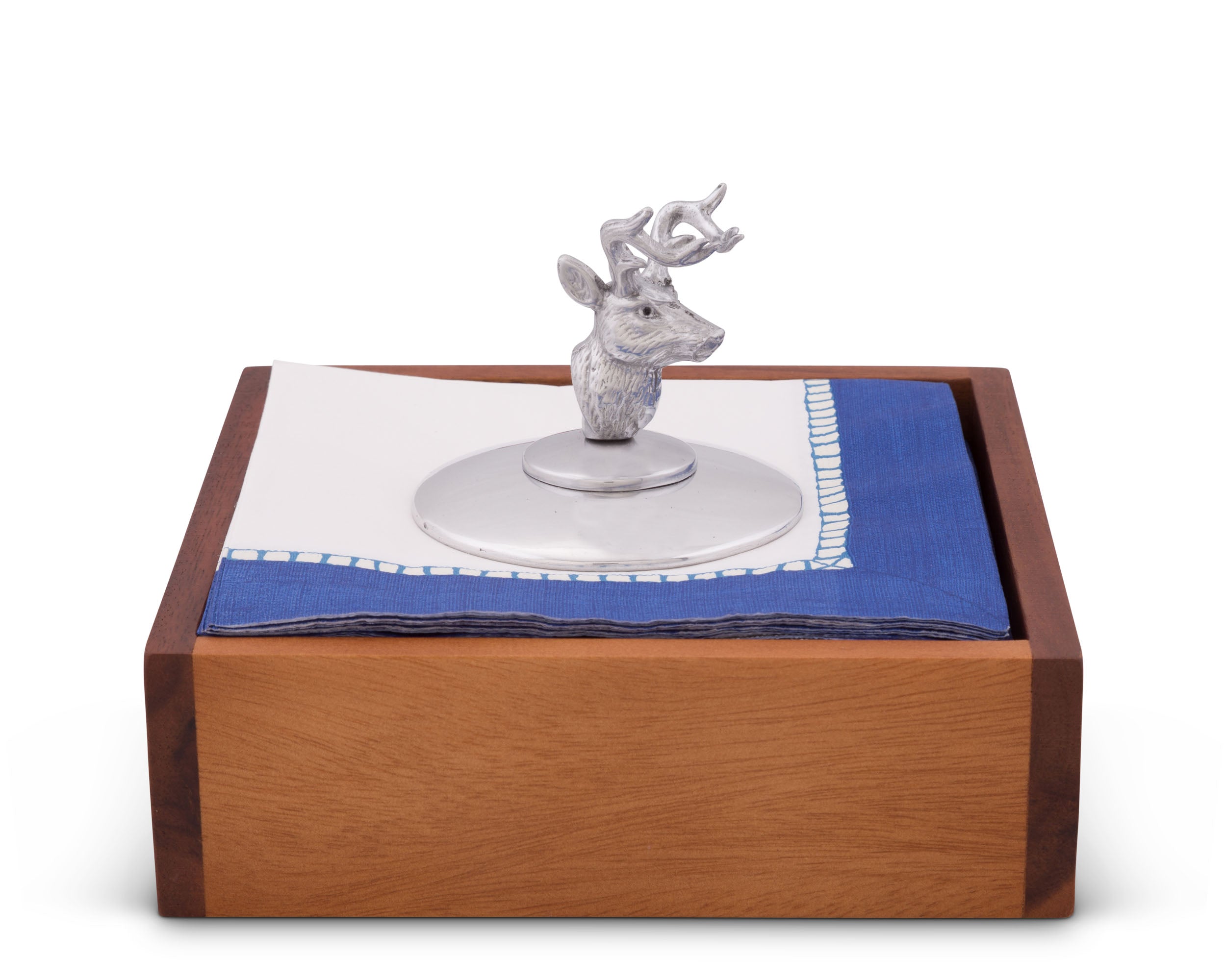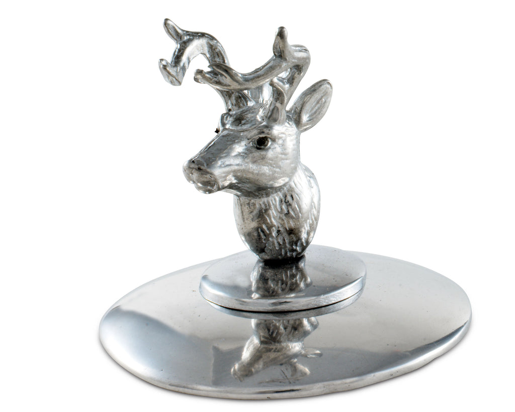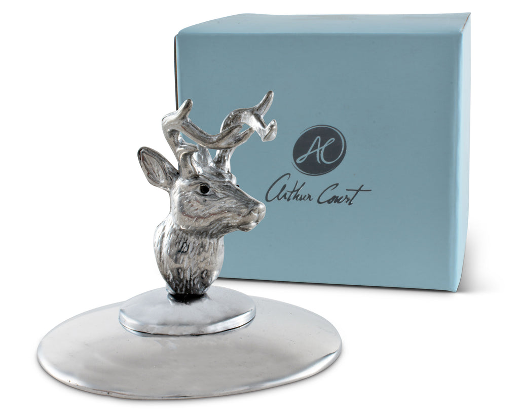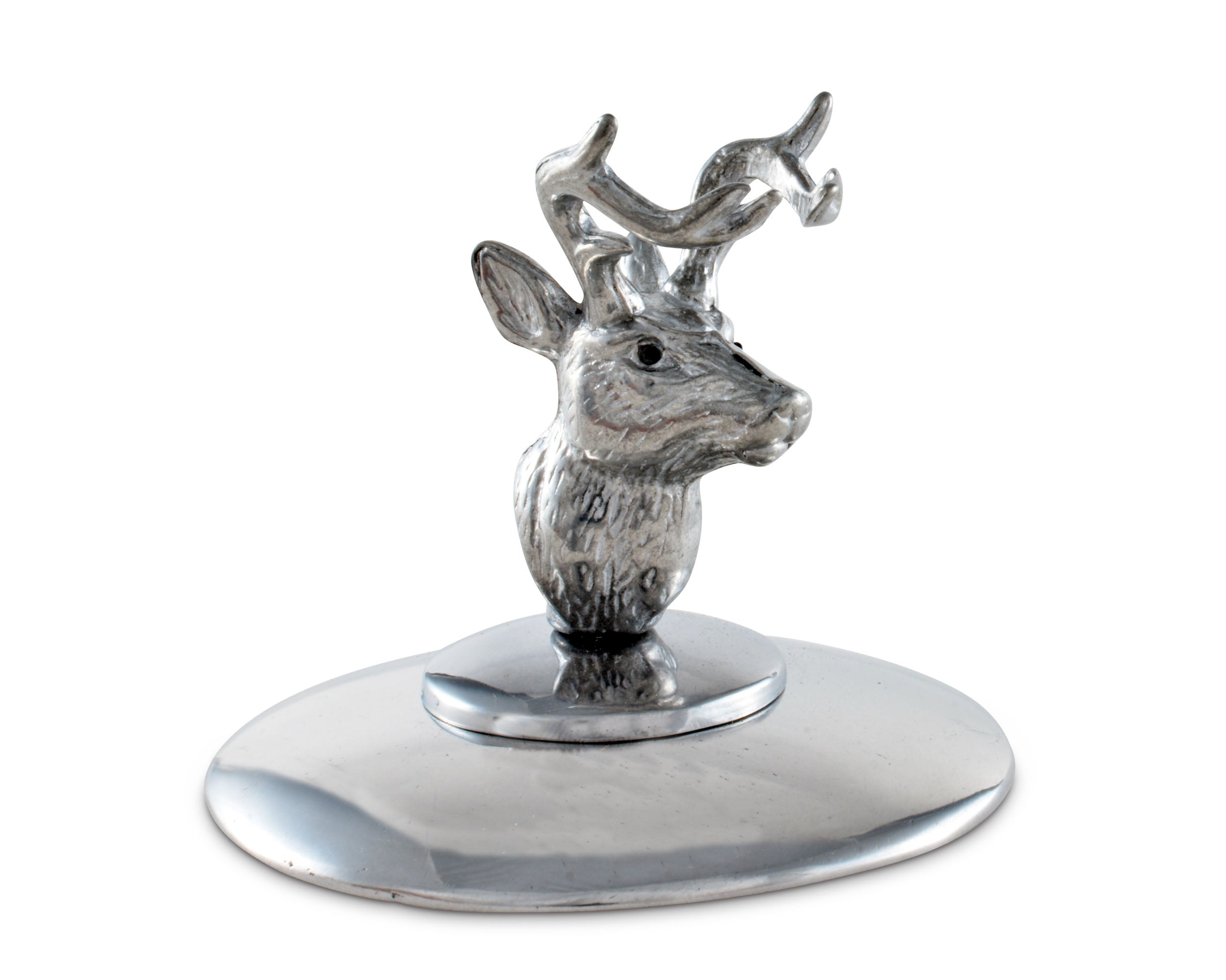A dignified and detailed bust of a stag with a full rack of antlers is the finial / handle on this hand-crafted, handsome wild life theme napkin weight. Anchored by a 3.5-inch aluminum disk to provide ample cover and weight to keep a stack of napkins orderly even at a breezy al fresco gathering.