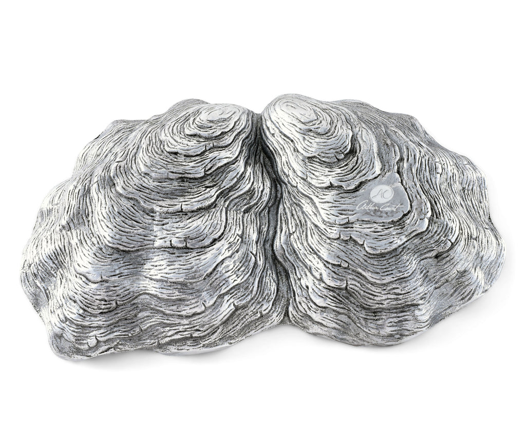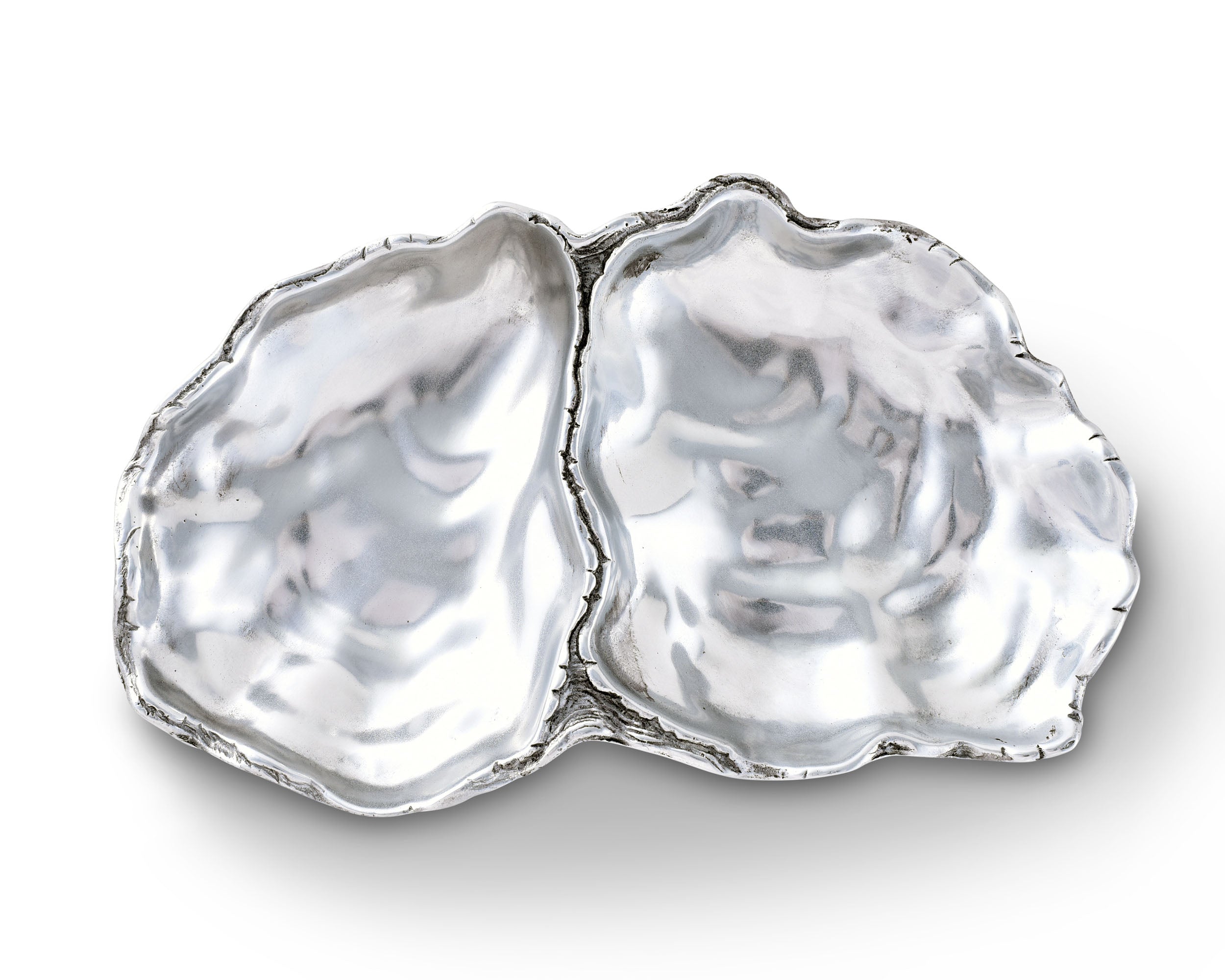 Arthur Court's sand-cast aluminum alloy is the perfect material for this Oyster shaped Catch-All Tray. The shiny luster of the tray mimics the inside of a real oyster to reflect the pretty objects you display on the tray or enhance the little treat tidbit