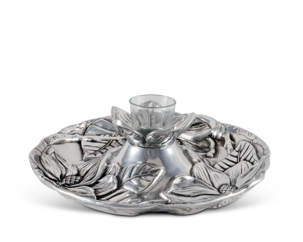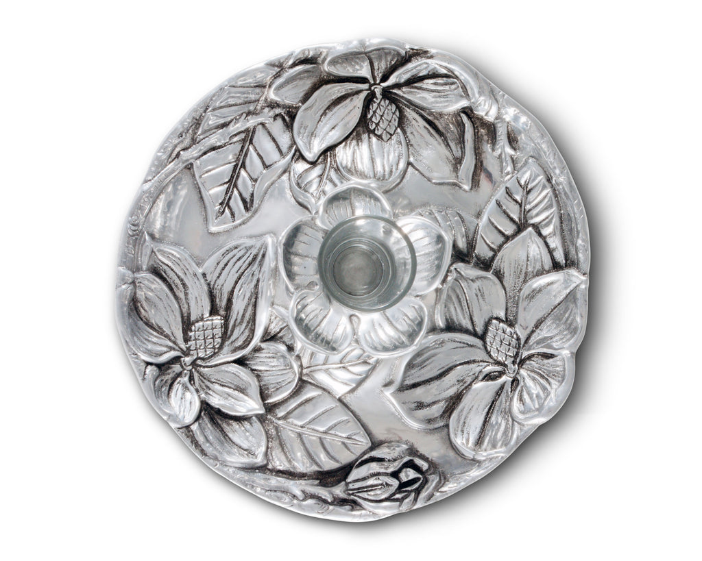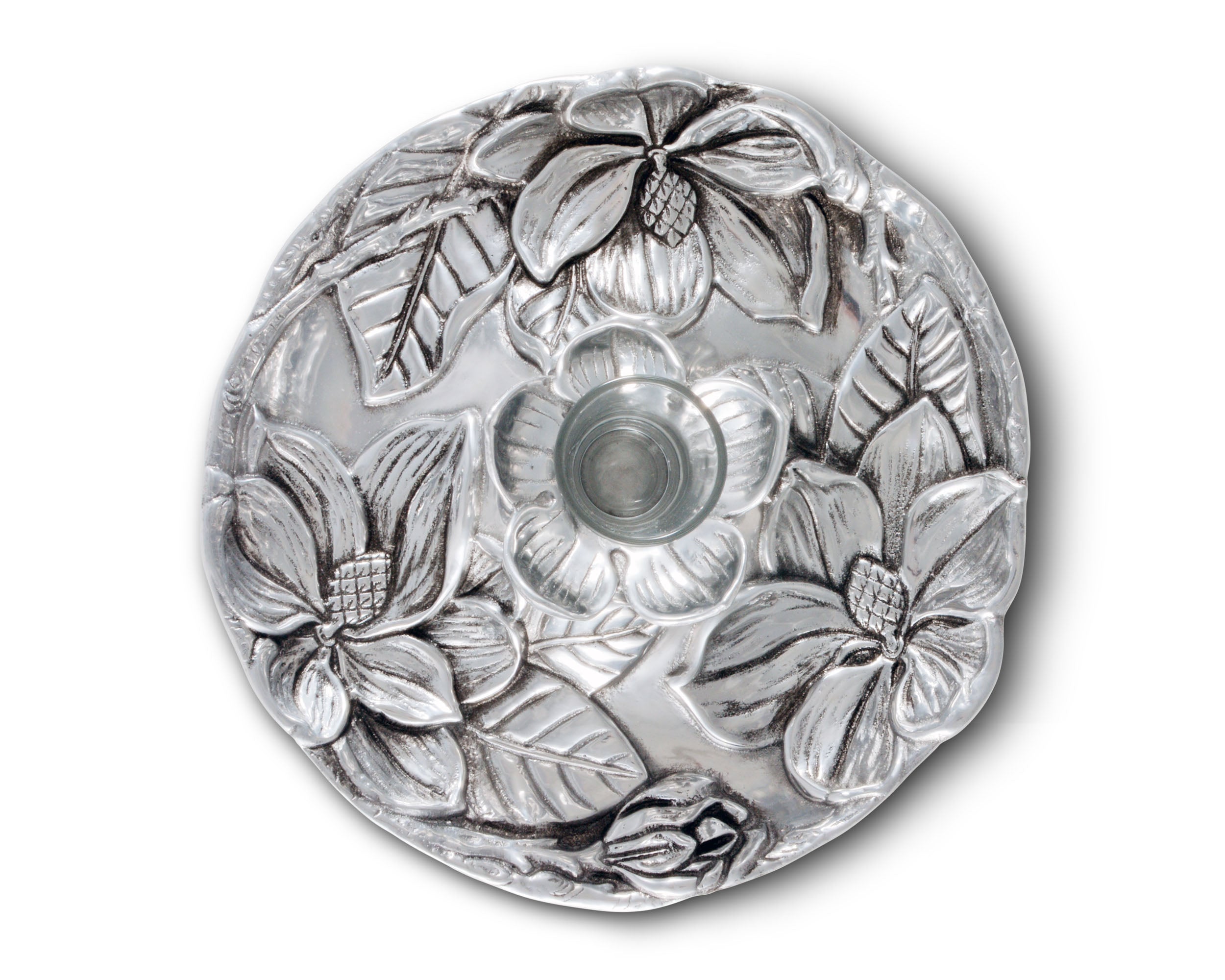 Round coupe tray with designed edges features a bas-relief design of marvelous magnolias and leaves. Known as the flower of the South in the United States, magnolias are known as a symbol of hospitality, purity and honor around the world. Featuring a raised votive-sized glass holder emerging from a center bloom, this tray is a stunning way to serve an assortment of crudités, nuts, olives or any tidbit collection. The glass holder in the middle will hold picks, hors d'oeuvres forks or even a tealight candle.