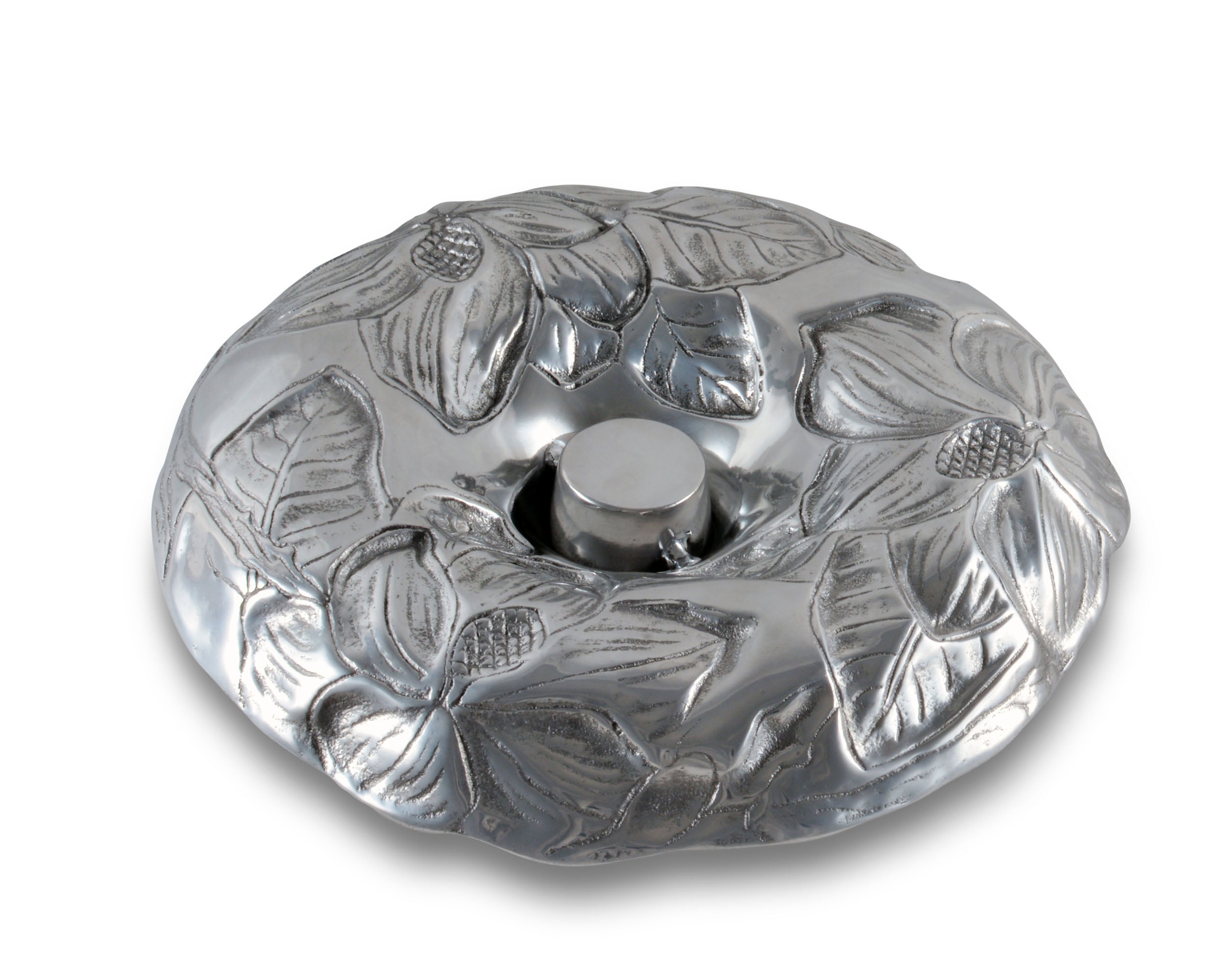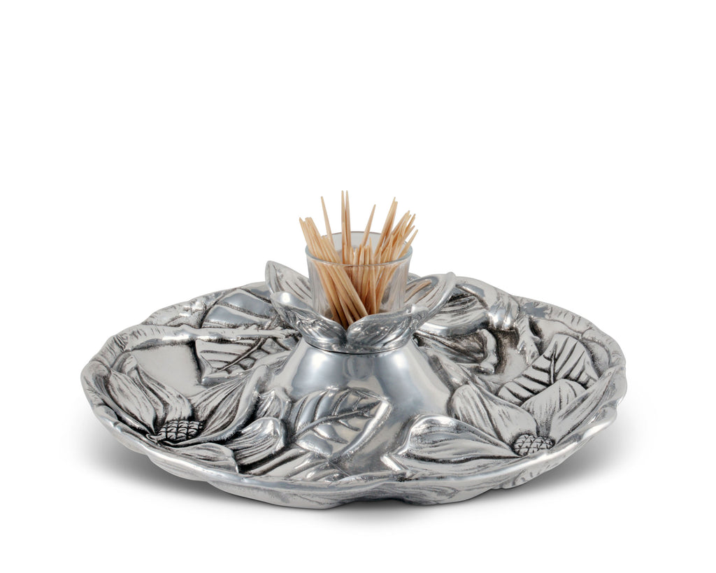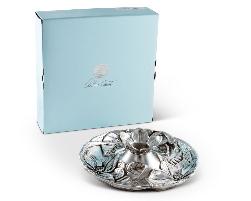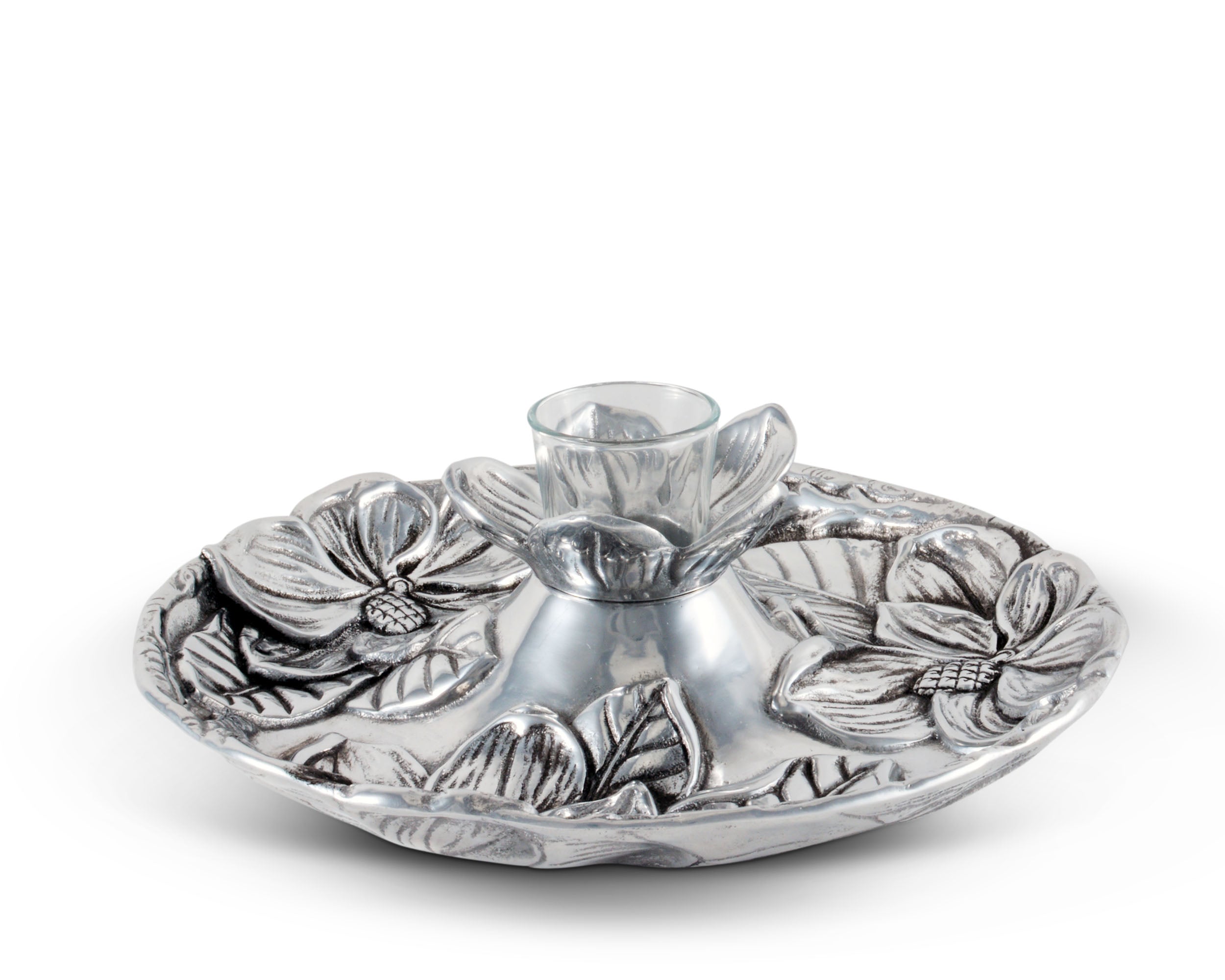Round coupe tray with designed edges features a bas-relief design of marvelous magnolias and leaves. Known as the flower of the South in the United States, magnolias are known as a symbol of hospitality, purity and honor around the world. Featuring a raised votive-sized glass holder emerging from a center bloom, this tray is a stunning way to serve an assortment of crudités, nuts, olives or any tidbit collection. The glass holder in the middle will hold picks, hors d'oeuvres forks or even a tealight candle.