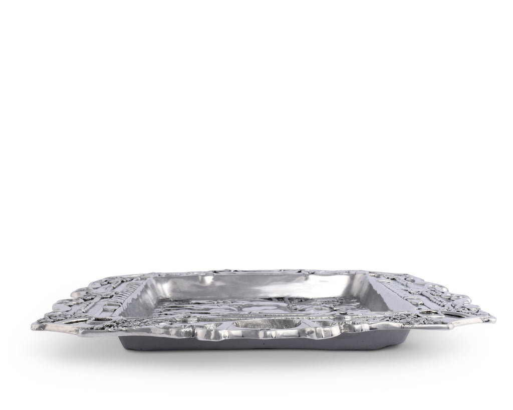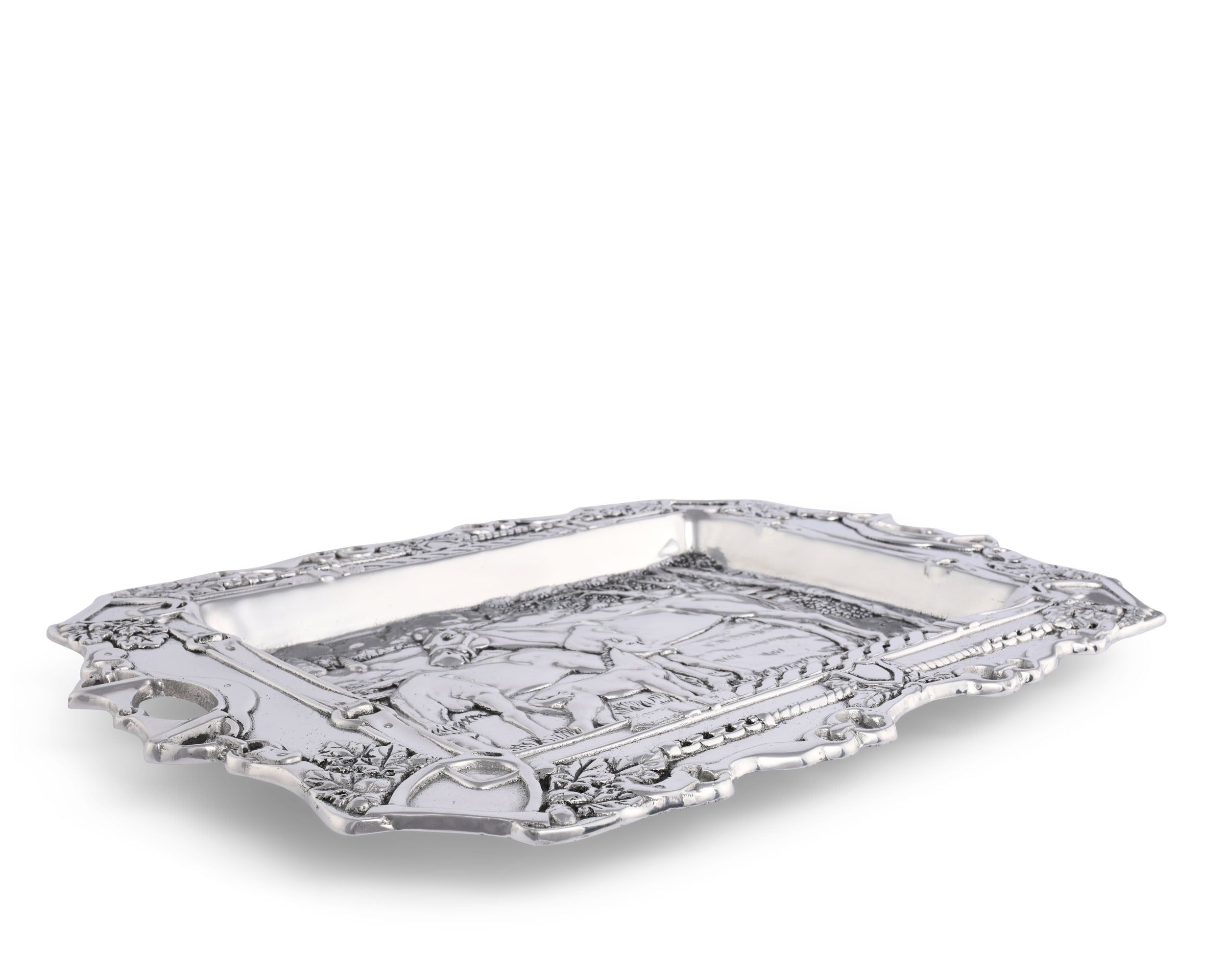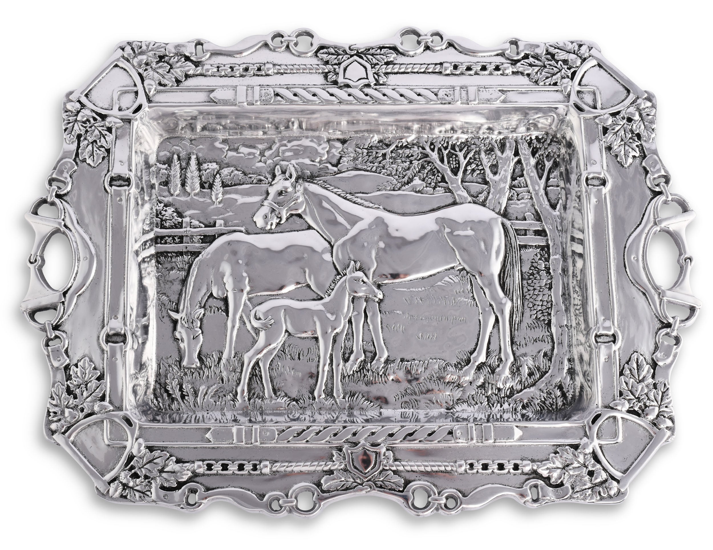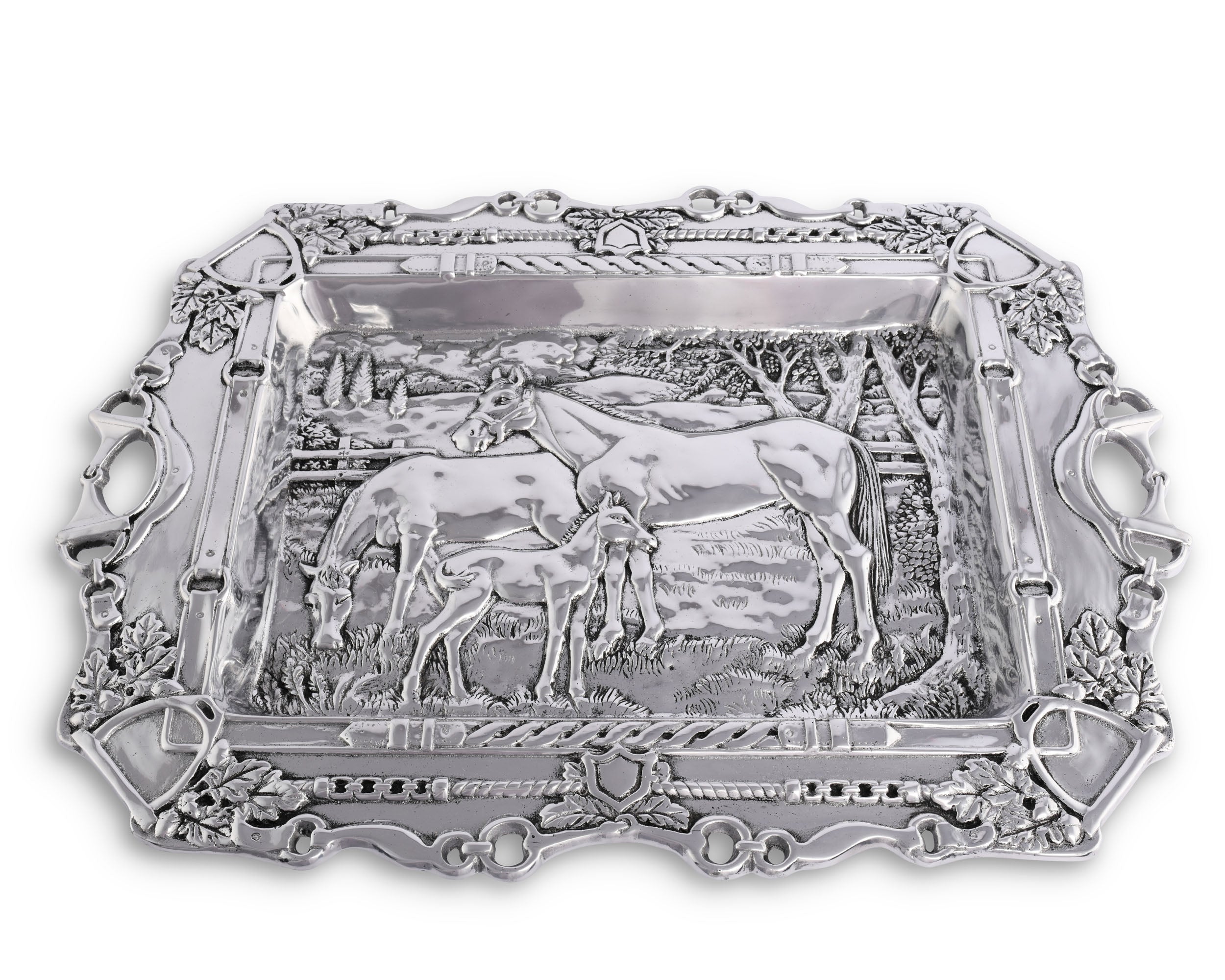Bring a peaceful, easy feeling to your home and table with Arthur Court’s intricately designed, pastoral, equestrian themed Grazing Horses Parlor Tray. This unique tray is an artwork in metal that enchants as every charming detail is discovered. The tray center is a pastoral scene of an equine family grazing, with a background of rolling hills, detailed trees, grasses, bushes and paddock fencing. An exquisite border frames the scene, everyday equestrian items, stirrup irons, snaffle bits, O-rings and braided leathers along with small sprays of acorns and oak leaves. The handles are D-ring snaffle bits, O-ring bits are worked along the realistic boarder.