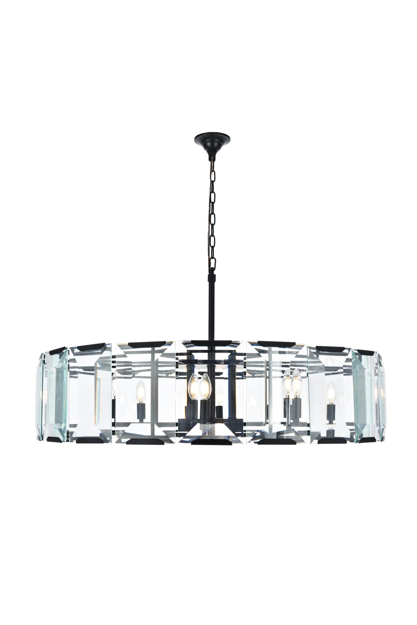 Dimensions Chain/Rod Length: 120" Length: 43" Width: 43" Height: 12" Maximum Height: 72" Wire Length: 141.73" Specifications Product Type: Chandeliers Hanging Device: Chain Voltage: 110V - 125V Dimmable: Yes Socket Type: E12 Number of Lights: 10 Wattage/Bulb: 40 Max/Nominal Watt: 400 Crystal/Glass Color: clear Yes Bulb Shape: B10 Harware Material: Steel Fixture Material: Steel and Glass Product Shape: Chandeliers Assembly Required: YES Hardware Finish: Flat Black (Matte) Bulb Included: No Weight: 73 Product Warranty: 1 year limited Shipment type: Oversized Ground