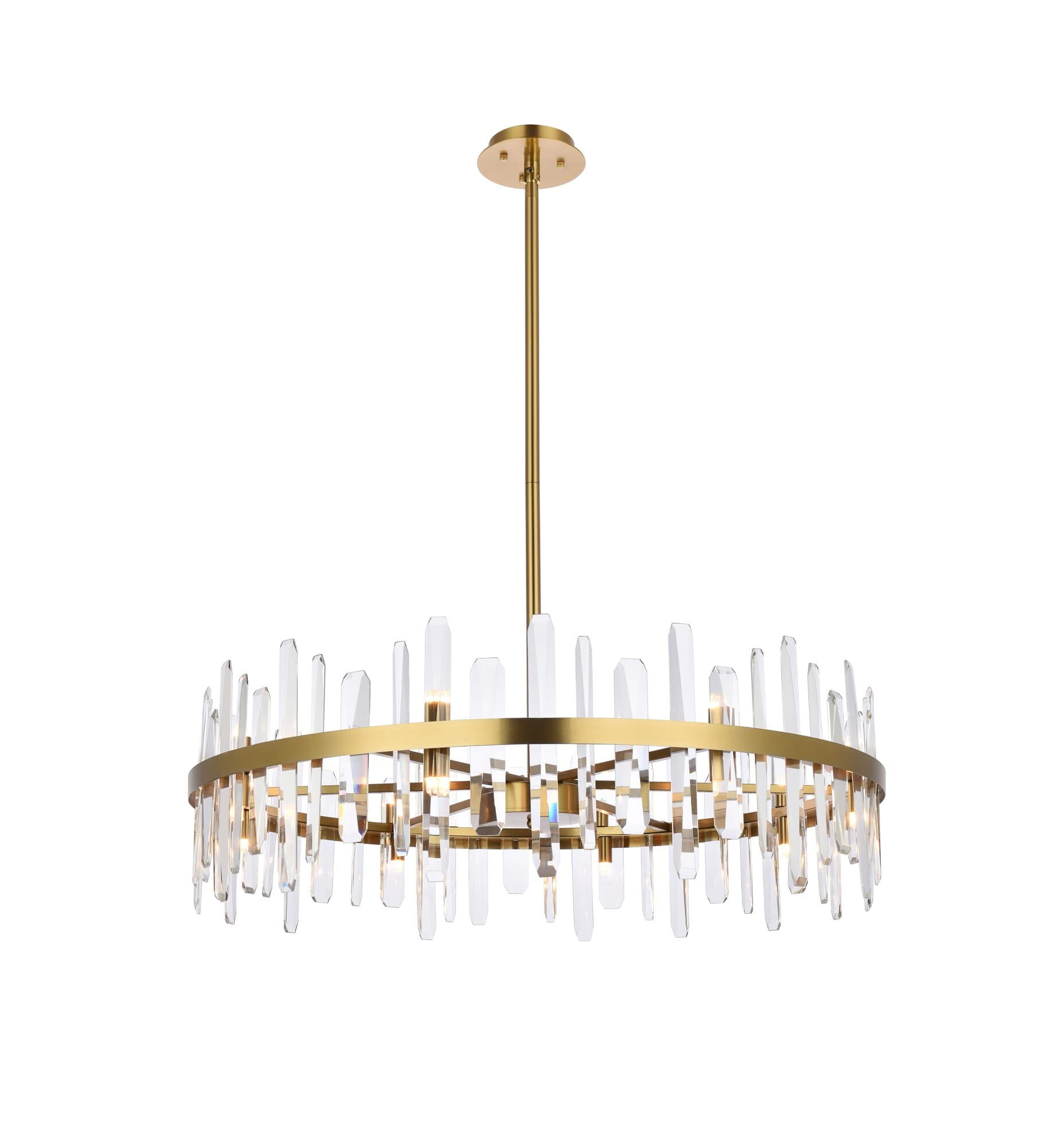 Dimensions Chain/Rod Length: 46" Length: 36" Width: 36" Height: 12" Maximum Height: 57.5" Wire Length: 75" Specifications Product Type: Chandeliers Hanging Device: Rod Voltage: 110V - 125V Dimmable: Yes Socket Type: G9 Number of Lights: 16 Wattage/Bulb: 20W Max/Nominal Watt: 320W Crystal/Glass Color: Clear Wire Included: Yes ETL: Yes Harware Material: Iron Fixture Material: Iron and Crystal Product Shape: Round Assembly Required: Yes Distressed Finish: No Hardware Finish: Satin Gold Bulb Included: No Dry/Wet/Damp: Dry Weight: 26 Product Warranty: 1 year limited Shipment type: Oversized Ground