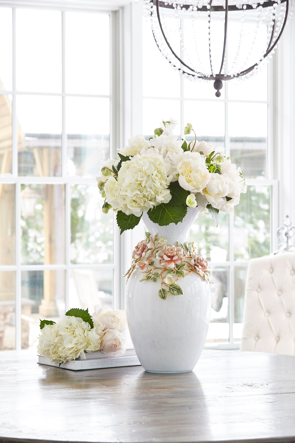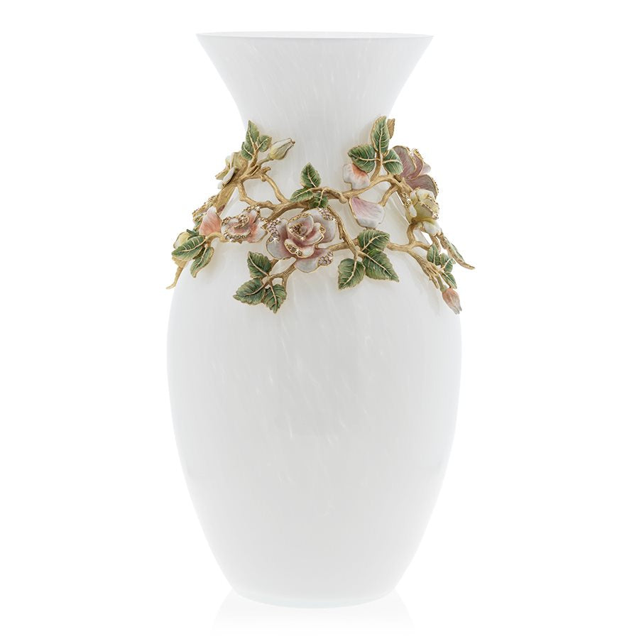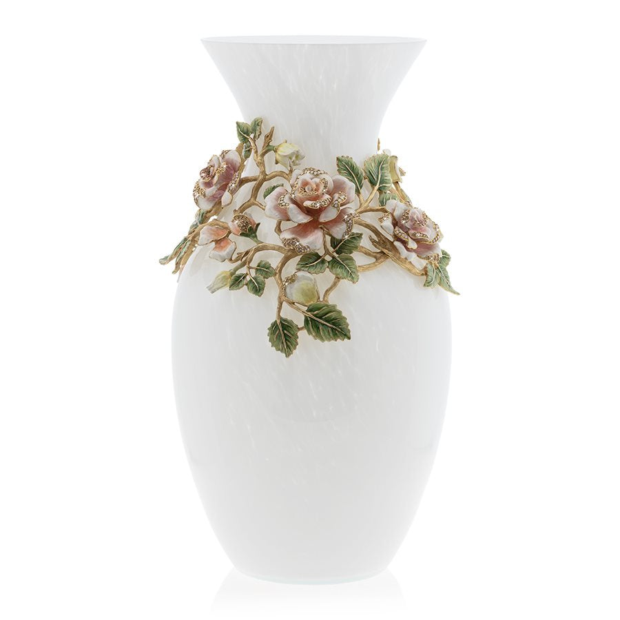 Jay's artistry shines with an abundance of lush jeweled roses fully blooming on enameled vines wrapping around the Gabrielle grand glass vase. A profusion of pale pink, peach and golden white roses have been hand-painted in layers of translucent enamel. Sparkling with rose, silk and opal shaded Swarovski crystals hand-set by Jay's finest artisans in Rhode Island. A major statement on its own or equally elegant when filled with flowers.